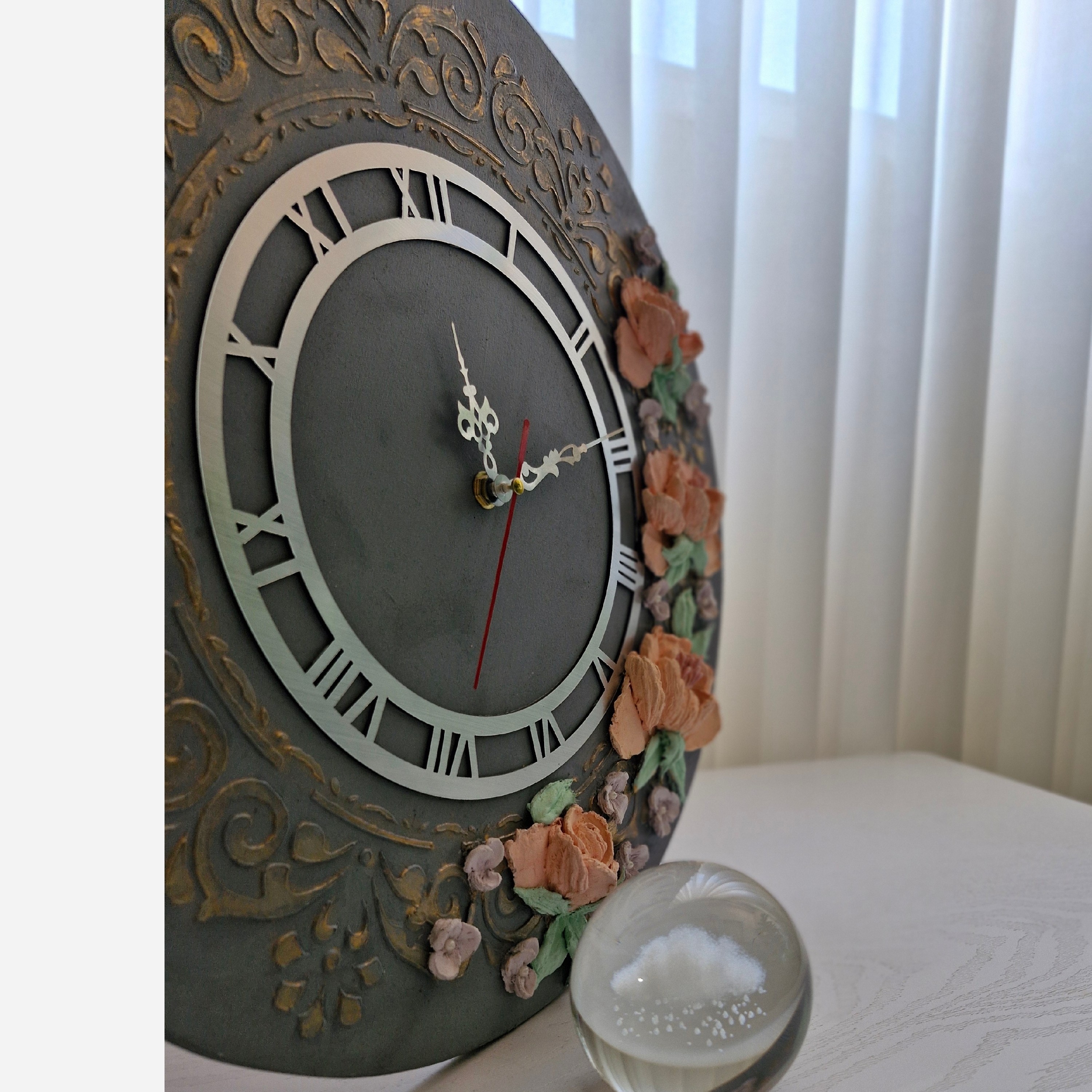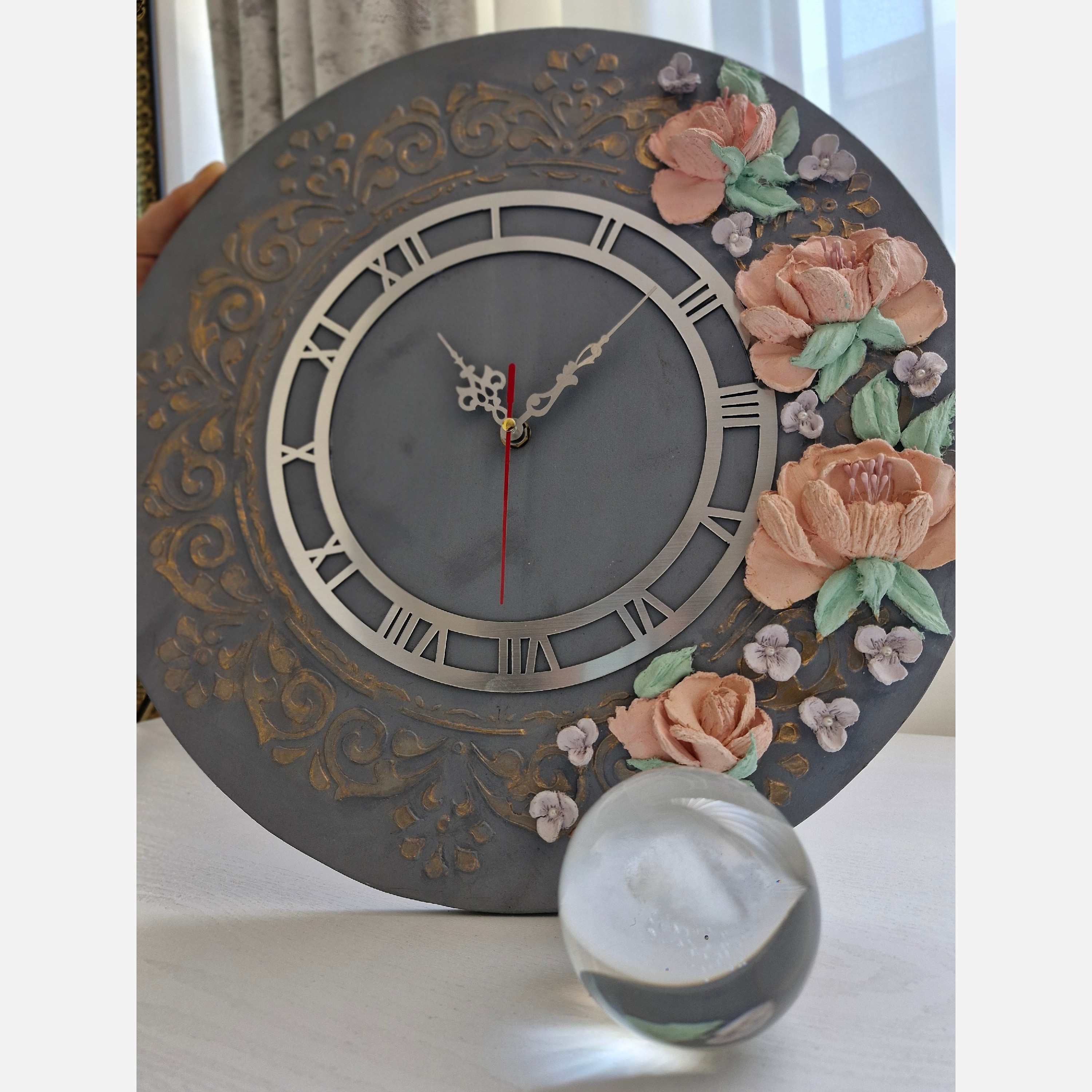 ساعت چوبی استاکو پتینه کاری شده جنس ساعت چوبی باتزیین گل دست سازاستاکوروسی موتورارام گرد عقربه فلزی رنگ طوسی طلایی باگل گلبهی رنگ
