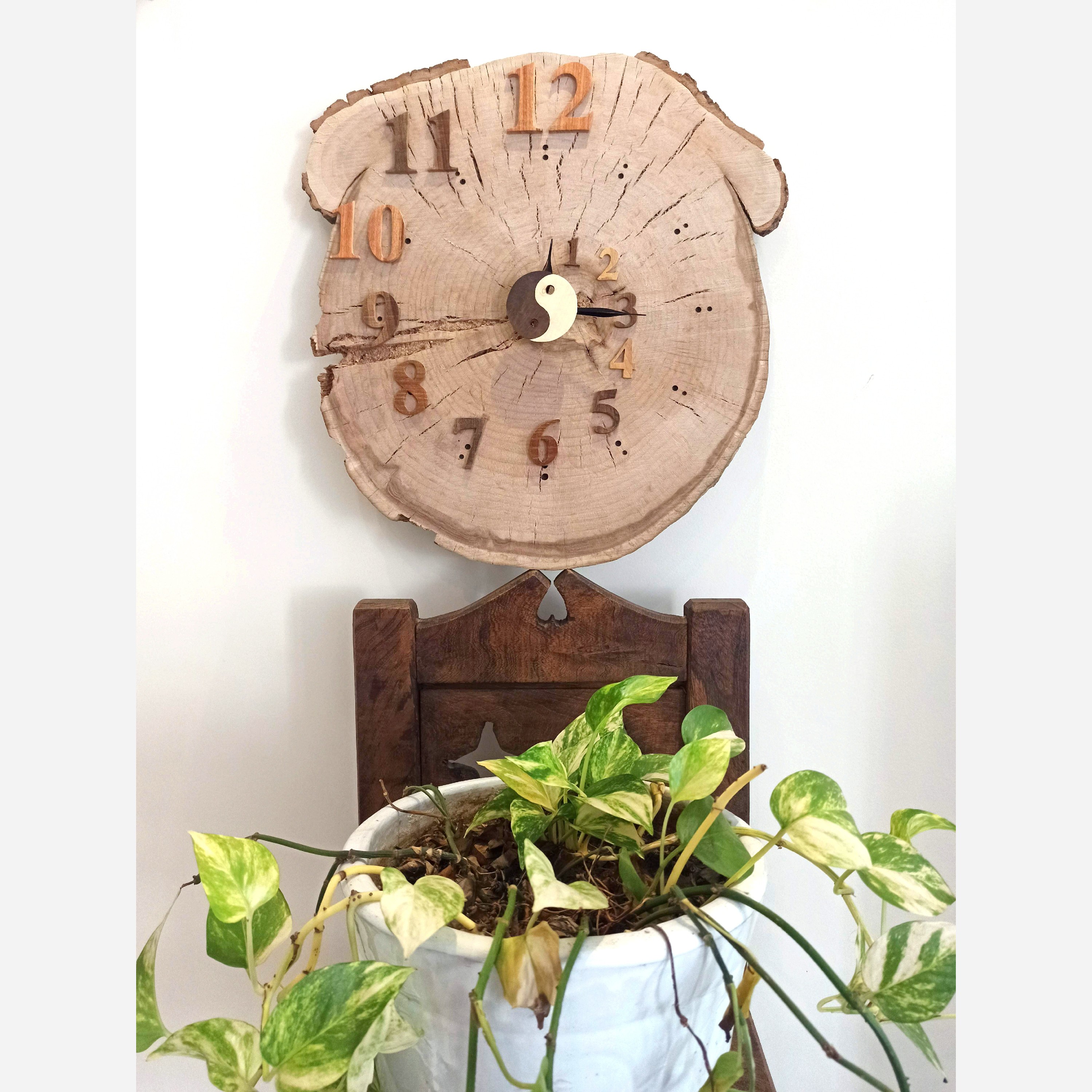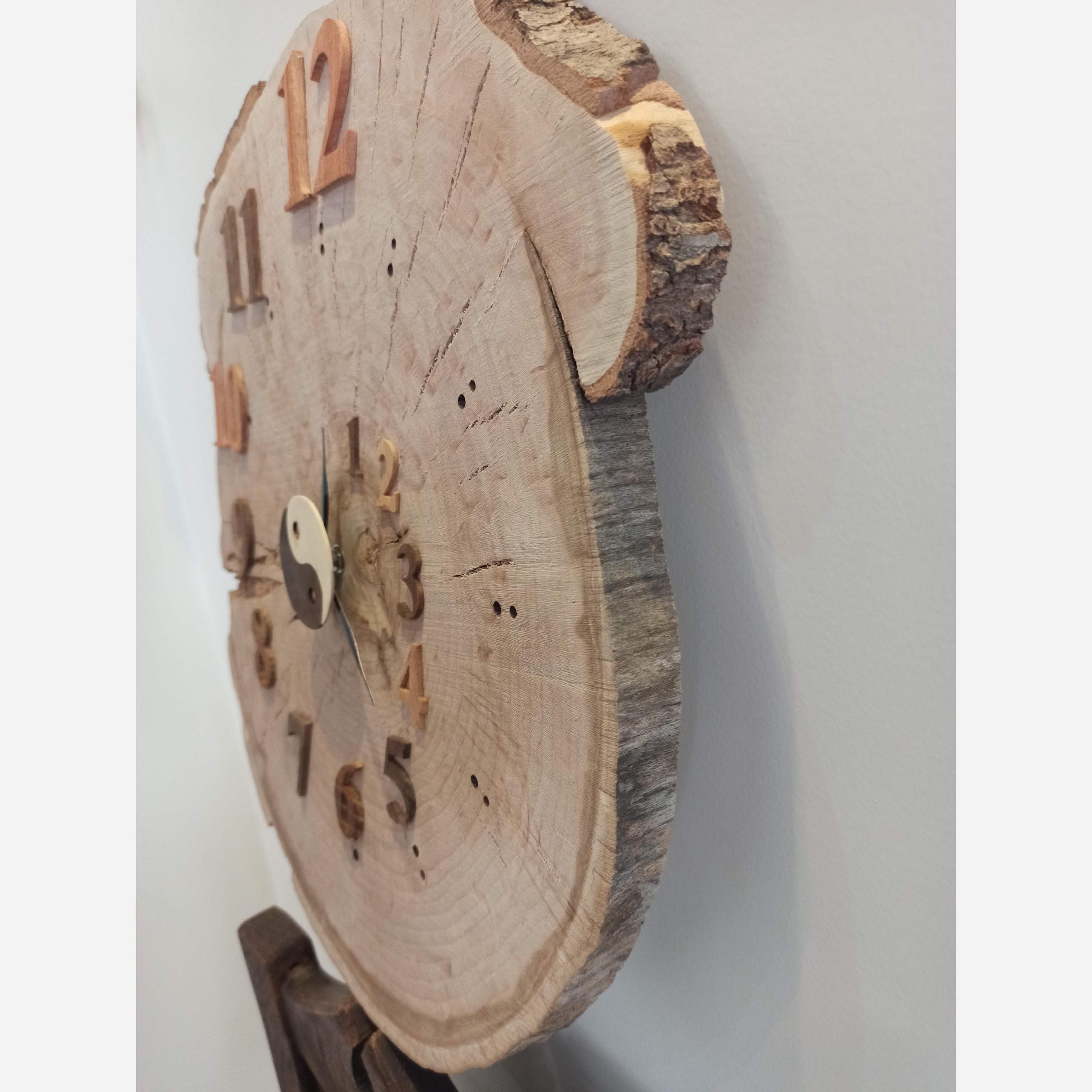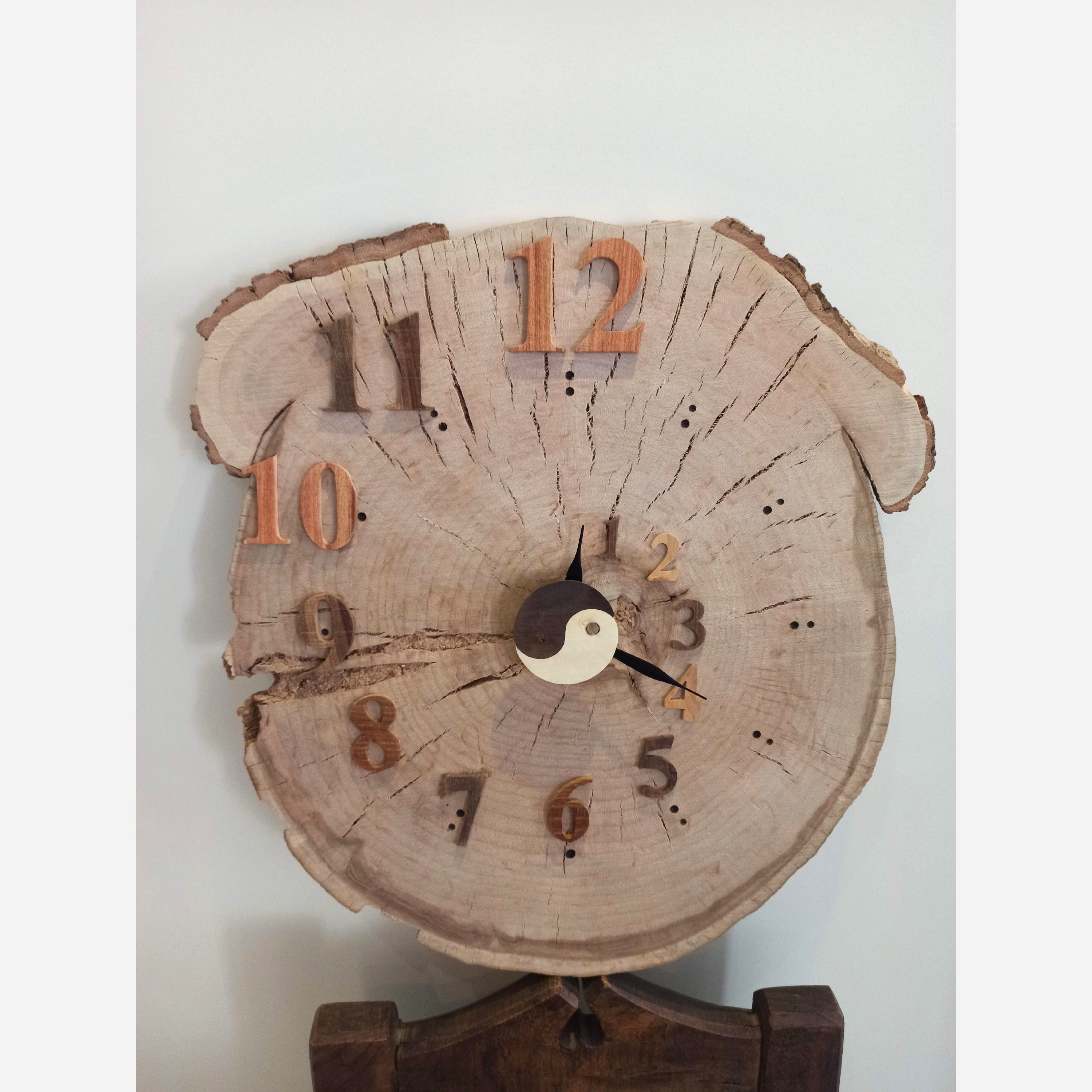 ساعت دیواری چوبی با تنه درخت چنار حدودا 50 ساله طرح فیبوناچی یین و یانگ به طور متحرکه دقیق تمام اعداد ساعت با چوبهای طبیعیه گردو ،عناب،توت،کرات و یین و یانگ با چوب افرا و گردو سوخته ساخته شده موتور به صورت آرام گرد بدونه صدا میباشد اندازه ساعت 46*41 سانتیمتر و قطر تنه 2 سانت میباشد هم دکوری و هم ساعت دیواری دست ساز سفارش هم پذیرفته میشه با طرح دلخواه شما اگه سوالی داشتید پاسخ گو هستم