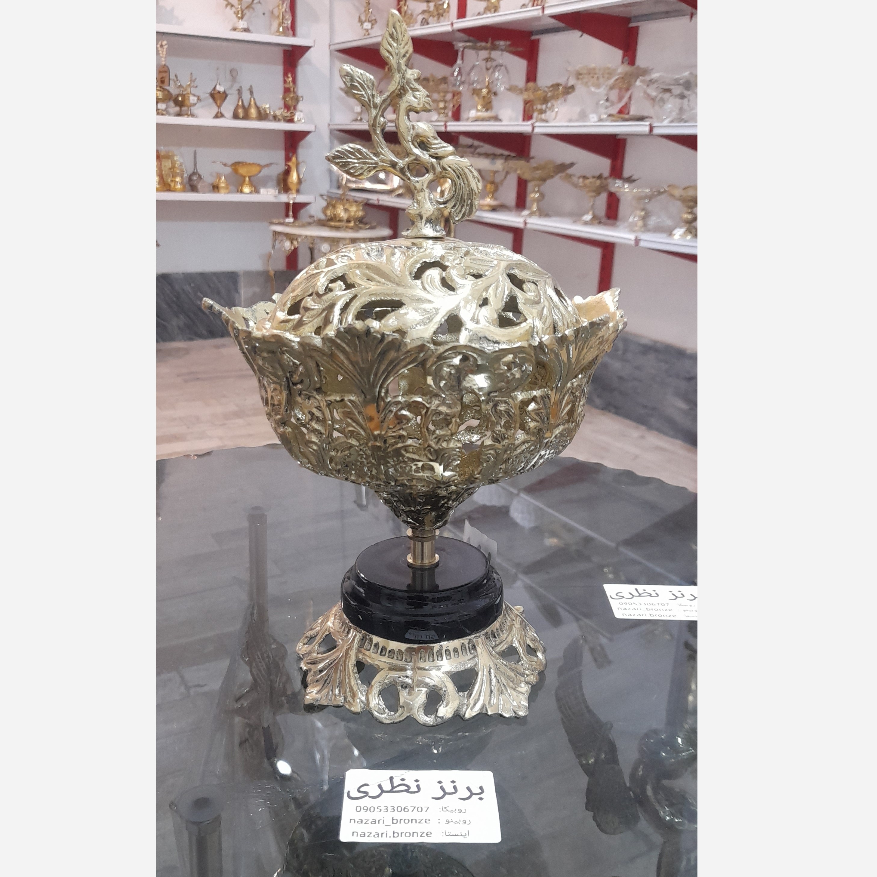 شکلاتخوری برنجی پایه سنگ طبیعی دربدار ارتفاع 30 سانت ضمانت اصالت برنج