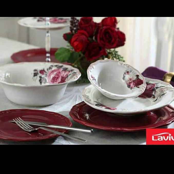 سرویس 28 پارچه ی چینی برند لاویوادساخت ترکیه شامل شش عدد بشقاب شش عدد پیشدستی شش عدد خرشت خوری وشش عدد پیاله ماست و یک ک مبلمونسرا مدل 289202