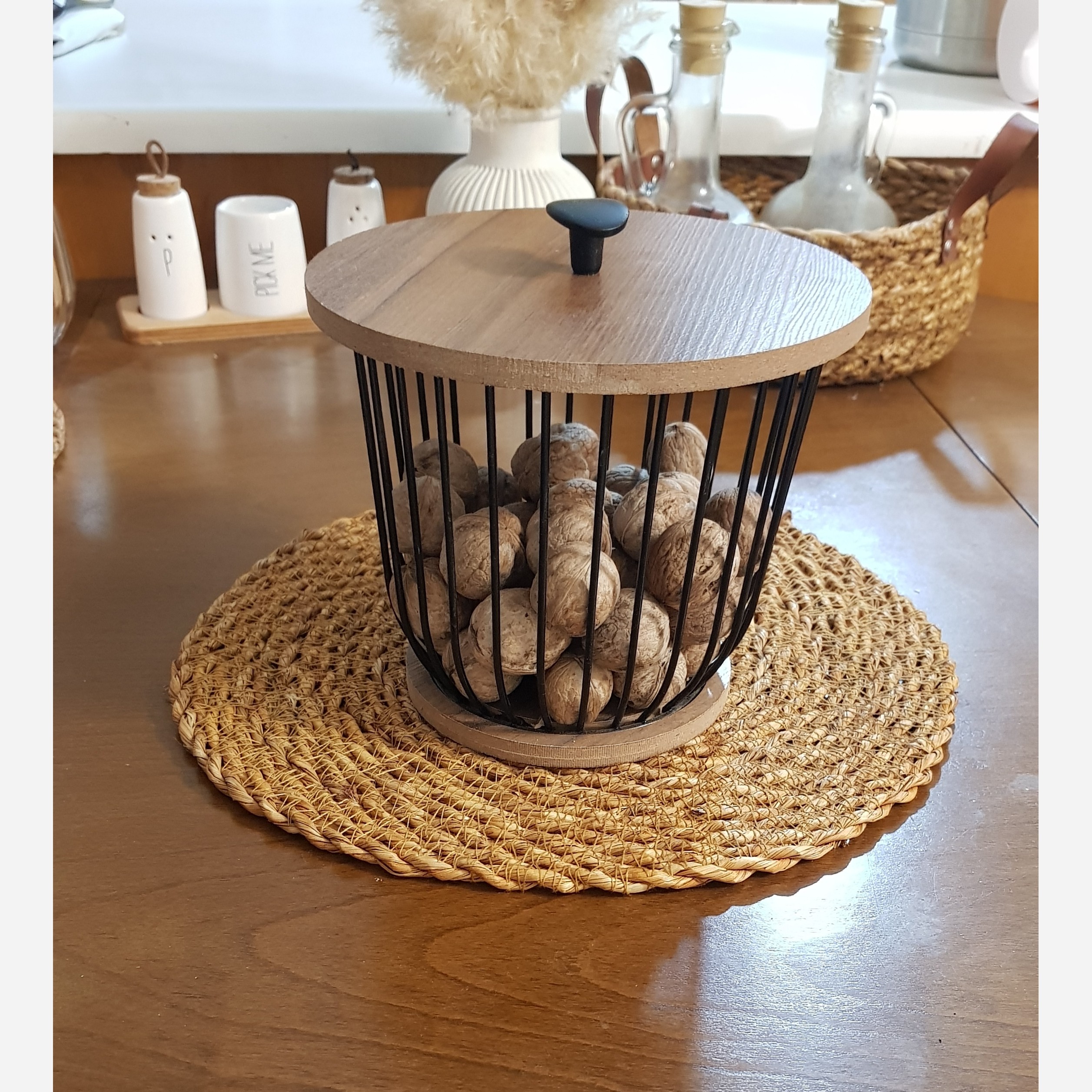 ظرف مناسب نگه داری👈 گردو .شکلات.بادام .تنقلات 🌱درب چوبی 🌱جنس بدنه فلزی 🌱رنگ کوره ای مشکی