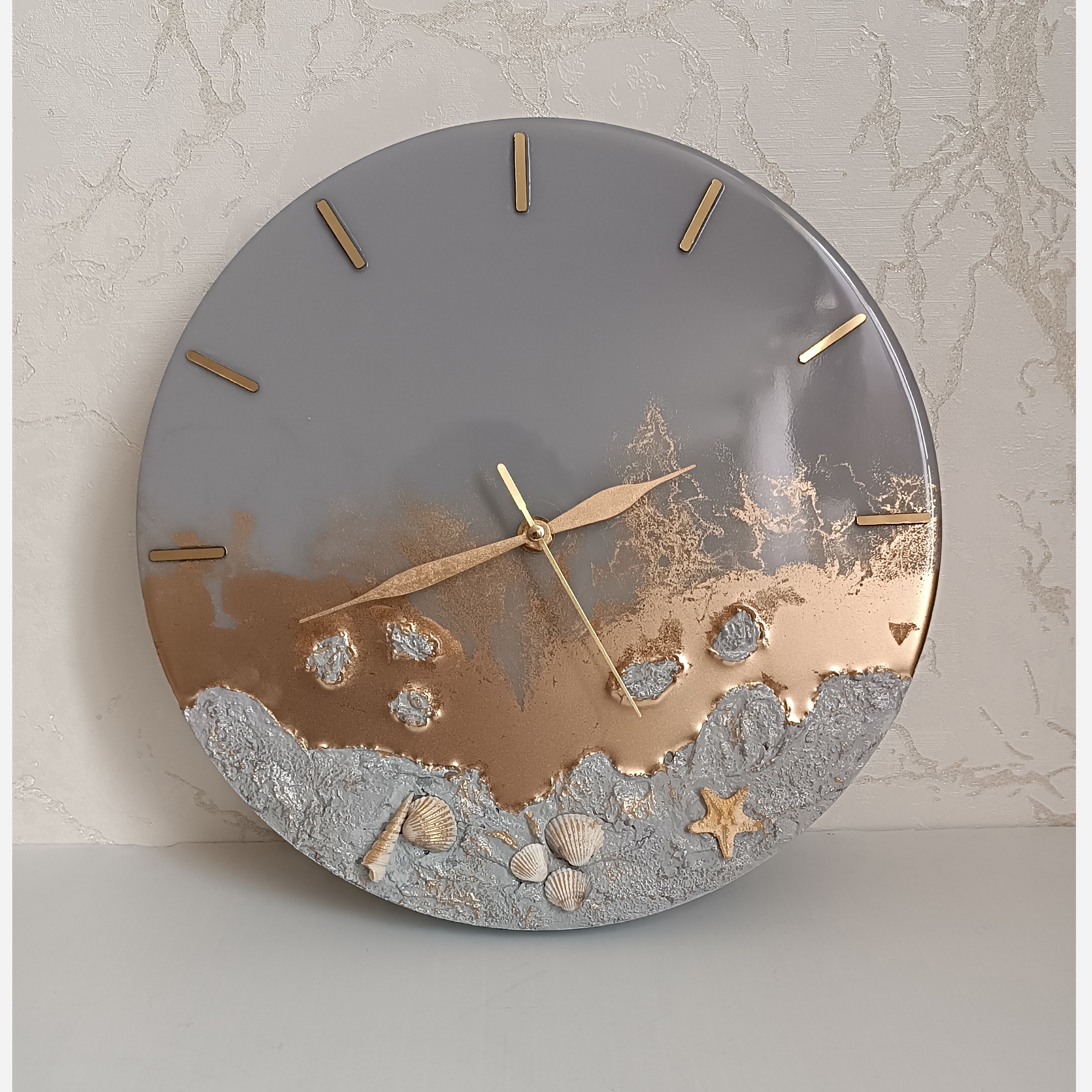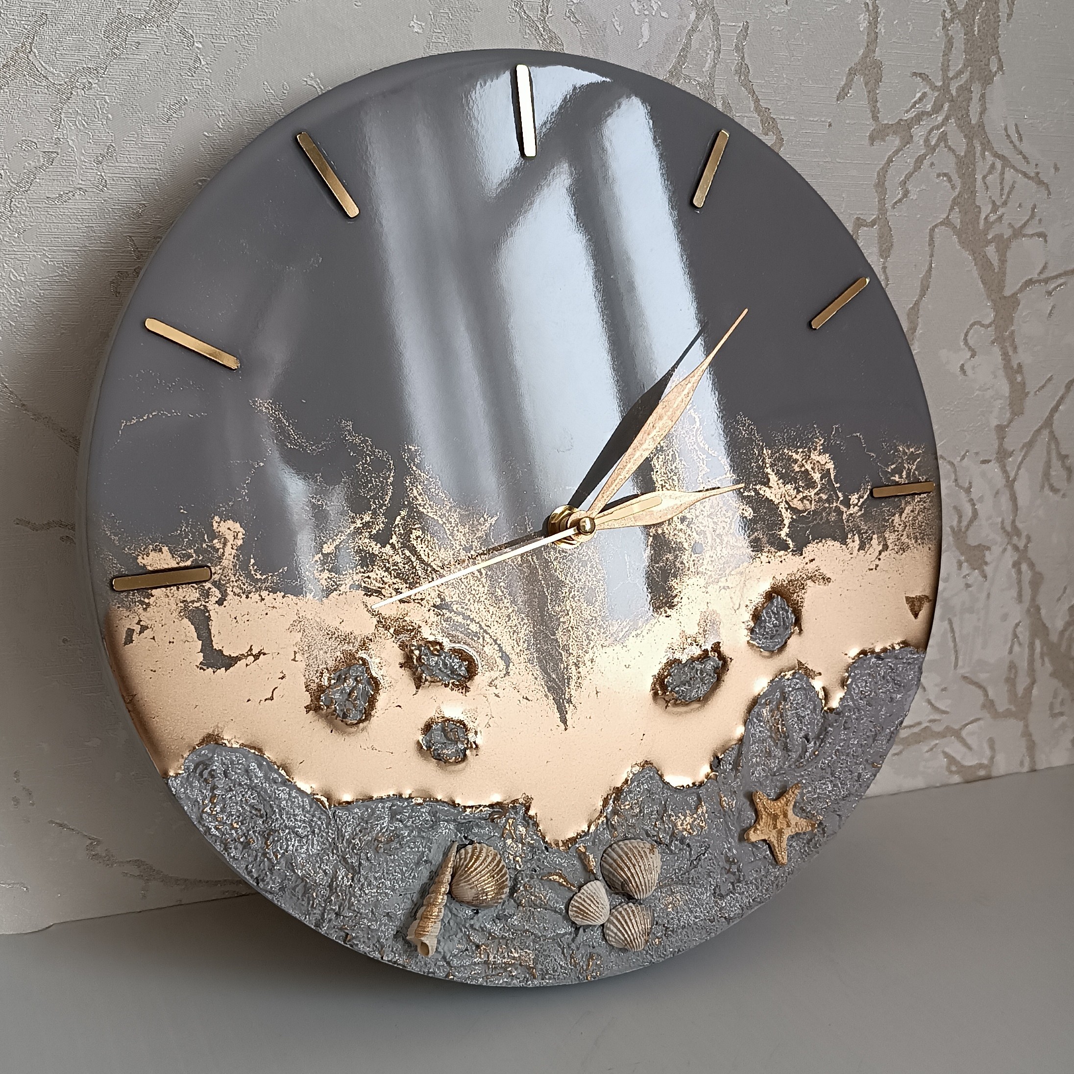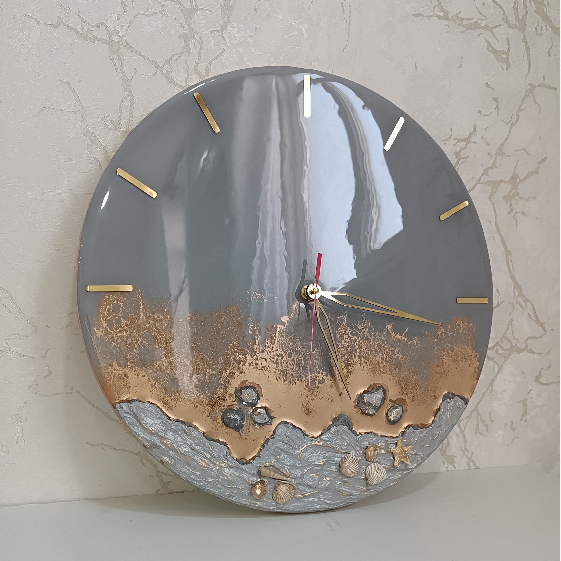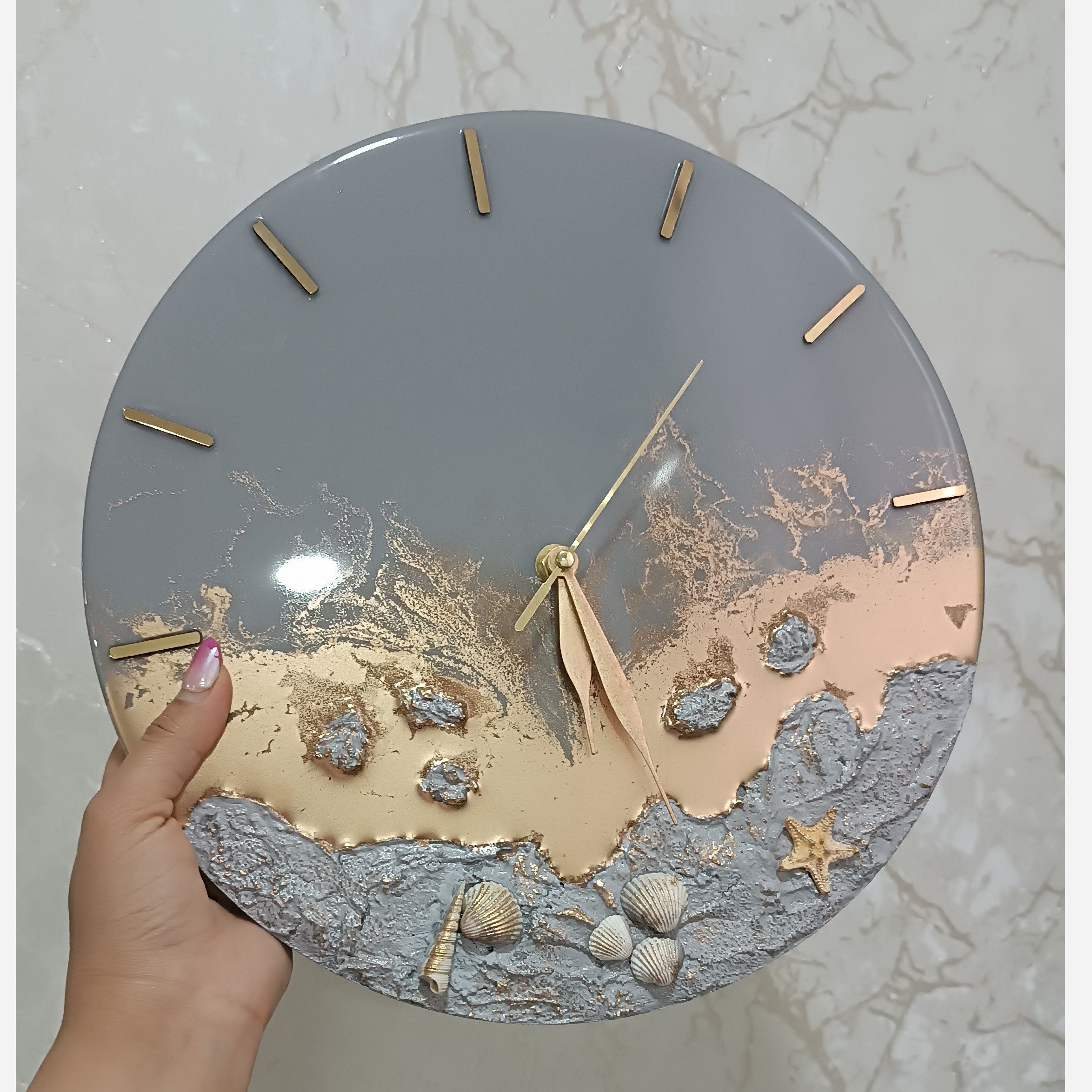 ساعت دیواری رزینی طرح دریا طوسی طلایی مبلمونسرا مدل 240472