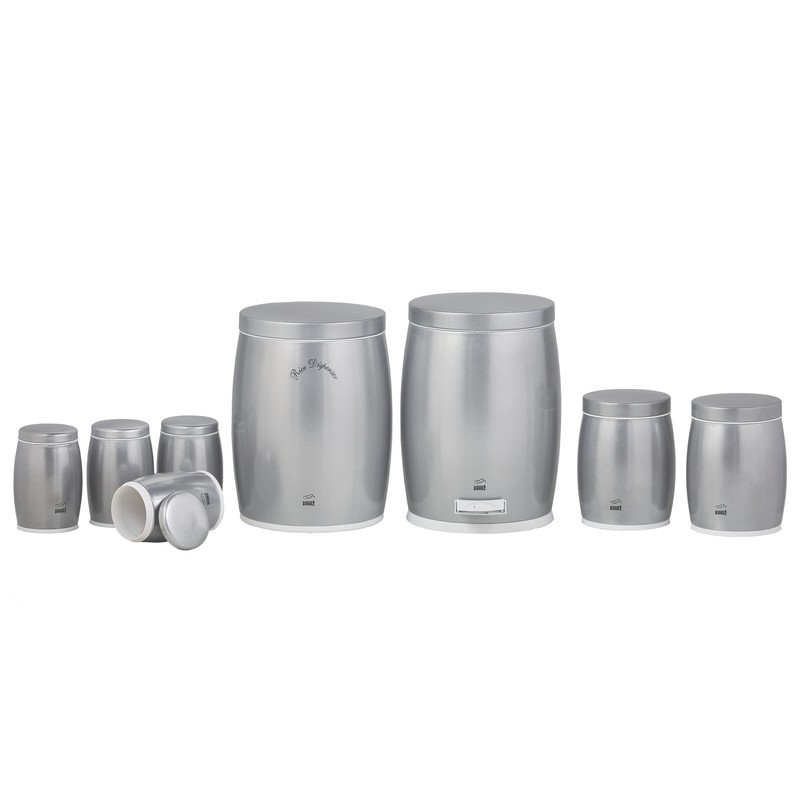 سرویس جهزیه 8 پارچه خمره ای بهاز کالا با درب کروم طراحی زیبا و متفاوت این محصول و فرم خمره ای بدنه جلوه منحصر بفردی به آن بخشیده است و زینت بخش هر آشپزخانه ای می باشد.محفظه داخلی سطل به گونه ایست که محتویات آن به دور از هرگونه آلودگی ، گرد و غبار و یا حشرات مختلف قابل نگهداری است.کلیه قطعات و اجزاء داخلی با مواد کاملا بهداشتی و مرغوب تولید گردیده است. سطل زباله این محصول محصولی مدرن با طراحی منحصر بفرد و زیبا ، مجهز به سیستم آرام بند جهت بسته شدن درب بدون تولید صدا ، مناسب برای استفاده در محیط های مختلفی چون آشپزخانه، فضای اداری ، مراکز تجاری ، تفریحی ، بیمارستان ها و سایر مکان های عمومی. عدم تولید صدای اضافی به هنگام کارکرد و برخورداری از ظرفیت مناسب، از ویژگی های متمایز این محصول به شمار می رود. مواد و قطعات مورد استفاده از کیفیت بالایی برخوردار بوده و نشان CE بر روی محصولات درج می گردد. شامل: سطل زباله، بانکه جنس: فلز مشخصات-تعداد: 8 قلم مشخصات-شامل: سطل زباله ، بانکه مشخصات-جنس: فلز مشخصات-ابعاد بستهبندی: 41x30x30 سانتیمتر مشخصات-وزن بستهبندی: 5200 گرم مشخصات-سایر توضیحات: سرویس جهیزیه 8 پارچه خمره ای بهاز کالا - دارای ظرف برنج با ابعاد: 41 × 30 × 30 سانتیمتر و وزن: 2585 گرم ظرف برنج 10 کیلویی - دارای سطل زباله پدالی با ابعاد: 40.5 × 30 × 35 سانتیمتر و وزن: 2860 گرم زباله 14 لیتری مجهز به ارامبند - دارای 4 عدد بانکه حبوبات سایز 1 با ابعاد: 19.5 × 13 × 13 سانتیمتر و وزن: 235 گرم -بانکه قند و شکر سایز 2 با ابعاد:24.5 × 18 × 18 سانتیمتر و وزن: 715 گرم