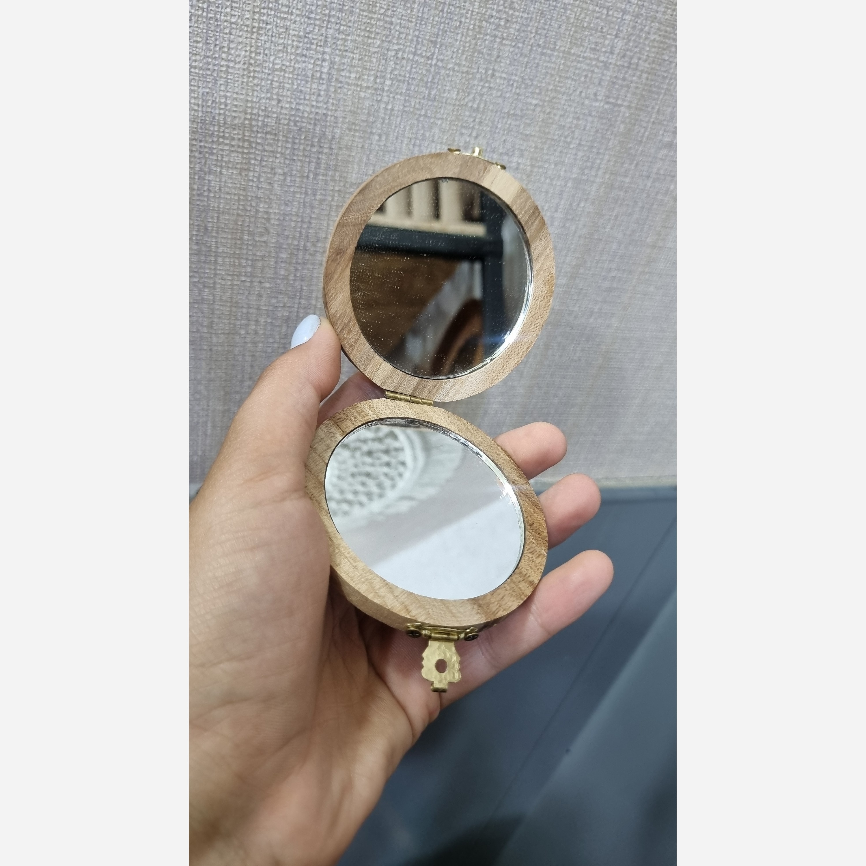 آینه جیبی چوبی جنس چوب گردو نقاشی شده کار دست پوشش روغن ضد آب