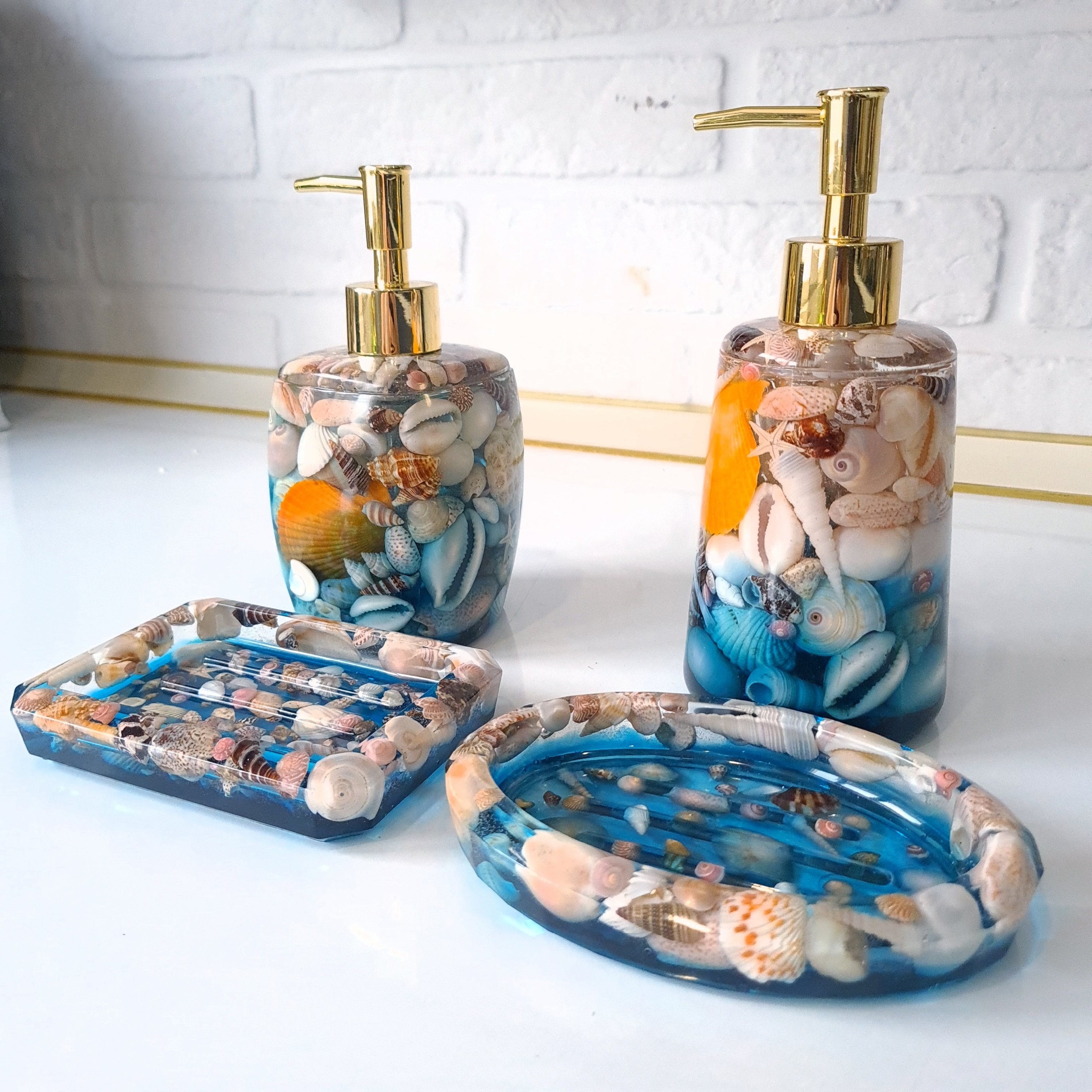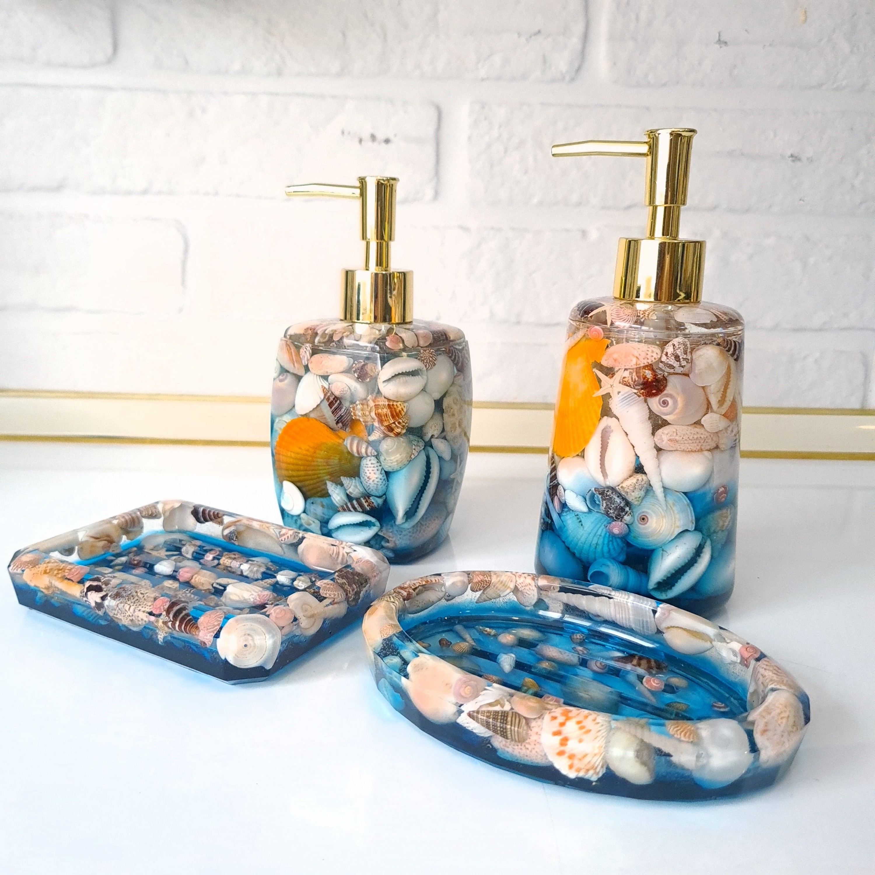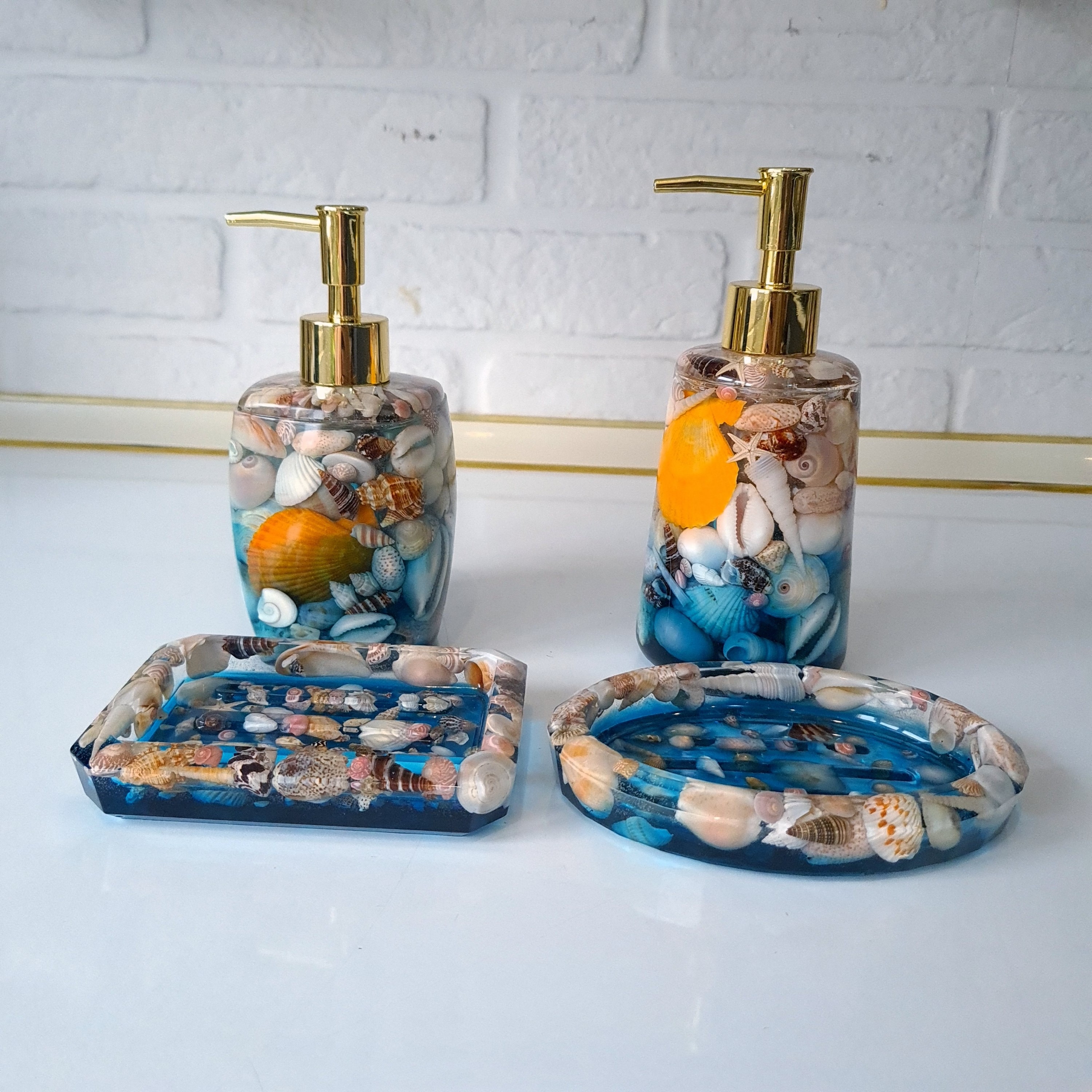 ست جا مایع و صابونی رزینی طرح صدفی ساخته شده از رزین شفاف و صدف های کاملا طبیعی قابل سفارش در رنگ های دلخواه پمپ قابل تعویض در دو رنگ نقره ای و طلایی استوانه 160 cc مستطیل 180 cc مربع 100 cc