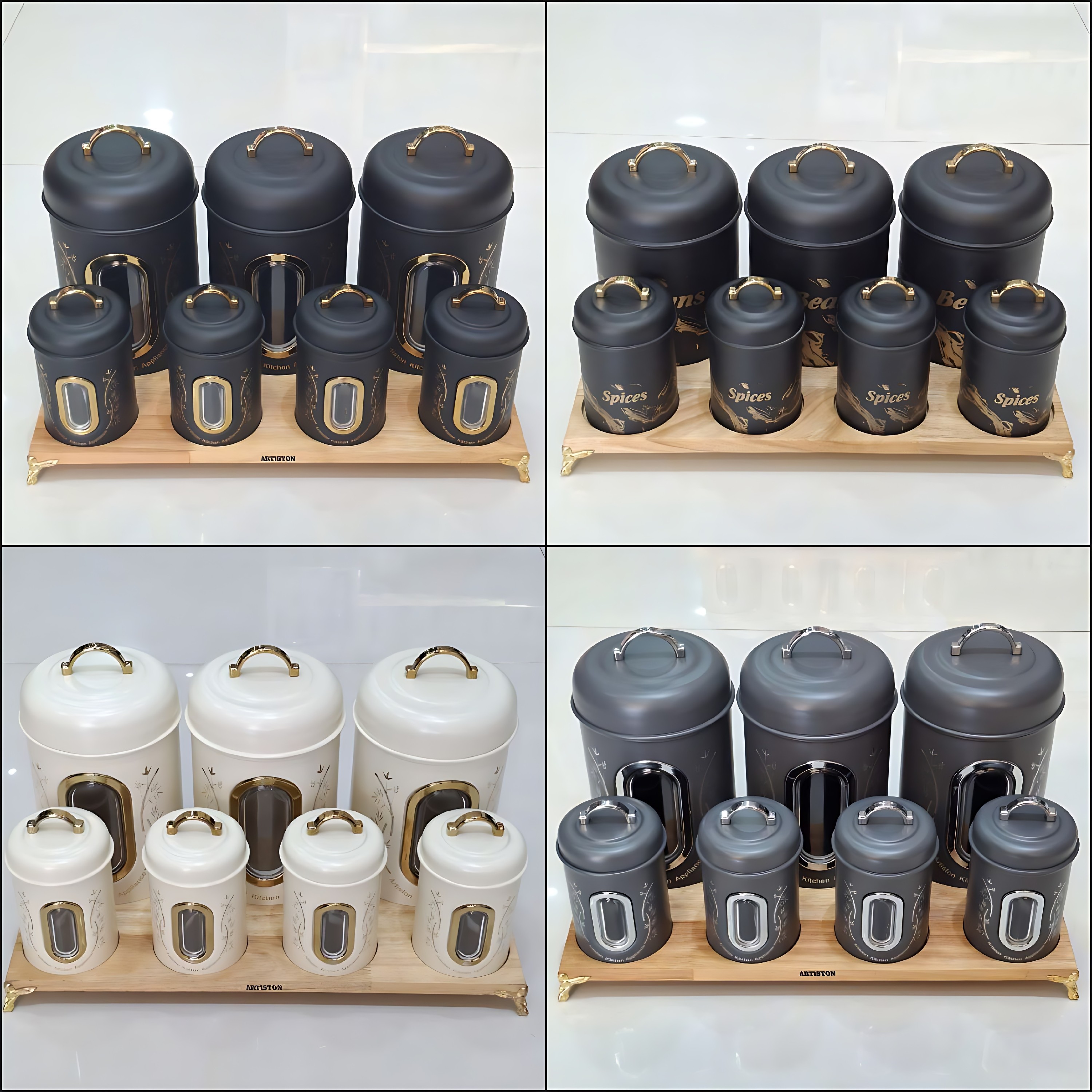 🔶️سرویس پاسماوری 8 پارچه درجه 1 از برند آرتیستون👌 🔸️جنس بدنه بانکه ها فلزی 🔸️جنس سینی چوبی 🔸️3 عدد بانکه بزرگ 1.5 لیتری 🔸️4 عدد بانکه کوچک ادویه 🔸️سینی پایه دار چوبی 🔸️جلو پنجره دار و قابل مشاهده مواد 📍گارانتی شرکتی و ضمانت رنگ سه ساله ❌️ارسال رایگان❌️