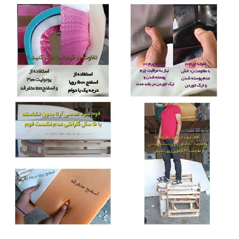بسیاری از مشتریان هنگام خرید مبل این دغدغه را دارند که دقیقا همان مبلی را که در نمایشگاه یا سایت خاصی دیده اند، دریافت کنند. این مشکل دغدغه خود ما نیز بوده است و به همین دلیل اقدام به تولید مبلی با کیفیت کردیم که شما خریدار عزیز از خرید خود کالما راضی و خشنود باشید. همه برای کیفیت محصول خود ادعا می کنند اما ما این ادعا را با موارد زیر به شما اثبات می کنیم. اولین اثبات ما گرفتن عکس هایی با کیفیت و دقیق از محصول است که شما خریدار عزیز بتوانید از تمام زوایا مبل خود را بررسی کنید. دوم ضمانت، خود سایت دیجی کالاست که به شما این اطمینان را می دهد که در صورت مغایرت در محصول دریافتی می توانید آن را بازگشت دهید. سوم، اگر کمی ریز نگر و نکته بین باشید می توانید ظرافت در رویه کوبی در قسمت لمسه های مبل را ببینید که با حساسیت بالایی انجام شده است؛ این موضوع به این معنی است که تولید مبل چستر با حساسیت و دقت بسیار بالایی انجام شده است. حال به معرفی خود مبل چستر بپردازیم: کلاف در مبل مانند ستون بندی یک ساختمان است و بسیار مهم است که از کیفیت و دوام بالایی برخوردار باشد. کلاف مبل چستر از چوب تبریزی خشک شده تولید شده است که دوام و مقاومت بسیار بالایی در برابر وزن و استفاده زیاد از مبل دارد. نکته بعدی در قسمت کفی مبل چستر است که از فوم سرد پلی یورتان استفاده شده که دارای کد QC و کد تولید است. موضوع بعدی اسفنج روی پشتی و دسته های مبل است که از اسفنج 20 کیلو رویا استفاده شده که دانسیته مل ندارد و پس از مدتی استفاده پورد پودر و خورده نمی شود. این مبل زیبا با چرم پی یو روکش شده است. چرم پی یو نرمی و انعطاف پذیری مناسبی دارد که از ترکیدگی، پوست پوست شدن و ناخن کش شدن کار جلوگیری می کند. توانایی تحمل گرما، سرما و تحمل شعله تا 5 ثانیه از دیگر ویژگی های چرم پی یو است.