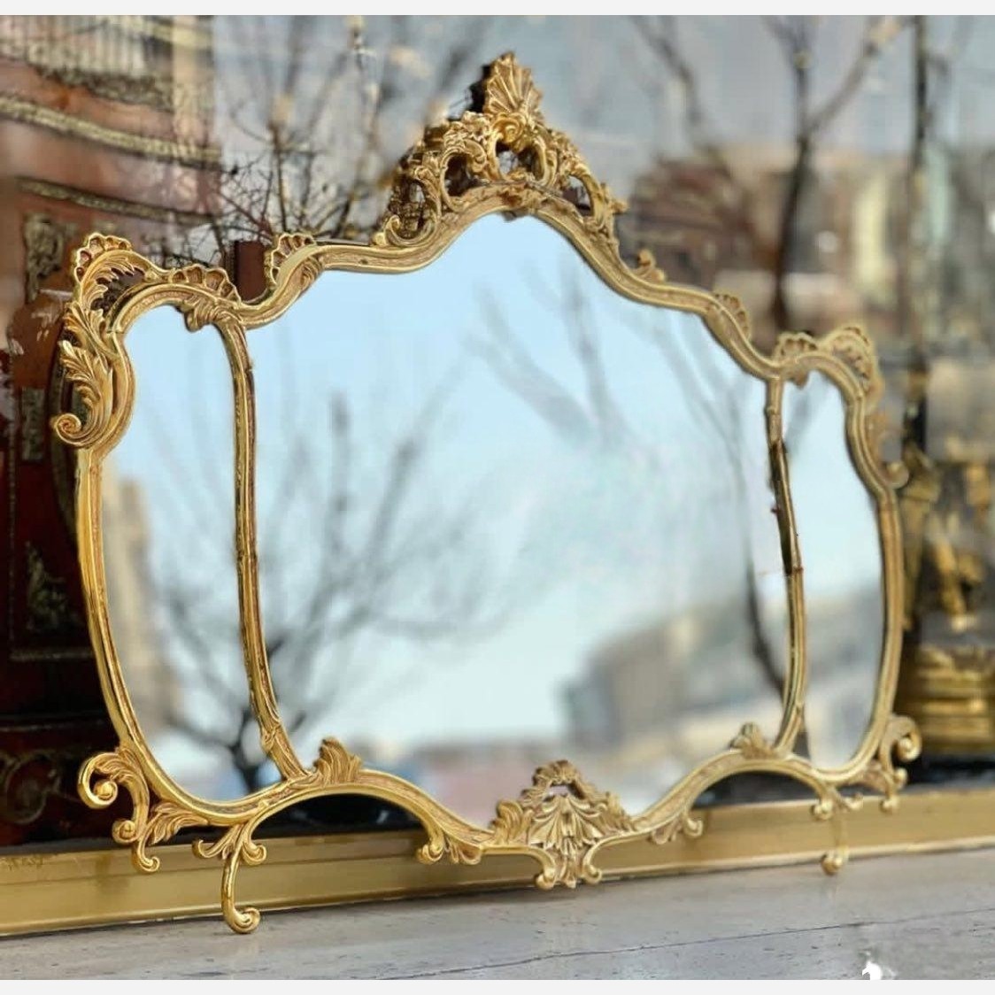 آینه بوفه ای برنز پذیرایی مزون تالار تشریفاتی آیینه ونیزی ابزار خورده آینه دکوراتیو برنزی آنتیک پتینه فرانسوی برنجی مبلمونسرا مدل 261096