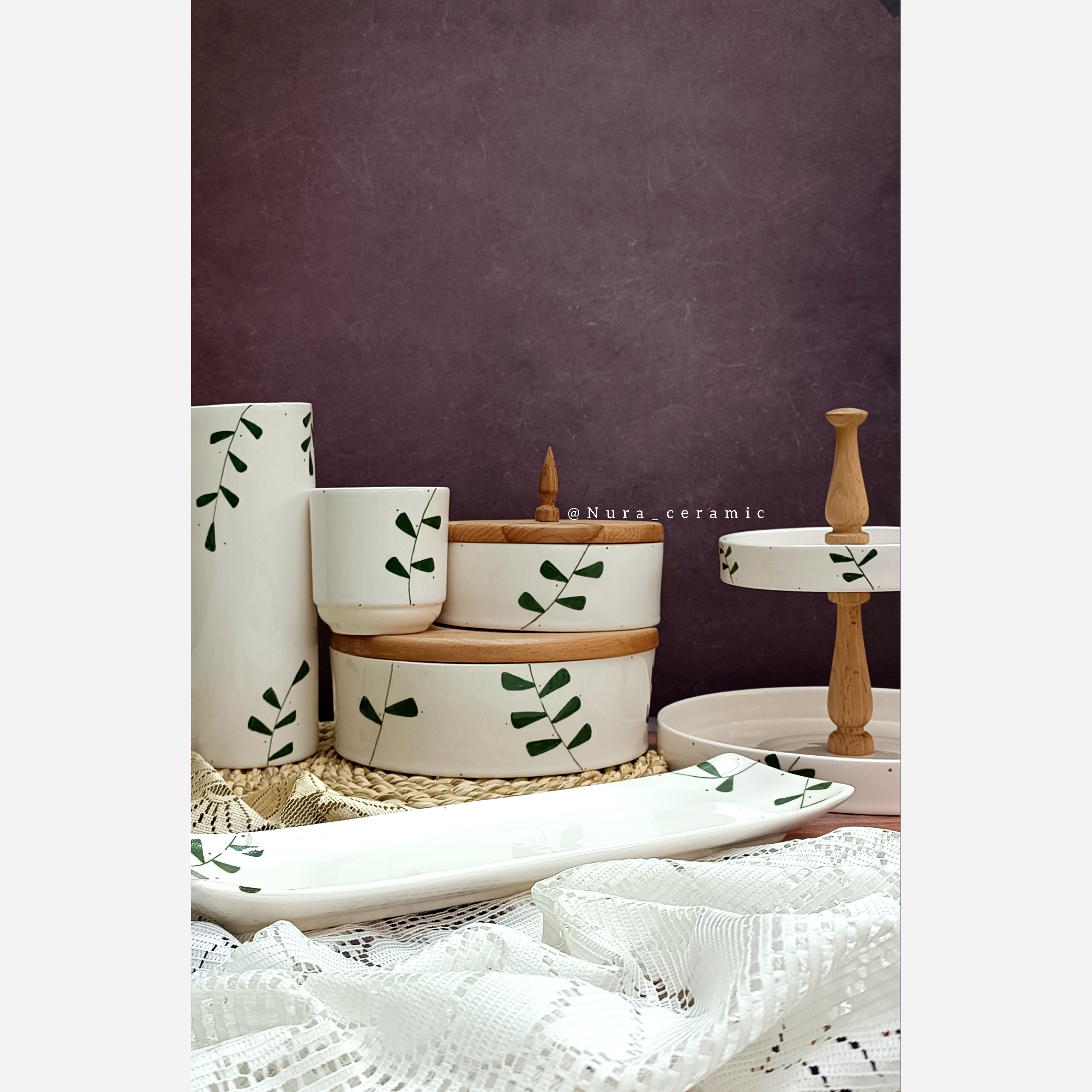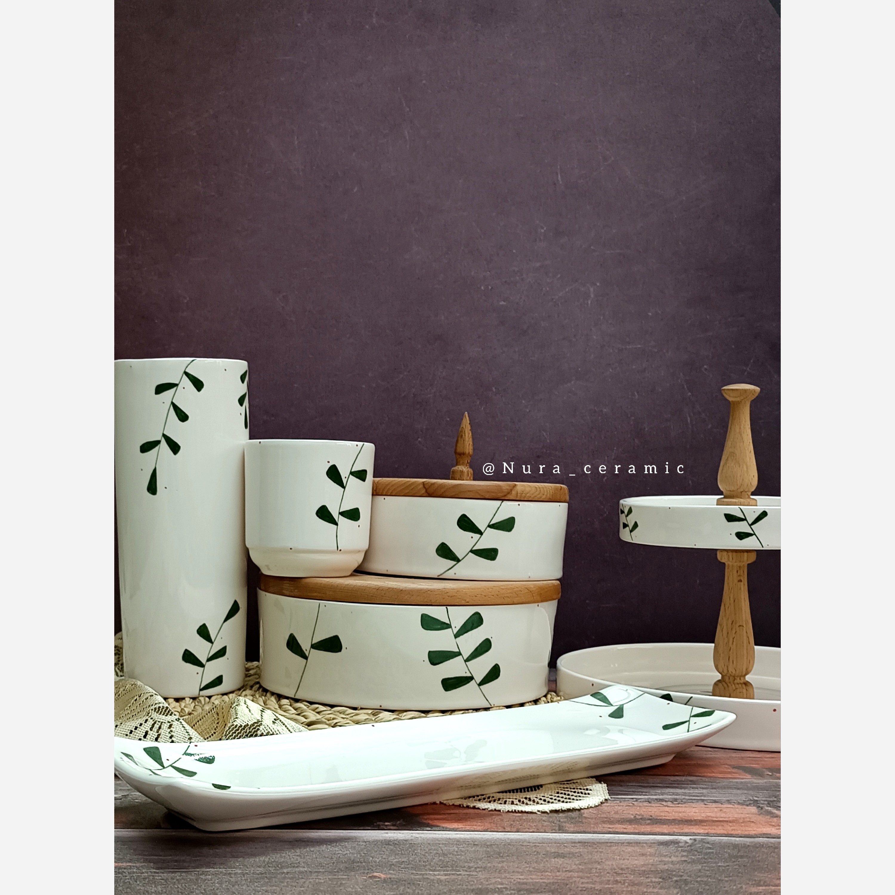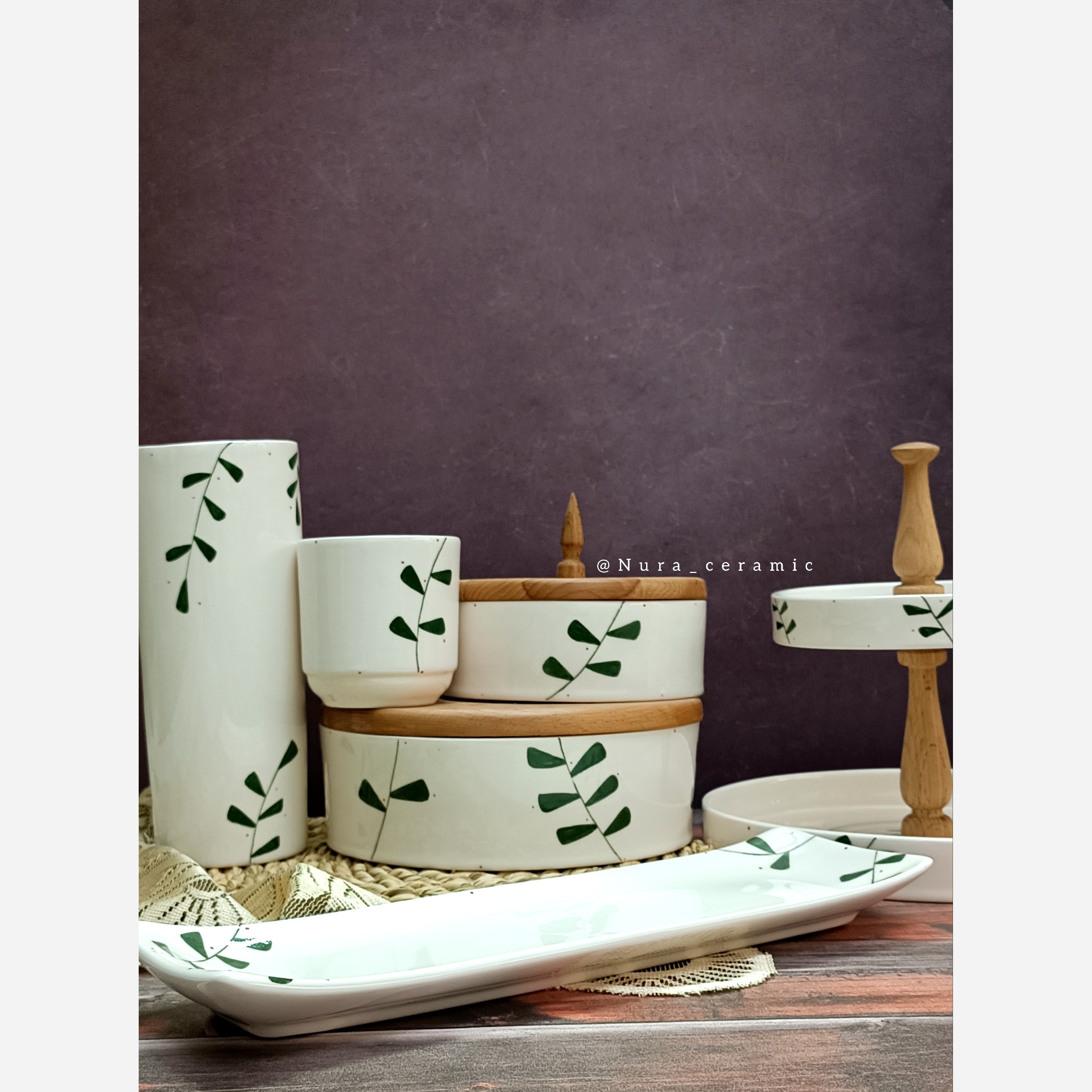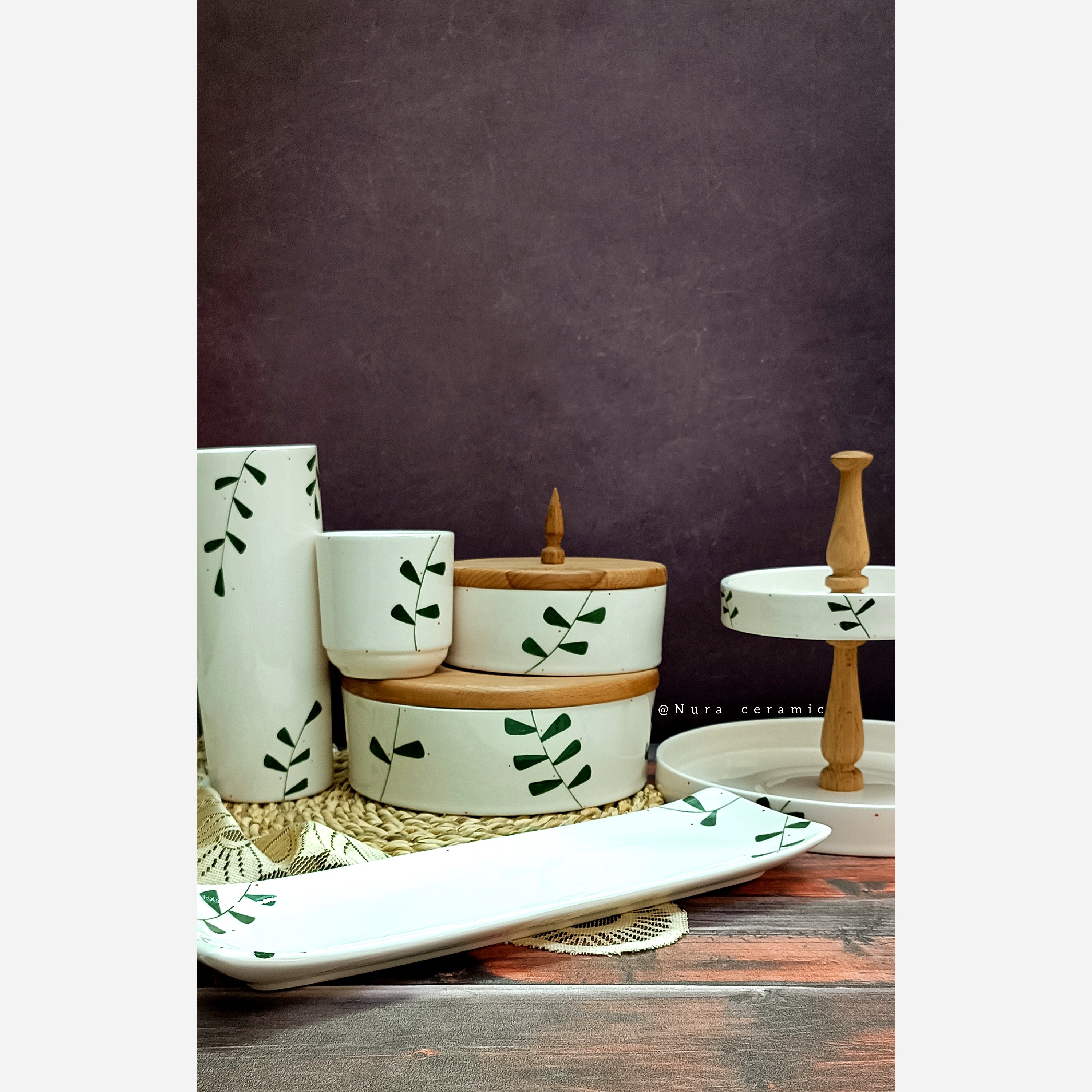 جای چاقو ، شیرینی خوری دو طبقه ، رولت خوری ، گلدان ، بیسکوییت خوری و آجیل خوری سرامیکی کاملاً دست ساز کاملاً مصرفی قابل شستشو با انواع شوینده تکنیک نقاشی زیرلعابی دو دور پخت شده پخت شده با دمای بالای 1080