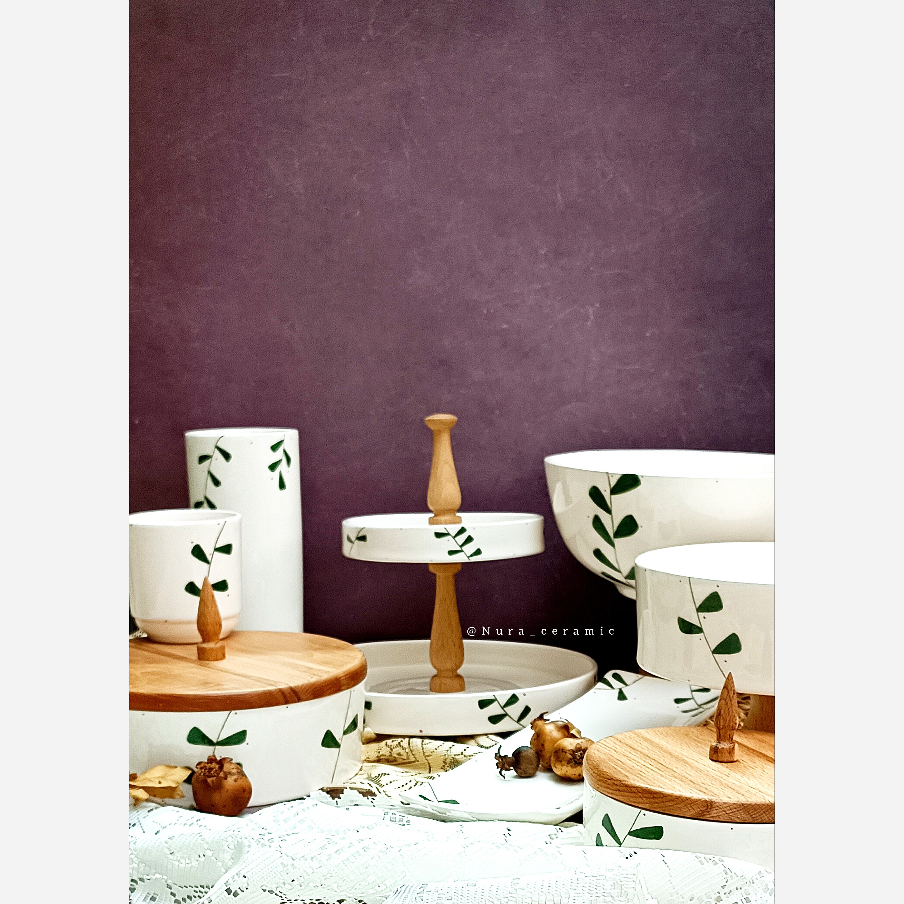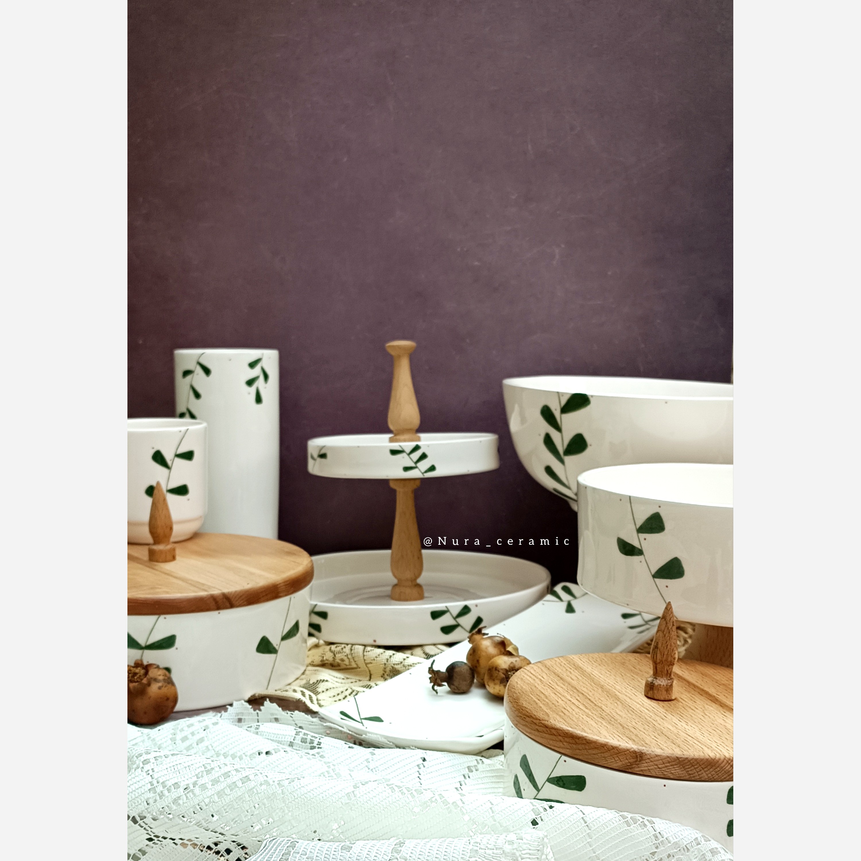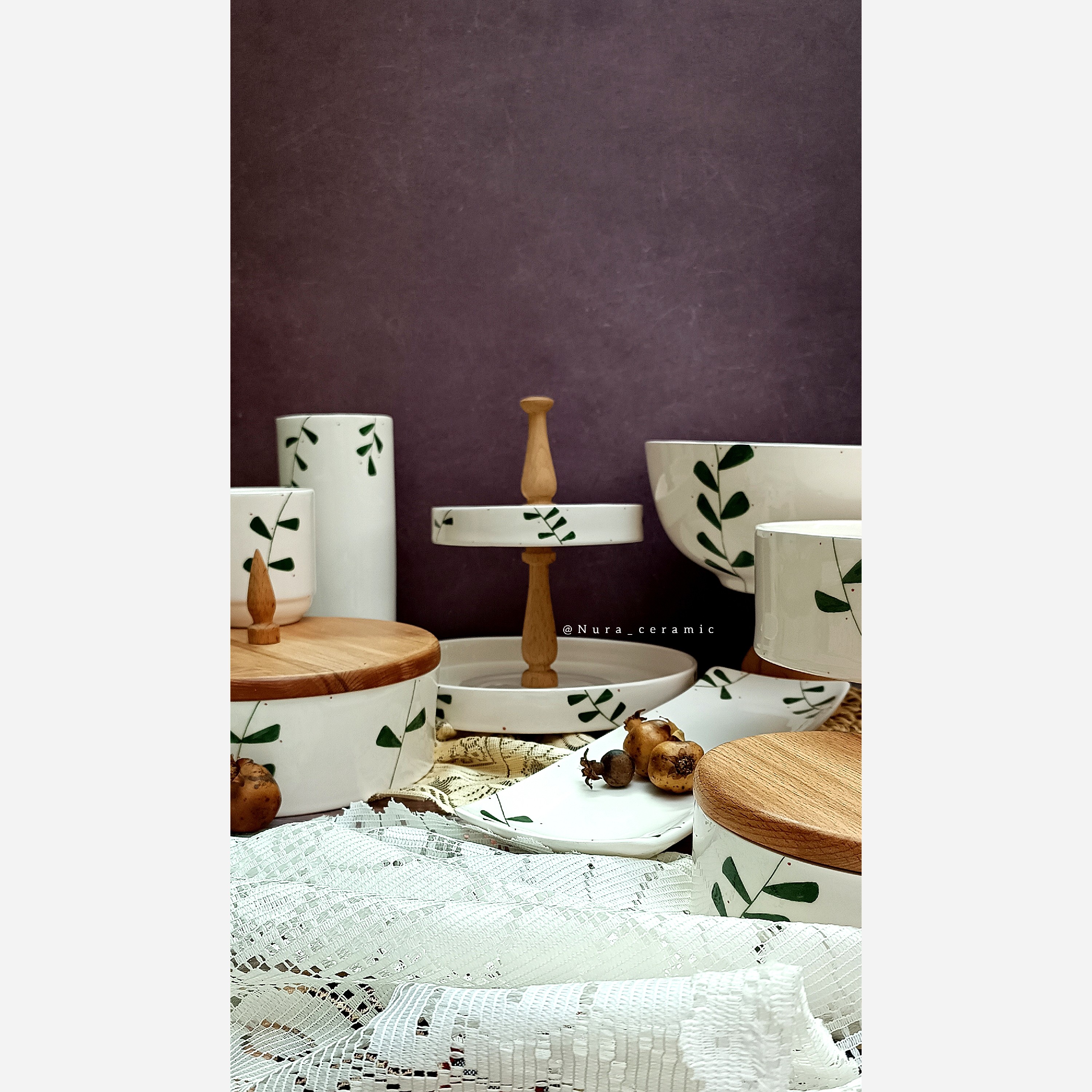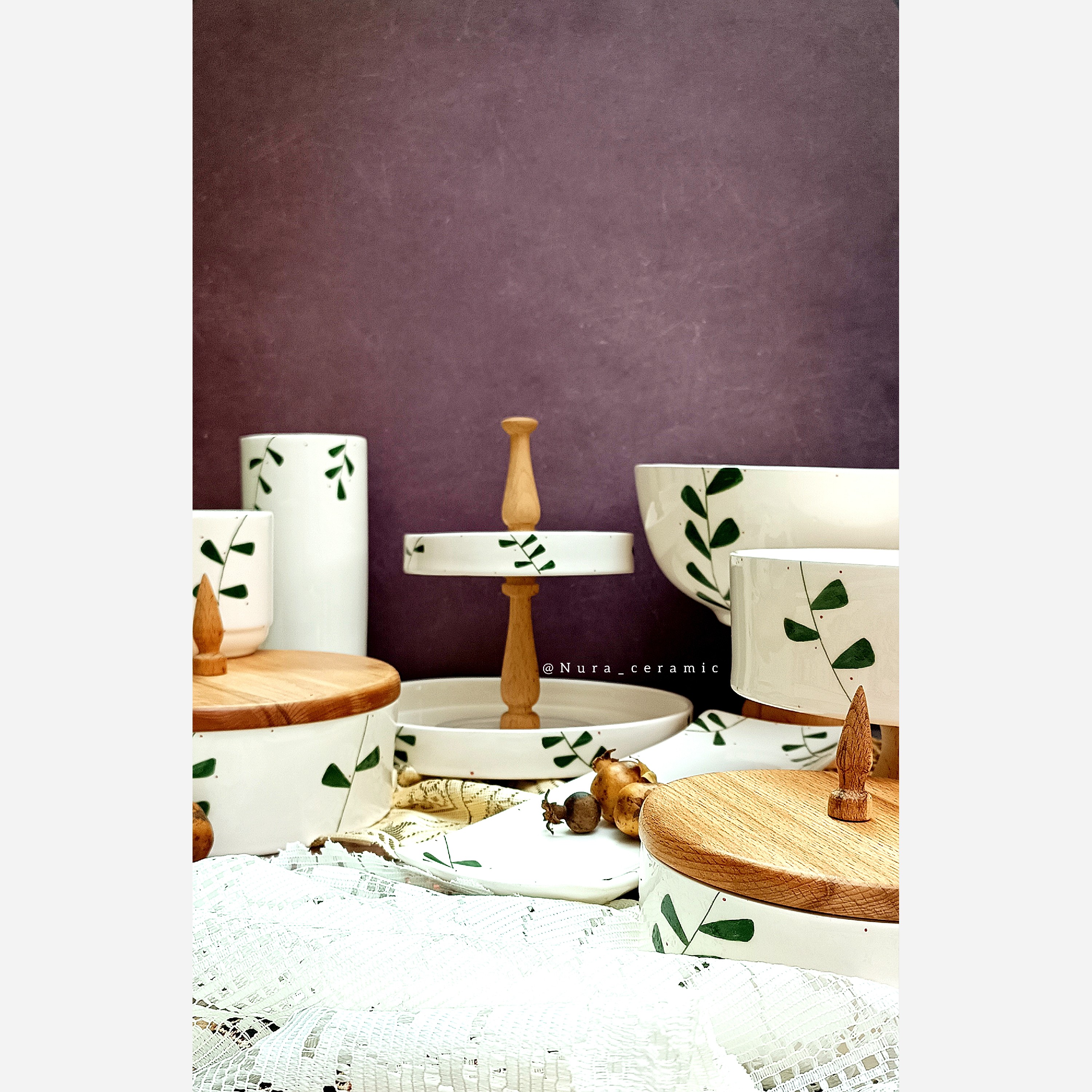 سرویس کامل پذیرایی شامل یک عدد کاسه میوه خوری بزرگ با پایه چوبی یک عدد شیرینی خوری دو طبقه با هولدر چوبی یک عدد گلدان یک عدد جای چاقو یک عدد بیسکوییت خوری با درب چوبی یک عدد آجیل خوری با درب چوبی یک عدد رولت خوری یک عدد کاسه میوه خوری کوچک با پایه چوبی. کاملاً مصرفی کاملاً دست ساز قابل شستشو با انواع شوینده نقاشی زیرلعابی پخت شده با دمای بالای 1080