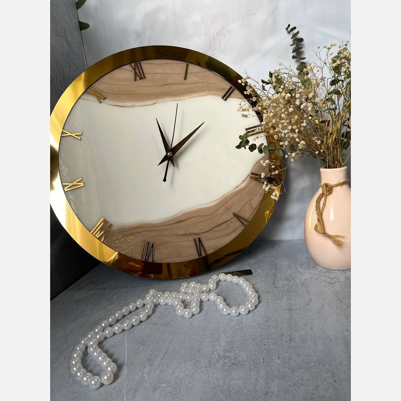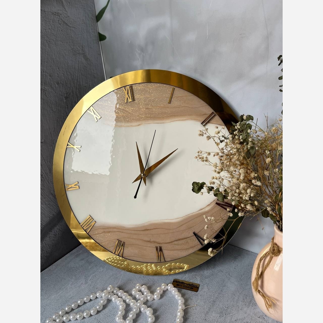 ساعت رزینی کرم طلایی رینگ دار.سبک روسی .سایز 40 سانته. ازسایز 30 تا 100 سانت قابل اجراست.در رنگ های مختلف بدون رینگ یا با رینگ قابل سفارشه با رزین سوپر شفاف کار شده موتور تایوان با ضمانت یکساله