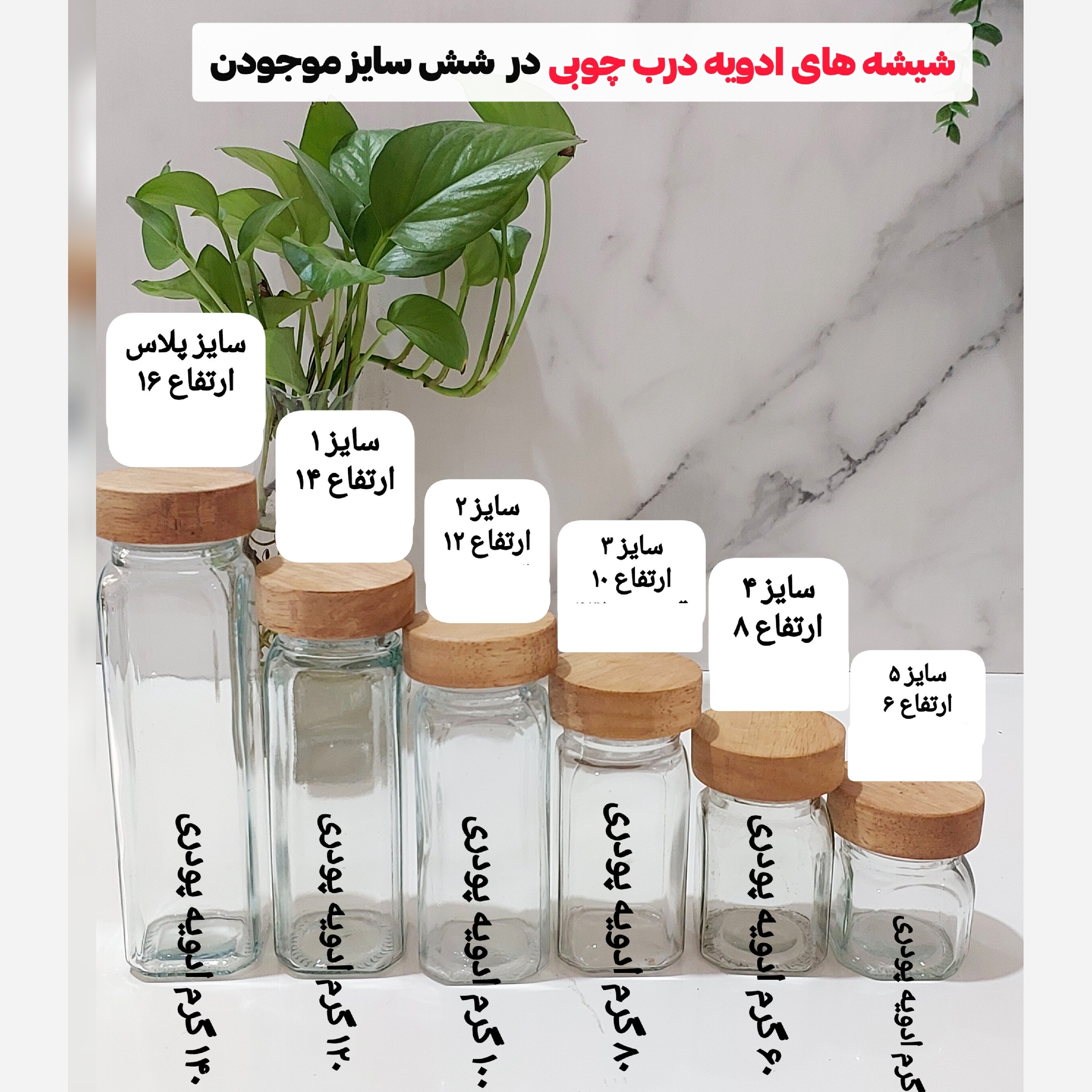 با ادویه مکارتی شیشه ای چهارگوش 14 سانت مناسب 120 گرم ادویه پودری کف 4.5 ارتفاع 14 درب چوب رابروود