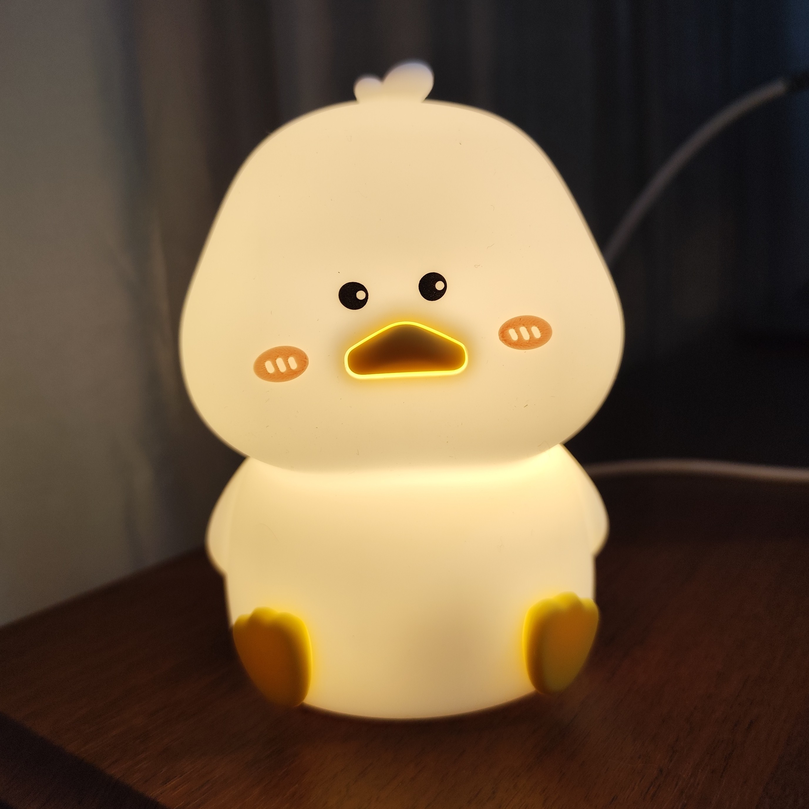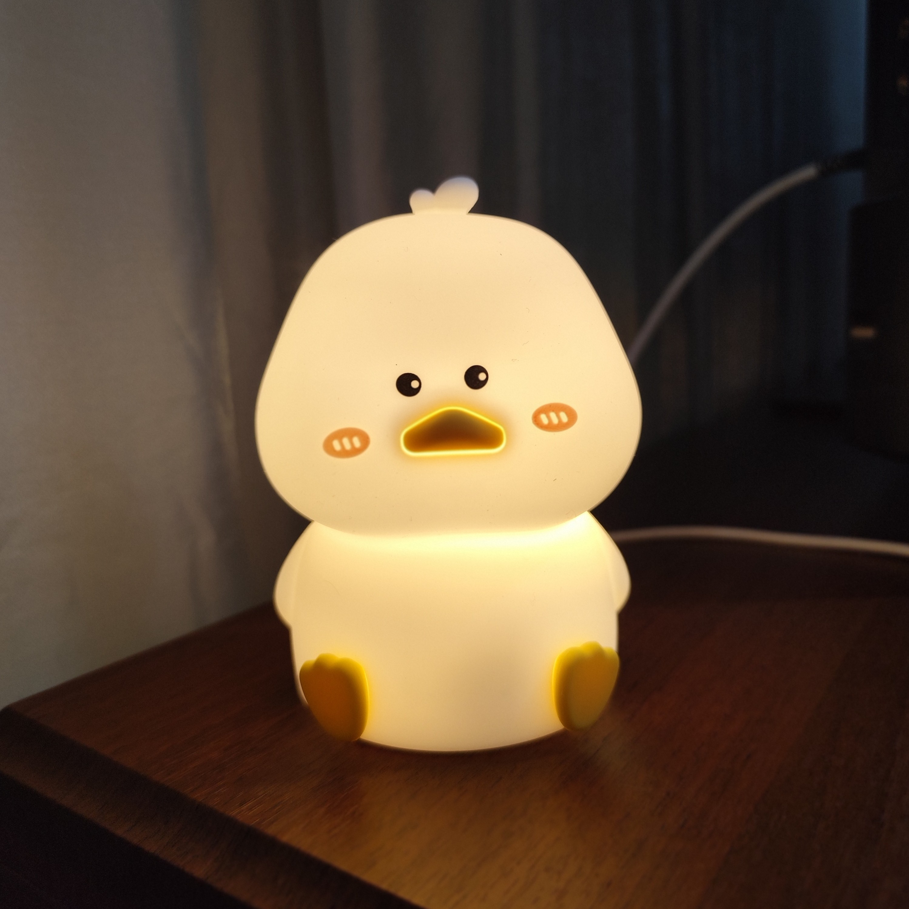 چراغ خواب سیلیکونی مدل جوجه اردک یک چراغ خواب فانتزی بسیار زیبا مناسب برای اتاق خواب است. این چراغ خواب، شارژی و قابل حمل است و با توجه به ظاهر نرم و عروسکی مانند آن، میتوان آن را داخل تخت خواب به همراه خود برد. چراغ خواب سیلیکونی مدل جوجه اردک دارای یک باتری داخلی با ظرفیت حدود 1200 میلی آمپر است که انرژی مورد نیاز چراغ برای حدود 5-6 ساعت را تامین میکند. داخل جعبه محصول یک کابل USB با سری Type-c قرار دارد که برای شارژ محصول مورد استفاده قرار میگیرد، این کابل را میتوانید به آداپتورهای 1 آمپر یا دستگاههای دارای پورت USB مانند پاوربانک متصل کنید تغییر رنگ نور با ضربه به بدنهی عروسکی جوجه اردک انجام میشود؛ در صورت روشن بودن دکمهی چراغ، با یک ضربهی کوچک میتوان نور چراغ را تغییر داد و یا آن را خاموش و روشن کرد کرد. دارای تایمر 30 دقیقه ای و نور پردازی هفت رنگ