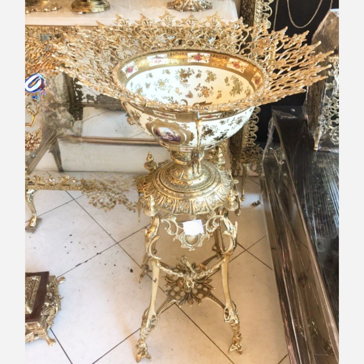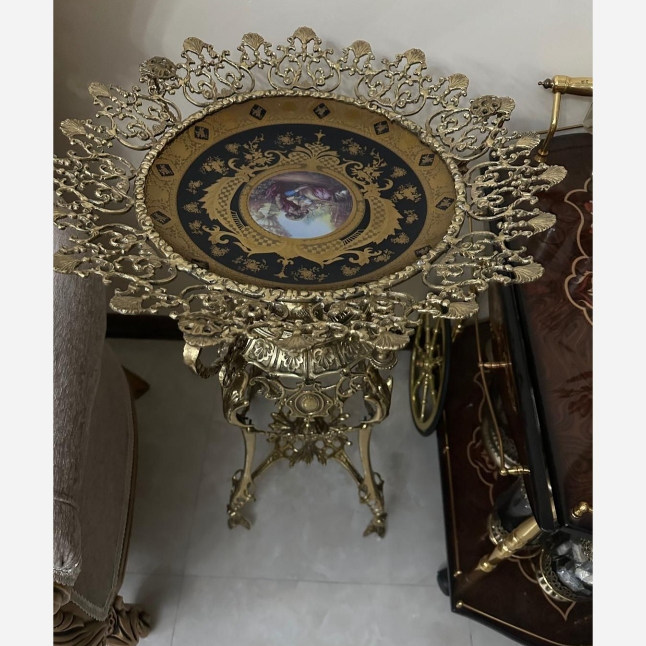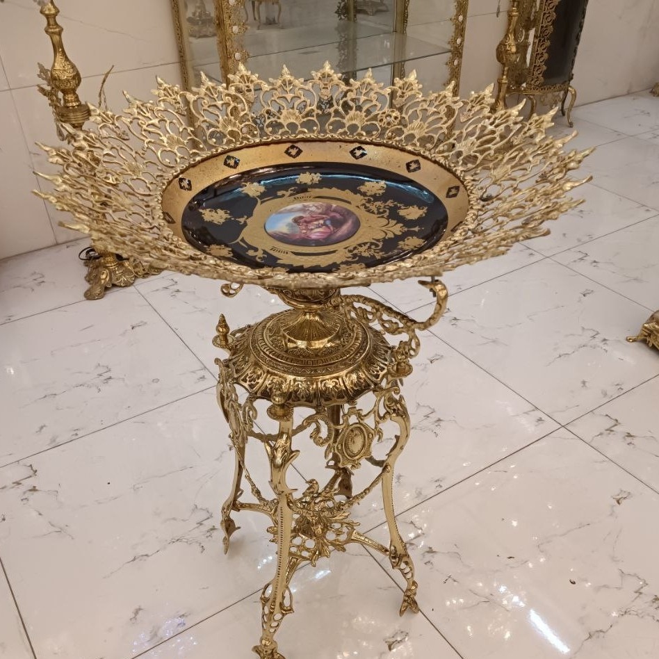 میوه خوری کنار سالنی آجیل خوری پایه دار برنز پایه کالسکه فرشته ملکه برنزی بشقاب طلاکوب اعلا جا میوه برنجی مبلمونسرا مدل 265343