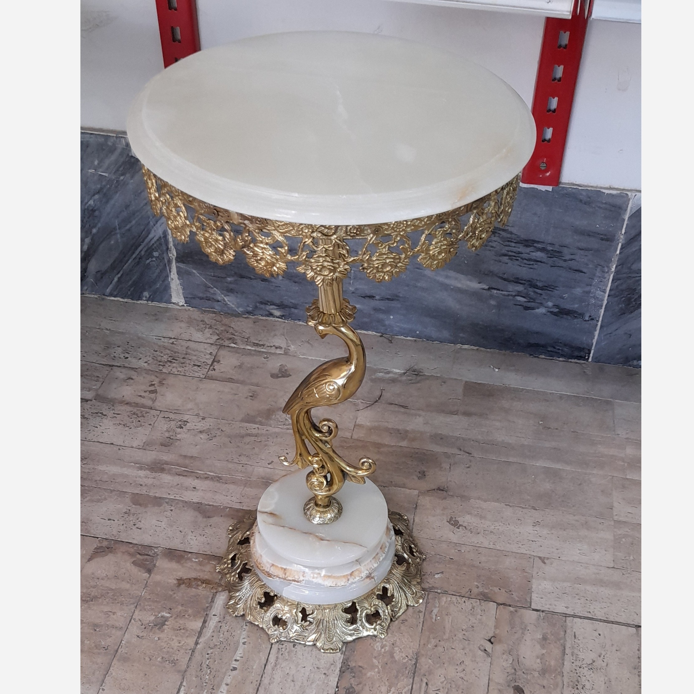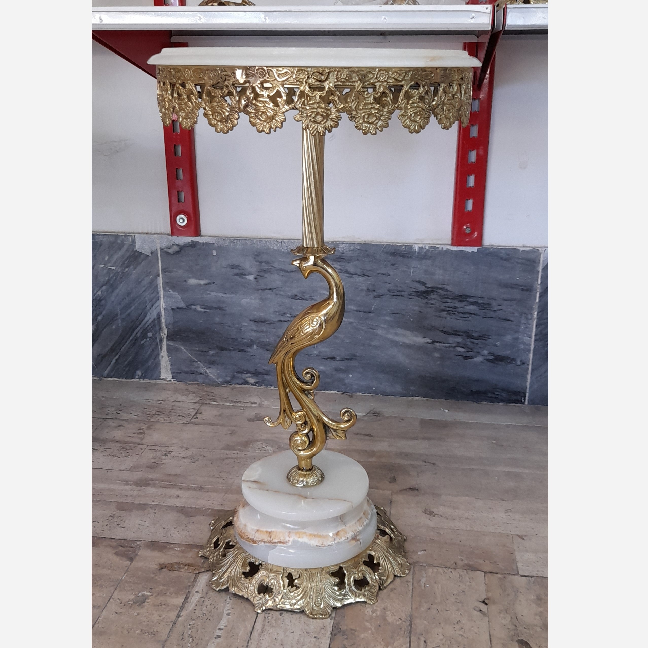 میز تلفن برنجی ارتفاع 72 س قطر سنگ 40 س پایه سنگ طبیعی تنه طاووس ضمانت اصالت برنج