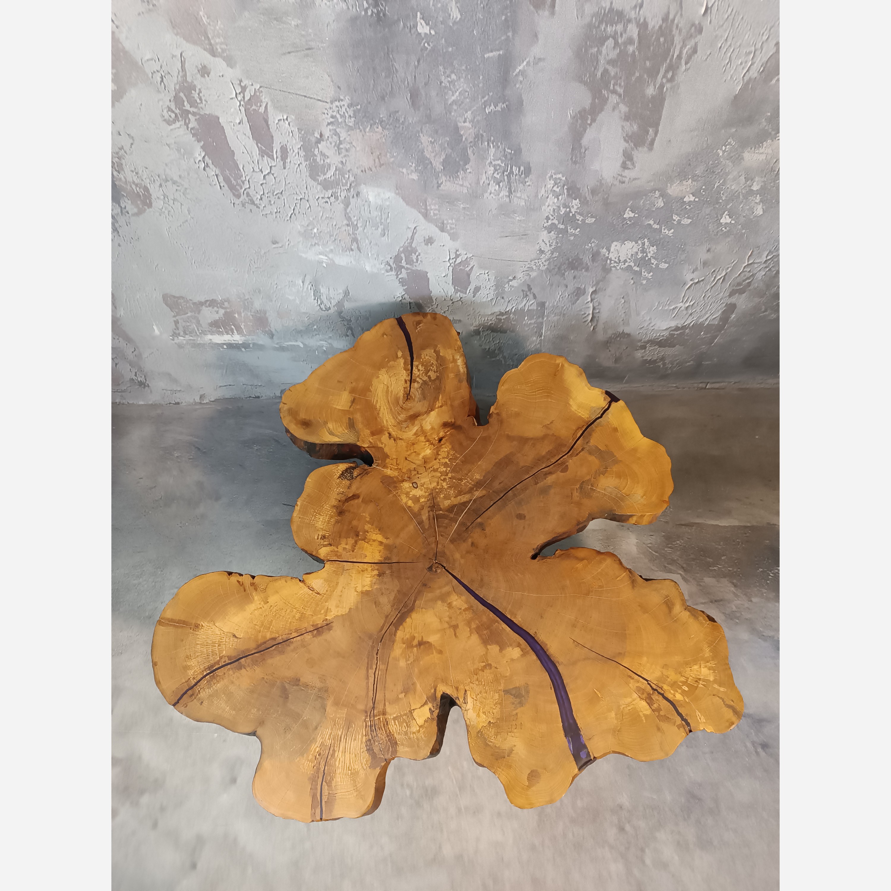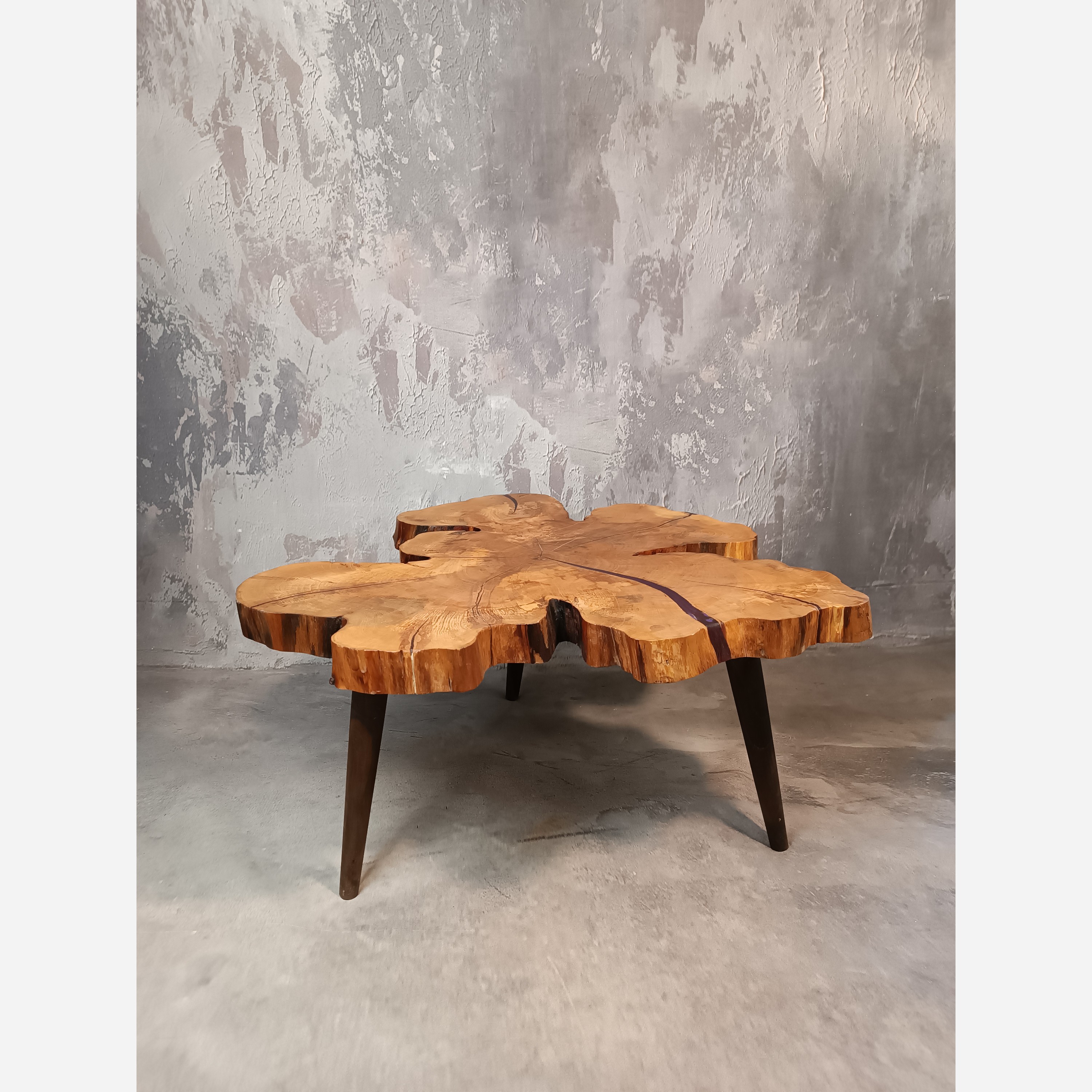 میز جلومبلی ساخته شده از چوب طبیعی توسکا و رزین ، فرم میز کاملا طبیعی و بدون برش است