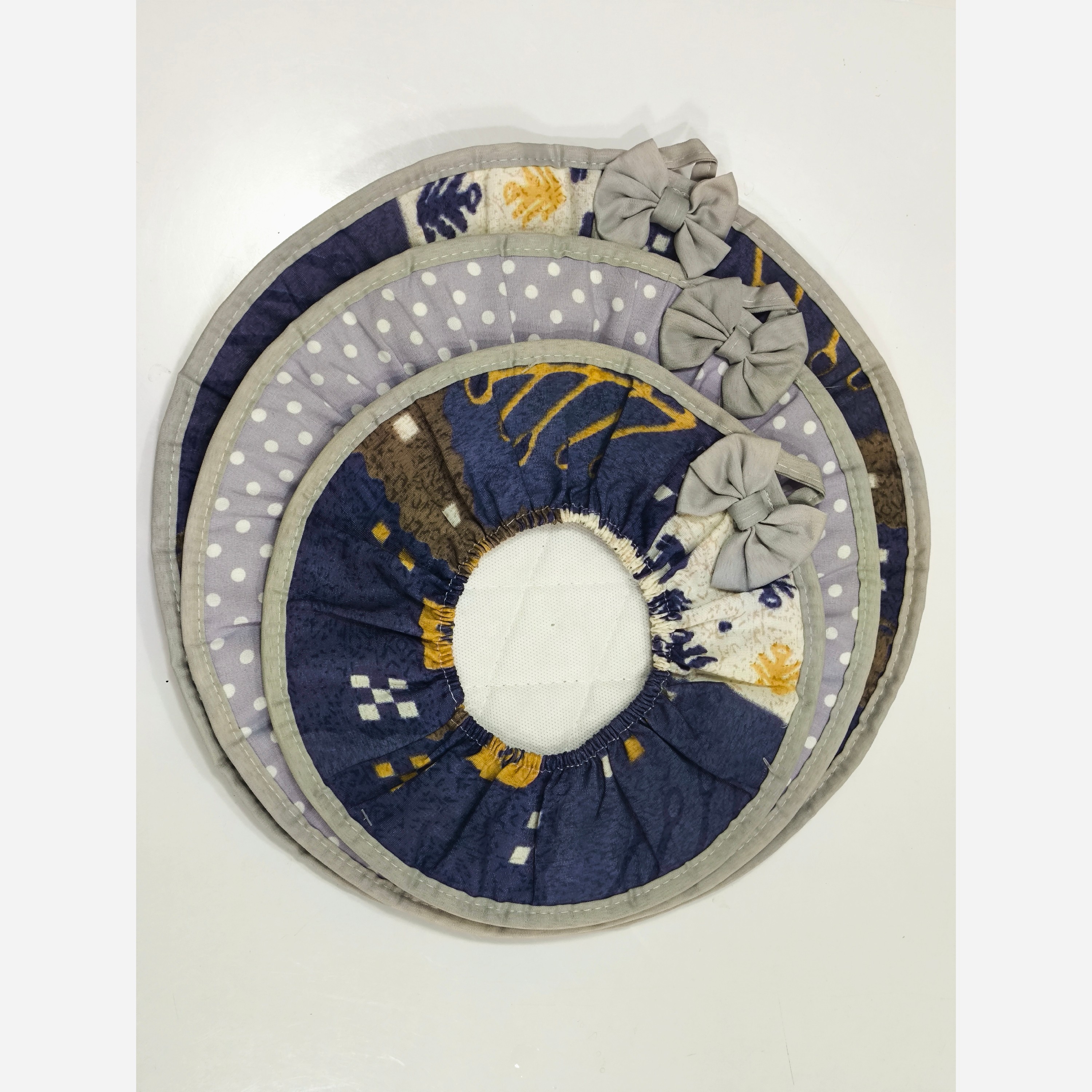 ست دمکنی دور کش با ابعاد استاندارد در 3 سایز 25 و 30 و 35 میباشد مطلسه دوزی شده و دوخت تمیزی دارد و بند برای اویز کردن دارد و قابل شست و شو در ماشین لباسشویی نیز هست