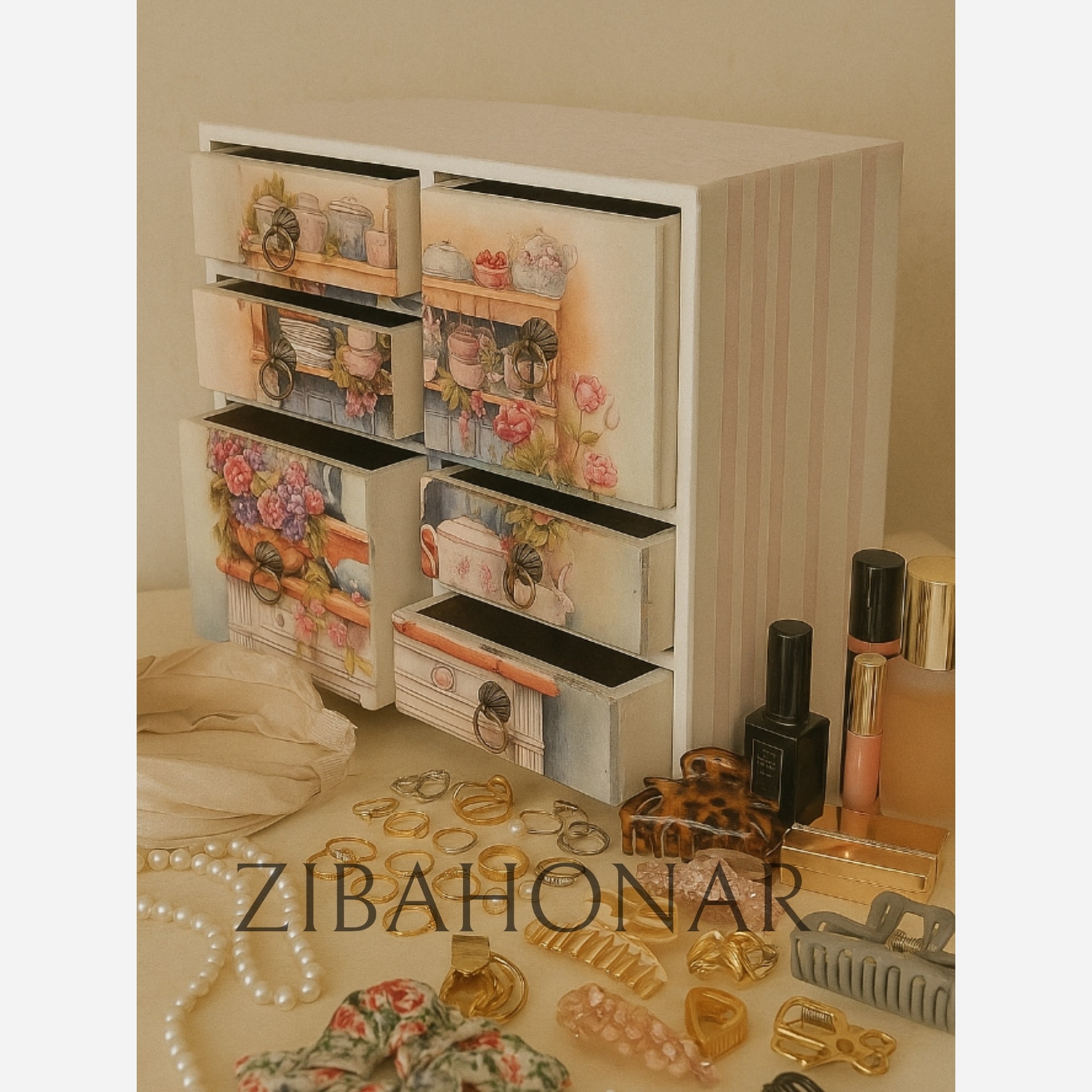 مینی فایل کشویی فانتزی با 6 کشو بسیار شیک و جادار و بسیار پرکاربرد است که در هرجایی جایگاه خودشو میگیره توی اتاق خواب می تونه بهترین انتخاب برای لوازم آرایشی یا جواهرات و ملزومات خیاطی و... باشه توی آشپزخانه می تونه وسایل ریز آشپزی مثل قاشق چنگال و انواع ملزومات آشپزی و جایگاهی برای انواع دارها و ویتامین ها و انواع شکلاتها و خوراکی ها و ...باشه اینکار بسته به سلیقه و نیاز خریدار ساخته شده تا در هر مکانی استفاده شود.