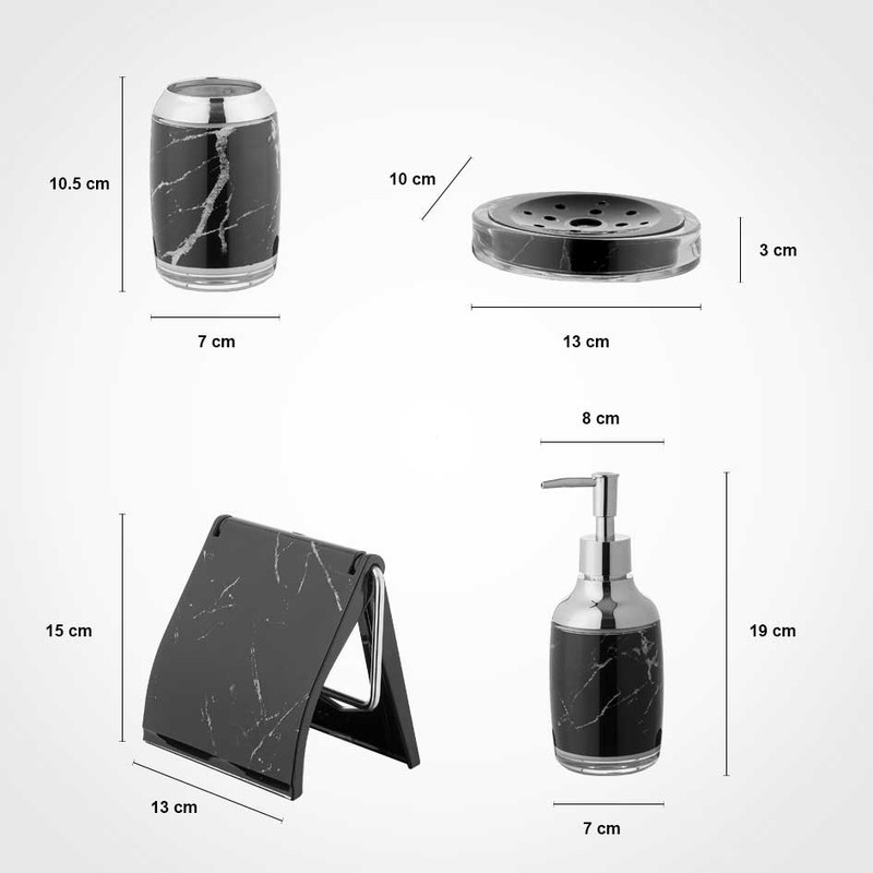 سطل قطر: ۱۹cm ارتفاع: ۲۴cm فرچه قطر: ۱۰cm ارتفاع: ۳۷cm جا مسواکی قطر: ۷cm ارتفاع: ۱۰.۵cm جا صابونی طول: ۱۳cm عرض: ۱۰cm ارتفاع: ۳cm جا دستمالی طول: ۱۳cm ارتفاع: ۱۵cm جا مایعی طول: ۸cm عرض: ۷cm ارتفاع: ۱۹cm