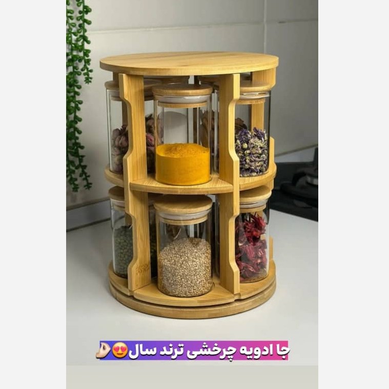 جا ادویه چرخشی وارداتی😍 جنس چوب بامبو جنس شیشه پیرکس تهداد شیشه ادویه 10 عدد یه کار خاس و باکیفیت و شیشه بزرگ