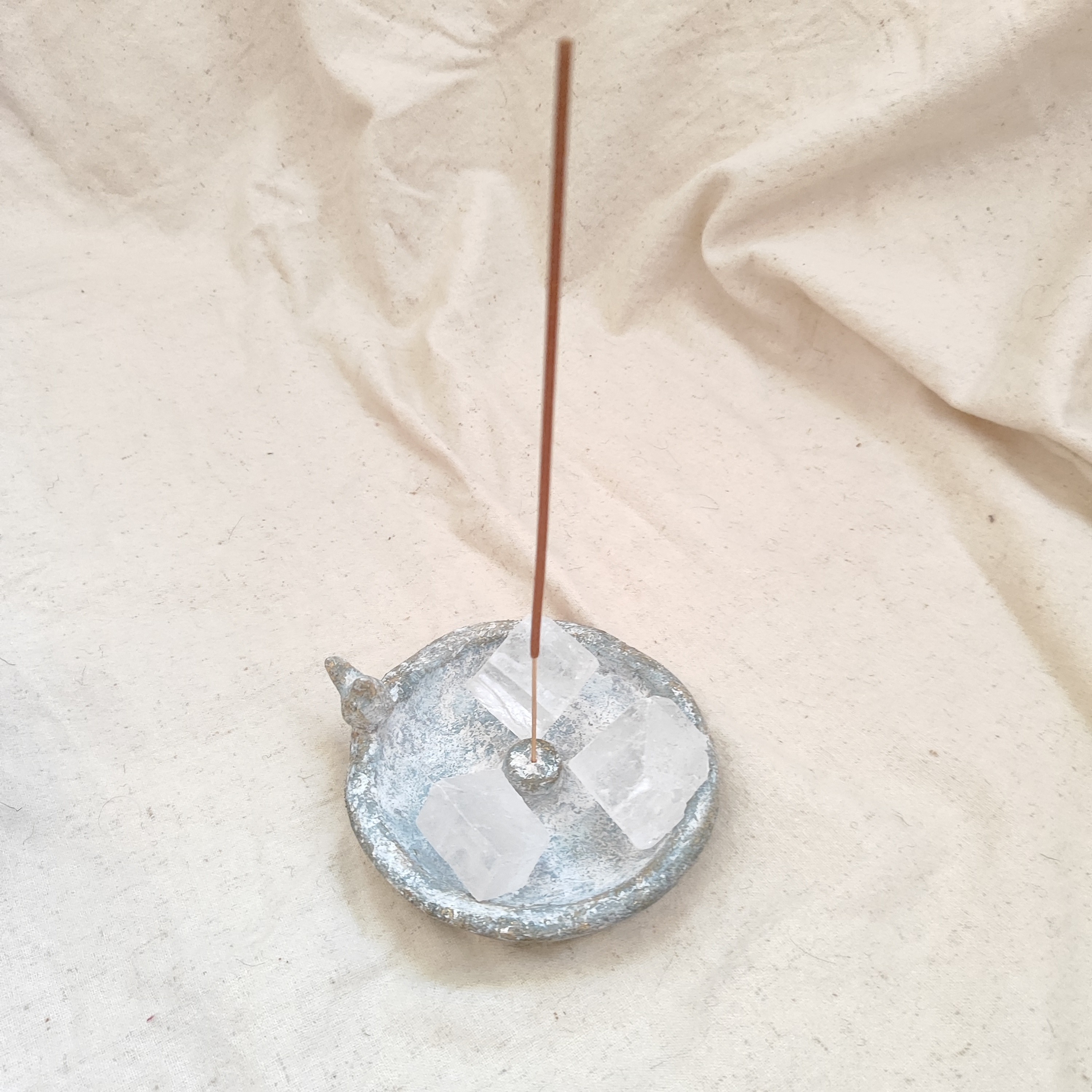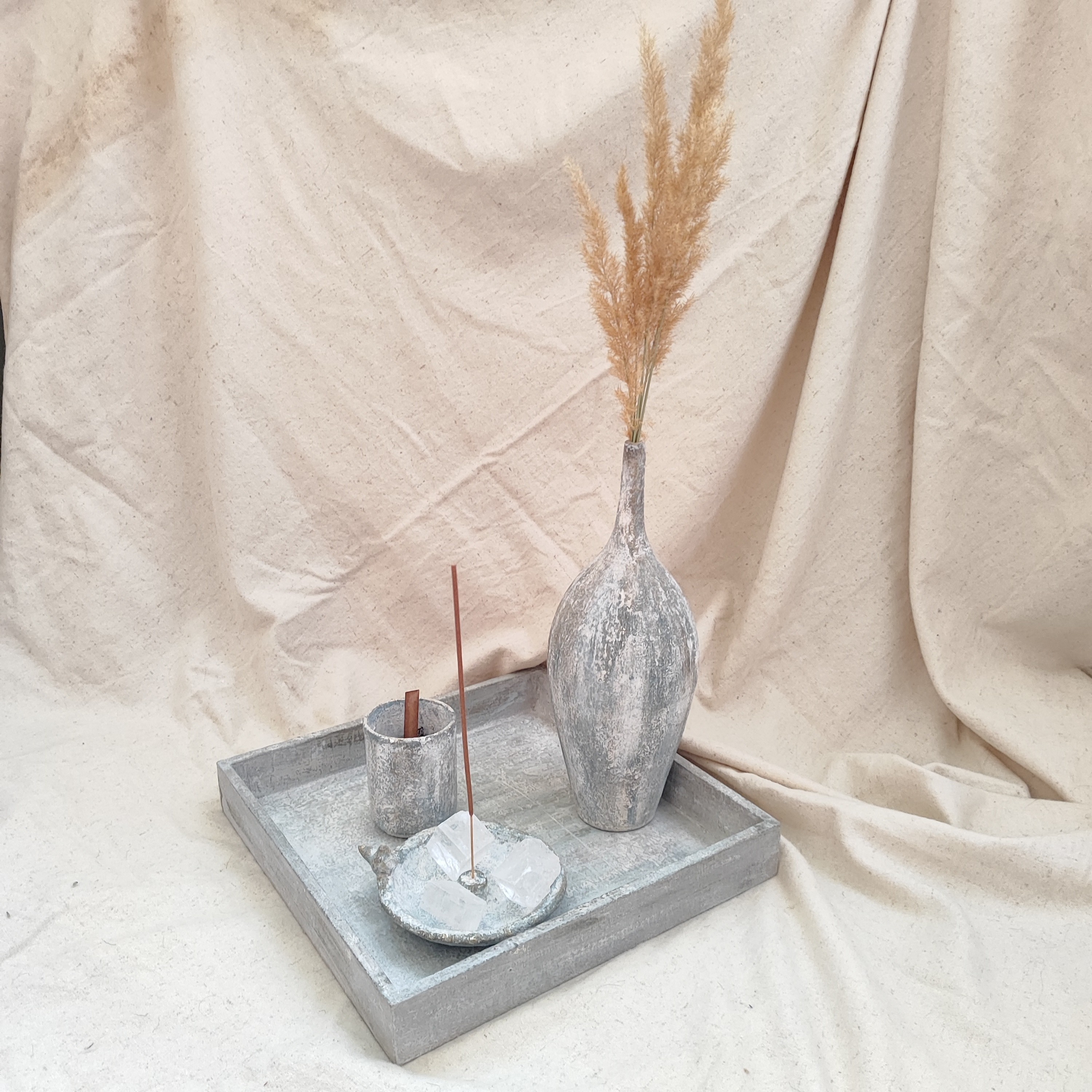 این ست شامل یک سینی نئوپان، یک گلدان سفالی، یک شمع با ظرف سفالی و فتیله چوبی و یک جای سنگ نمک و عود سفالی است، که همگی پتینه شده اند. شمع و سنگ نمک و عود به همراه بسته ارسال می شود.