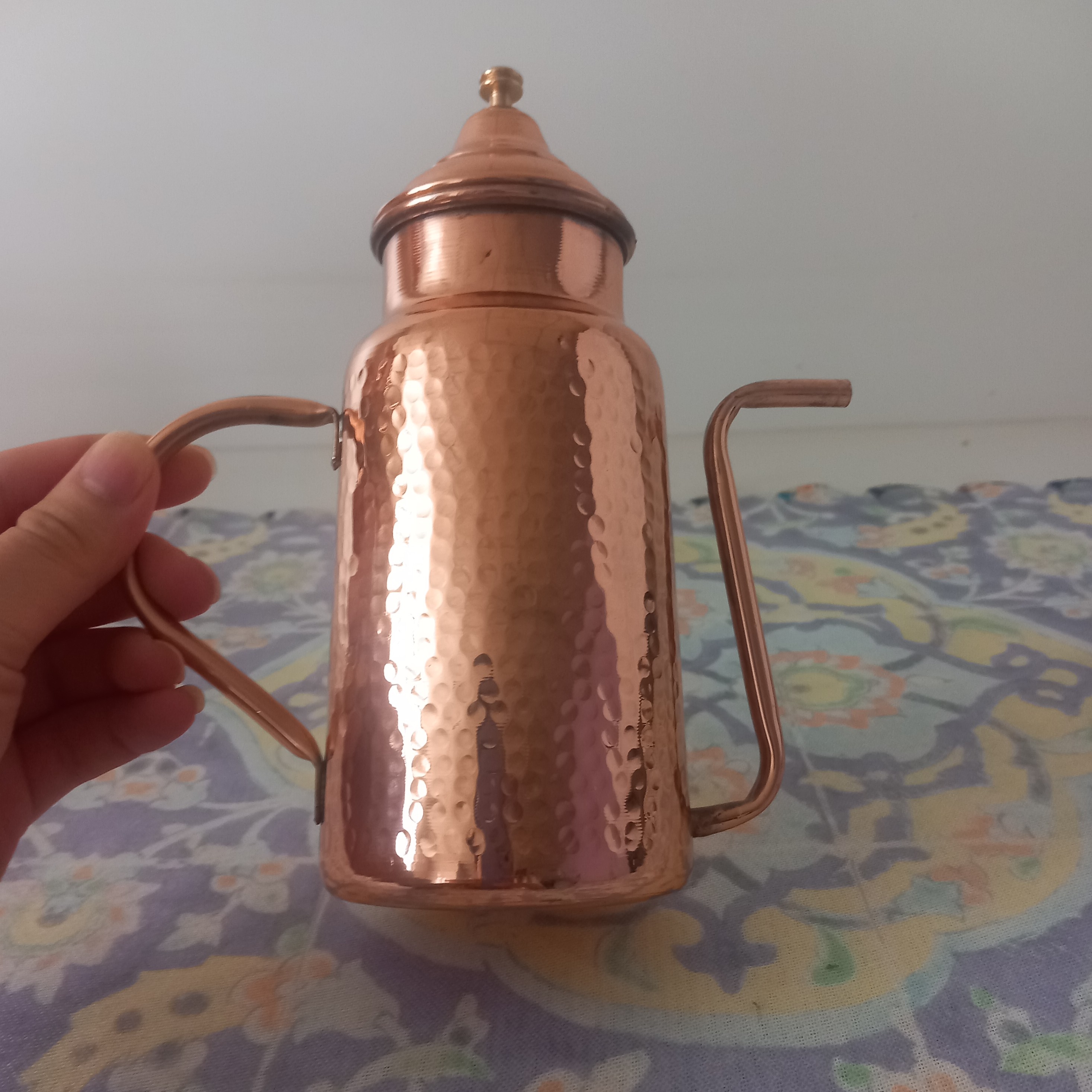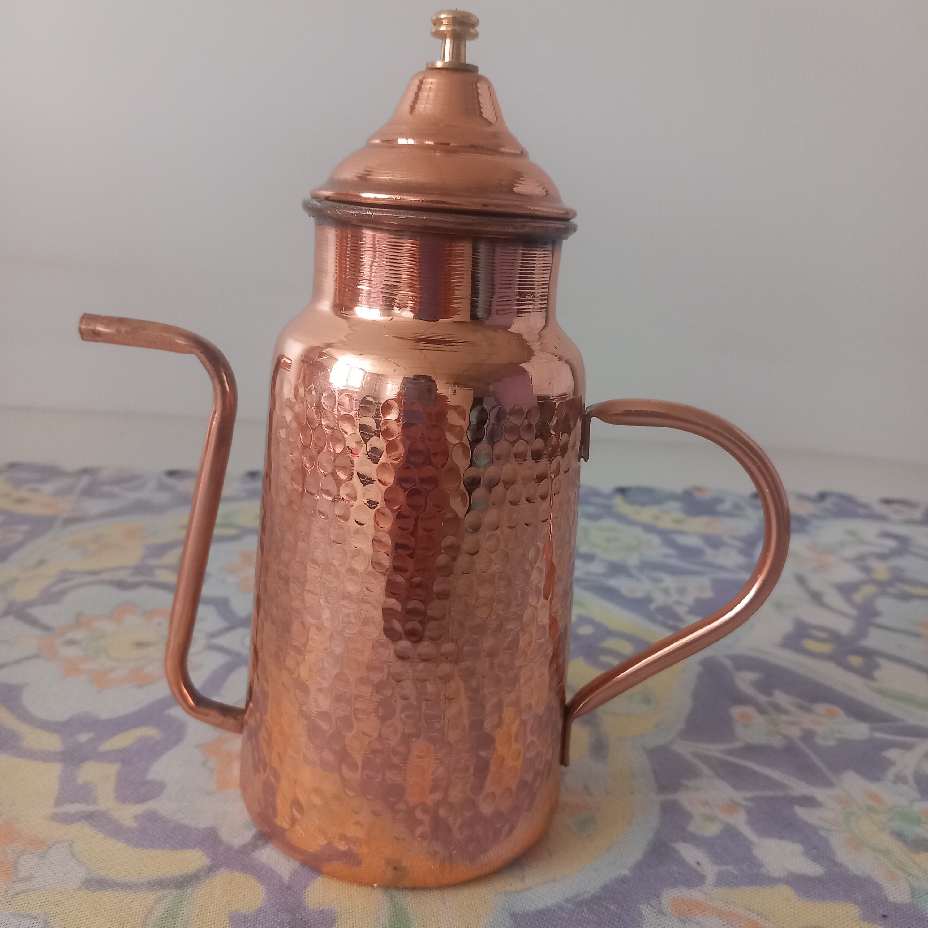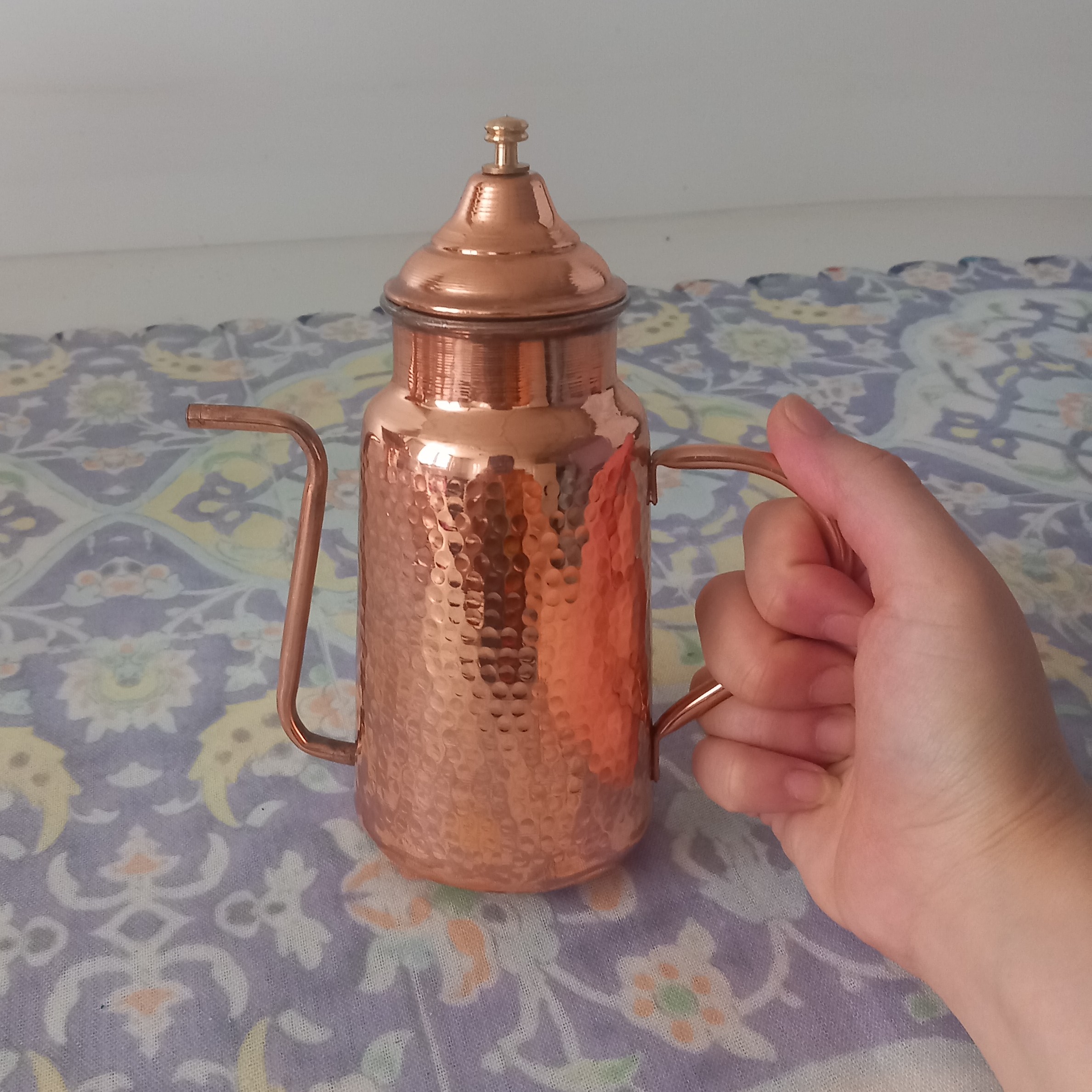کاربرد دقیق روغنریز در آشپزی: روغنریز مسی بهطور خاص برای نگهداری و مصرف راحتتر روغنهای خوراکی طراحی شده. استفاده از این ظرف به شما کمک میکنه: کنترل مقدار مصرف روغن: بهخاطر لوله باریک و دهانه کوچکی که داره، بهراحتی میتونی مقدار روغن رو در هنگام سرخکردن یا تفت دادن کنترل کنی، بدون اینکه روغن زیادی بریزی یا به مواد غذایی آسیب بزنه. جلوگیری از آلوده شدن بطری روغن اصلی: بهجای باز و بسته کردن بطریهای بزرگ پلاستیکی یا شیشهای روغن، میتونی مقدار لازم رو داخل این ظرف بریزی و هم در آشپزی راحتتر باشی، هم از ریخت و پاش جلوگیری کنی. افزایش عمر روغن با نگهداری صحیح: درب فلزی این روغنریز باعث میشه هوا و گرد و خاک وارد ظرف نشه، در نتیجه روغن دیرتر فاسد یا بوی ماندگی پیدا میکنه. حفظ کیفیت روغن به کمک مس: فلز مس خاصیت آنتیباکتریال داره و باعث میشه روغن در شرایطی تمیزتر و بهداشتیتر نگهداری بشه. این ویژگی مخصوصاً برای روغنهایی مثل کنجد، زیتون یا حیوانی خیلی مهمه.