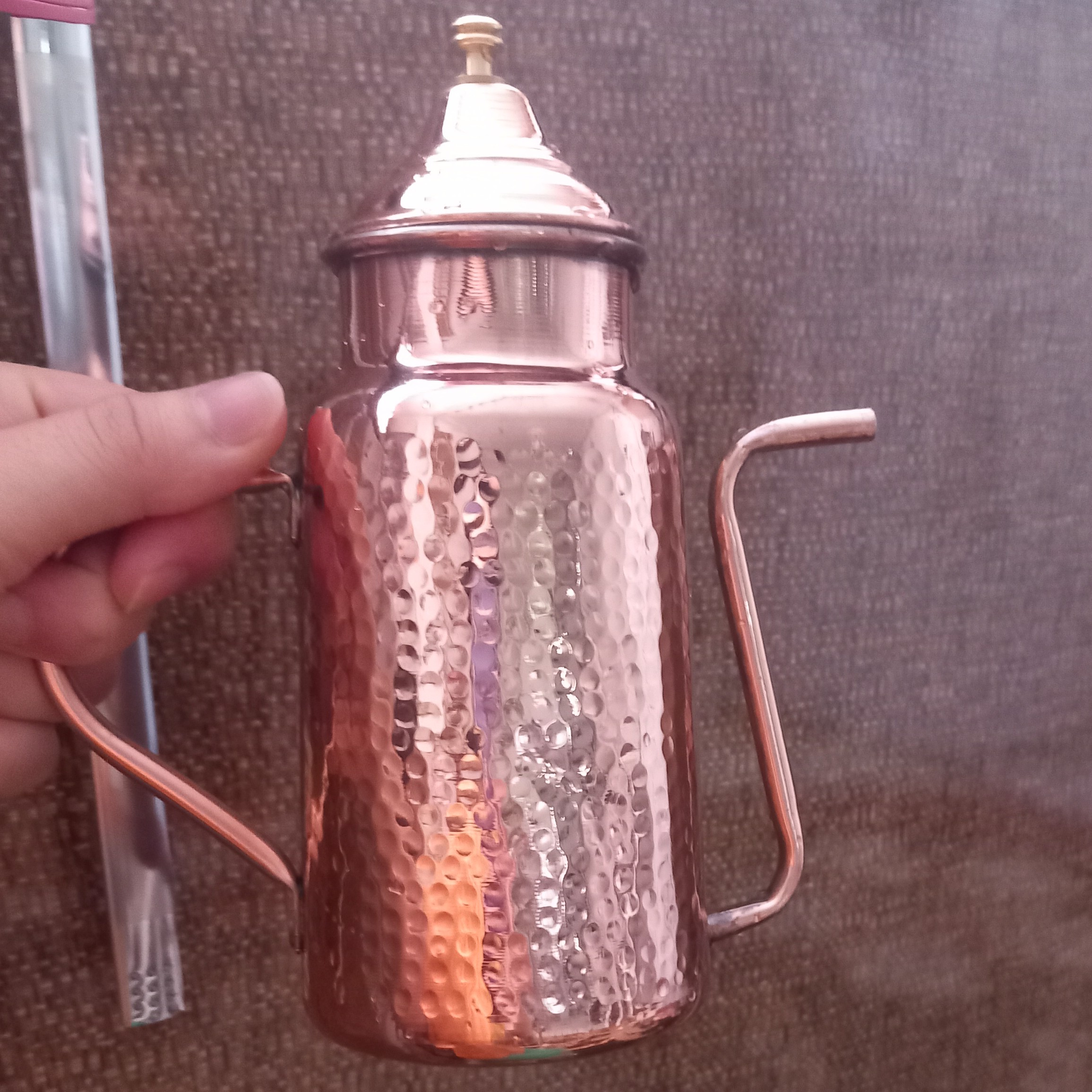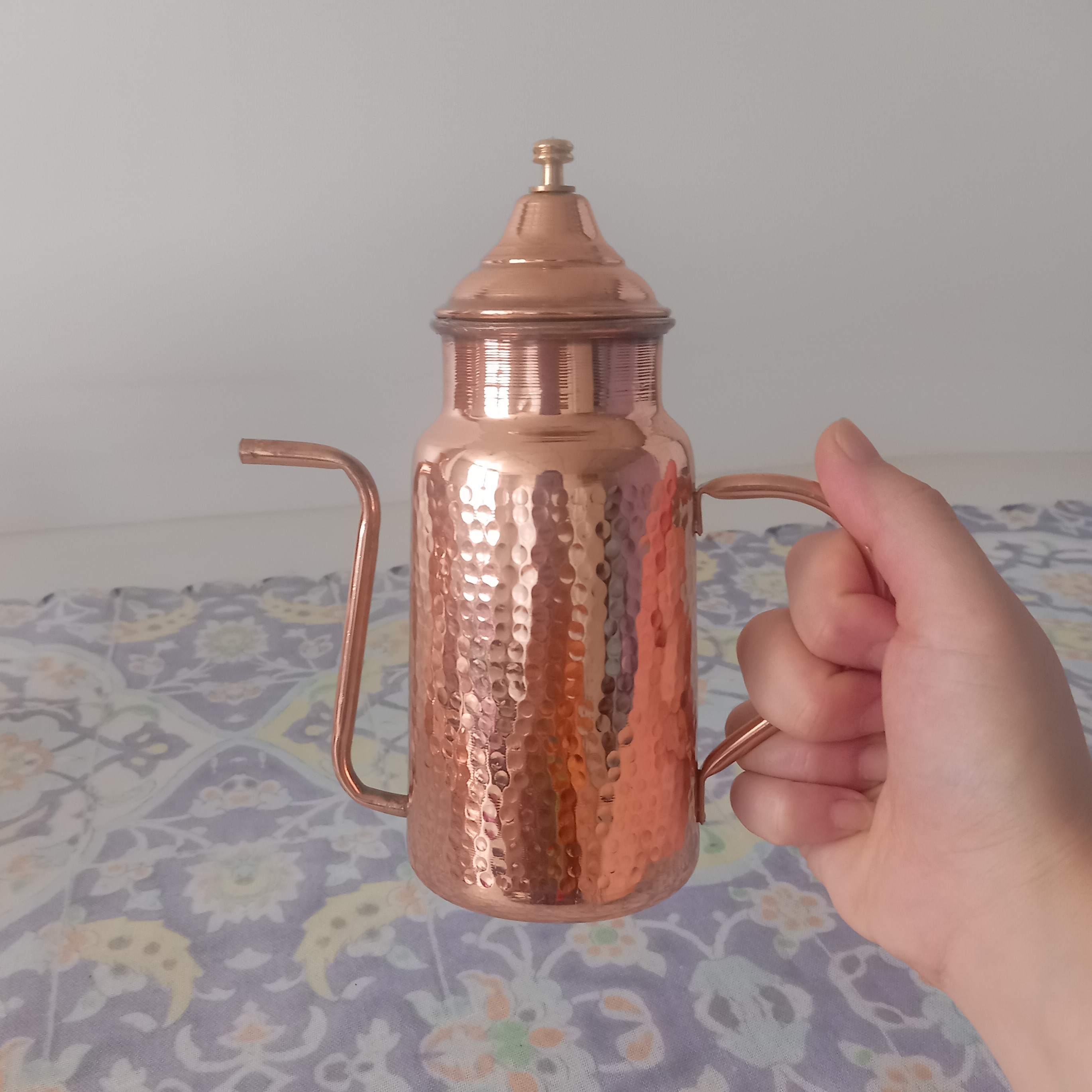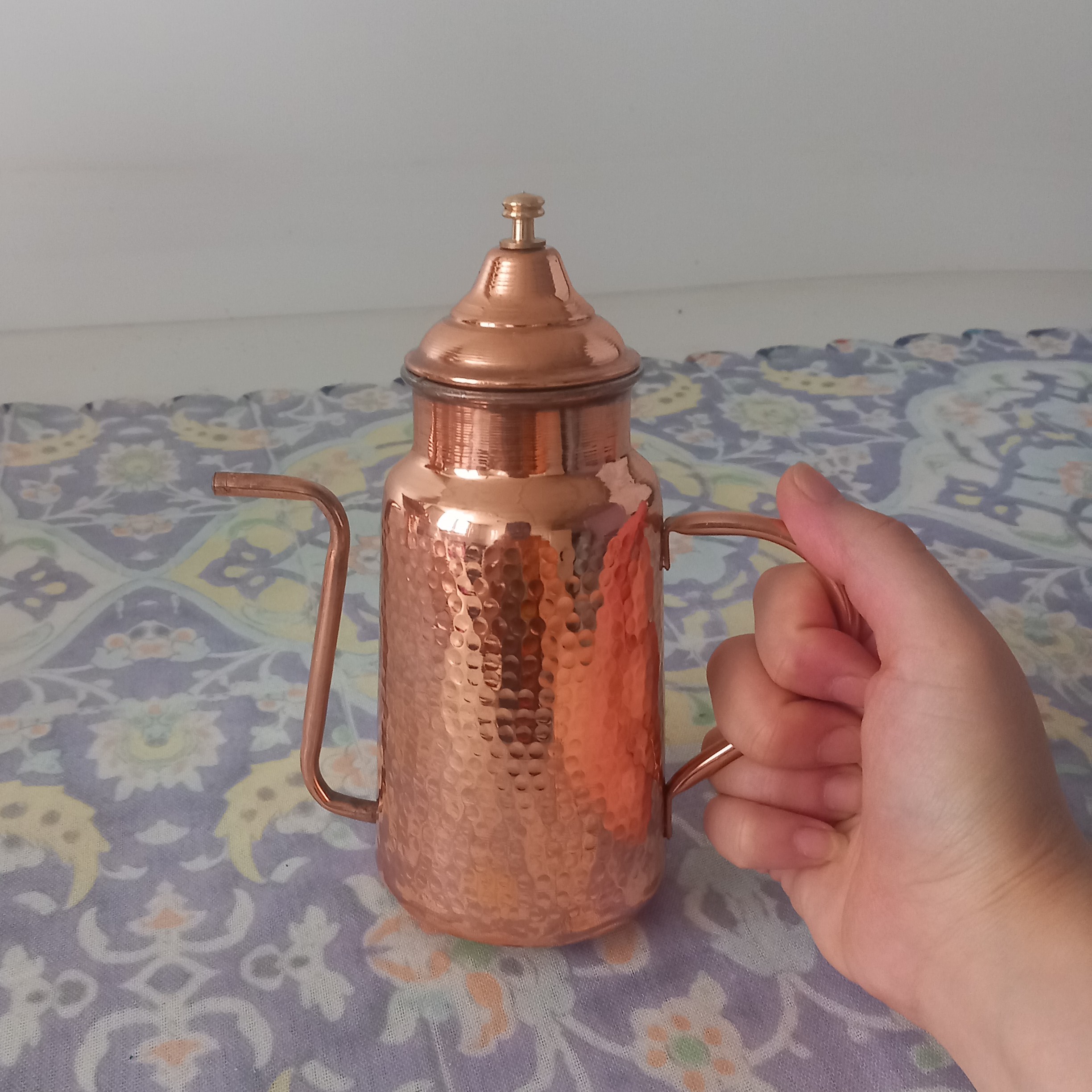 کاربرد دقیق روغنریز در آشپزی: روغنریز مسی بهطور خاص برای نگهداری و مصرف راحتتر روغنهای خوراکی طراحی شده. استفاده از این ظرف به شما کمک میکنه: کنترل مقدار مصرف روغن: بهخاطر لوله باریک و دهانه کوچکی که داره، بهراحتی میتونی مقدار روغن رو در هنگام سرخکردن یا تفت دادن کنترل کنی، بدون اینکه روغن زیادی بریزی یا به مواد غذایی آسیب بزنه. جلوگیری از آلوده شدن بطری روغن اصلی: بهجای باز و بسته کردن بطریهای بزرگ پلاستیکی یا شیشهای روغن، میتونی مقدار لازم رو داخل این ظرف بریزی و هم در آشپزی راحتتر باشی، هم از ریخت و پاش جلوگیری کنی. افزایش عمر روغن با نگهداری صحیح: درب فلزی این روغنریز باعث میشه هوا و گرد و خاک وارد ظرف نشه، در نتیجه روغن دیرتر فاسد یا بوی ماندگی پیدا میکنه. حفظ کیفیت روغن به کمک مس: فلز مس خاصیت آنتیباکتریال داره و باعث میشه روغن در شرایطی تمیزتر و بهداشتیتر نگهداری بشه. این ویژگی مخصوصاً برای روغنهایی مثل کنجد، زیتون یا حیوانی خیلی مهمه.