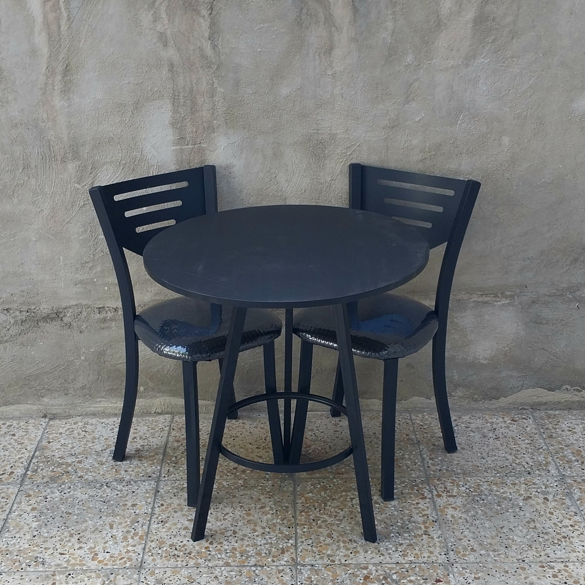 ارتفاع نشیمن 45 ، ارتفاع میز 80 ، قطر میز 70 فلز مشکی و ثابت ، رنگ بندی شامل چرم نشیمن و mdf میز میباشد