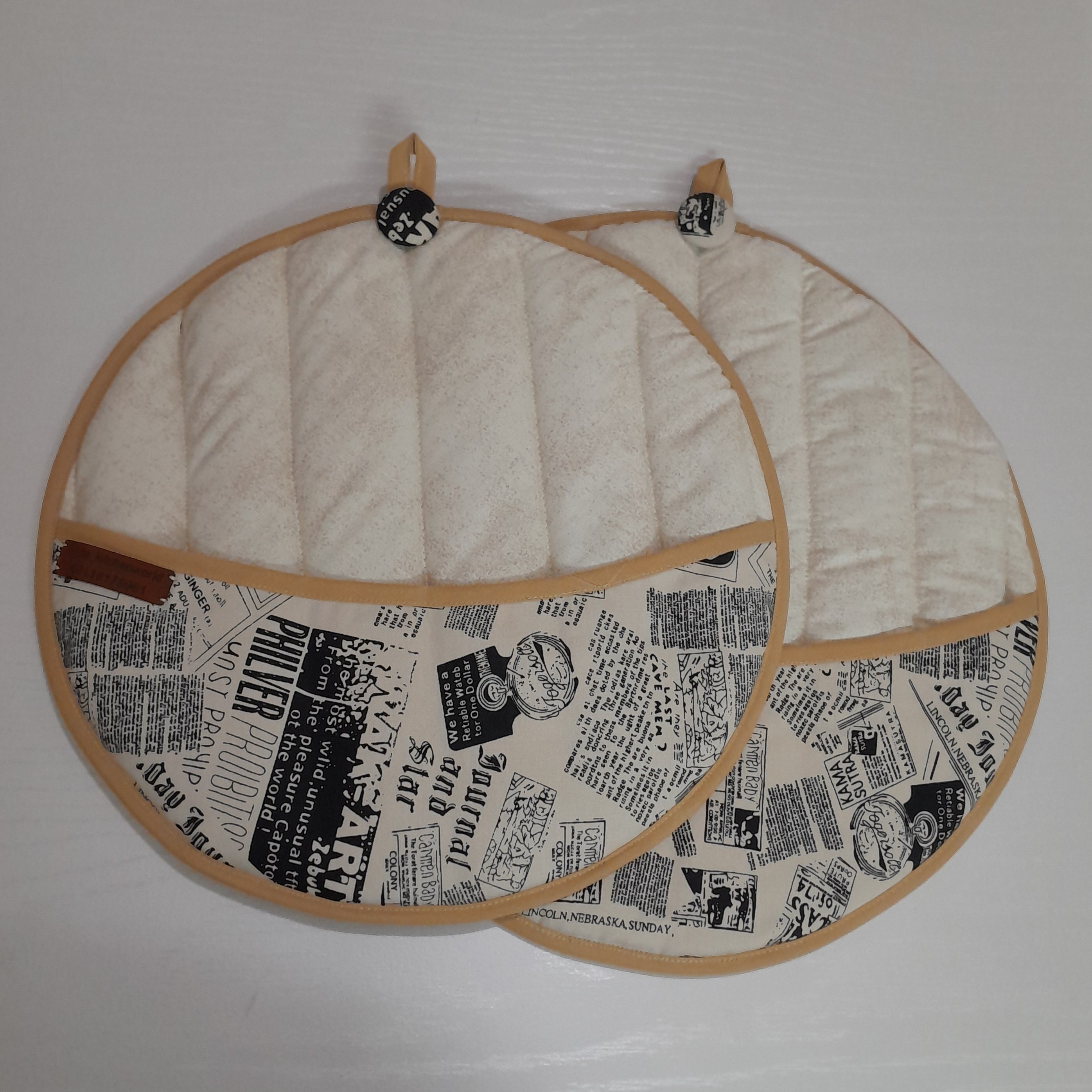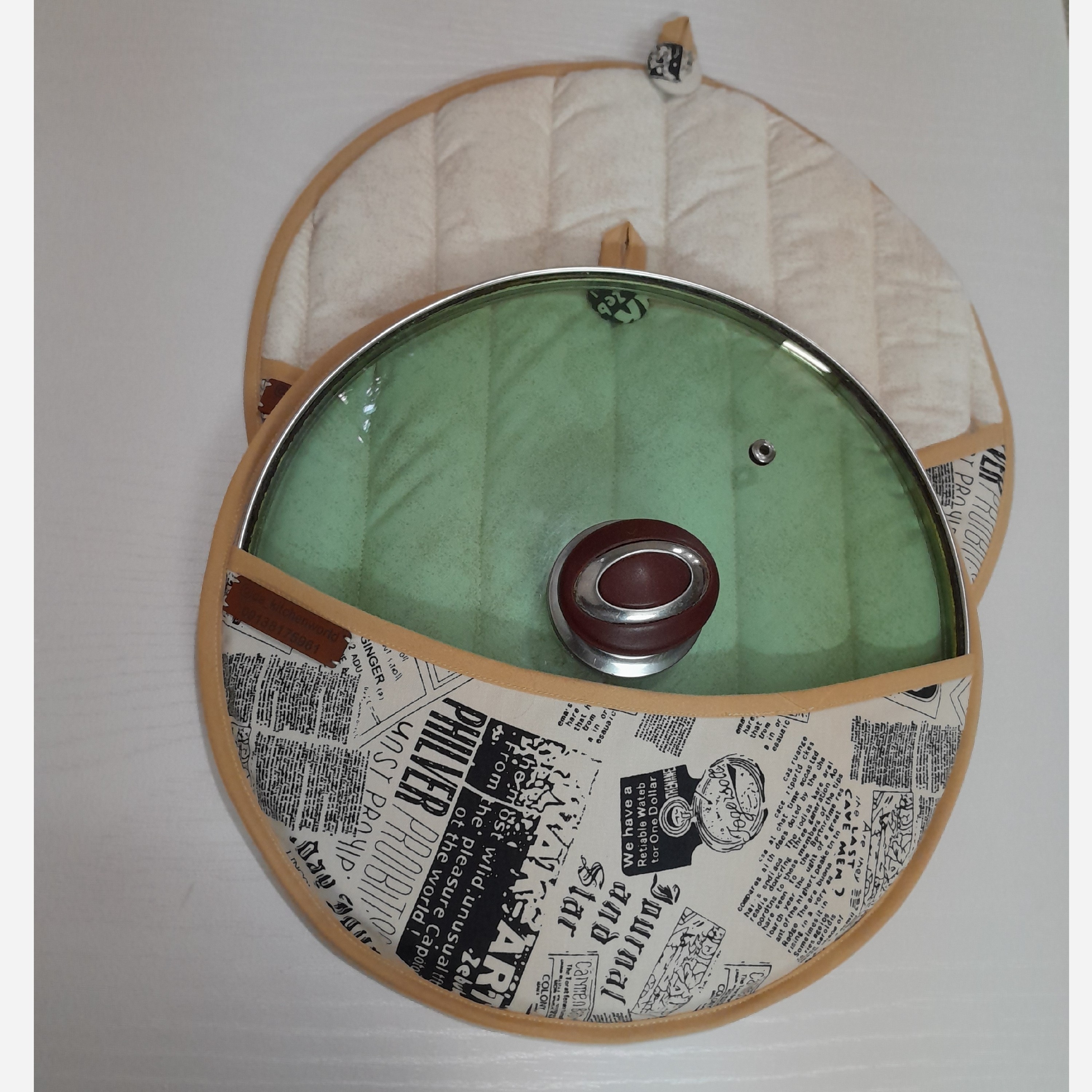 پارچه مصرفی در این محصول از جنس کتان نخ می باشد که 100٪پنبه ای بوده وعلاوه بر مقاوم بودن در برابر حرارت قابلیت جذب بالای بخار آب را دارد و در بین دو لایه از این پارچه پشم شیشه فشرده استفاده شده که آنهم در جذب رطوبت تاثیر به سزایی دارد و این محصول با نوار اریب کتان تزئین شده که علاوه بر زیباتر شدن محصول در برابر حرارت نیز مقاوم می باشد. تجربه یک آشپزی دلپذیر را با محصولات تکمیل کنید.