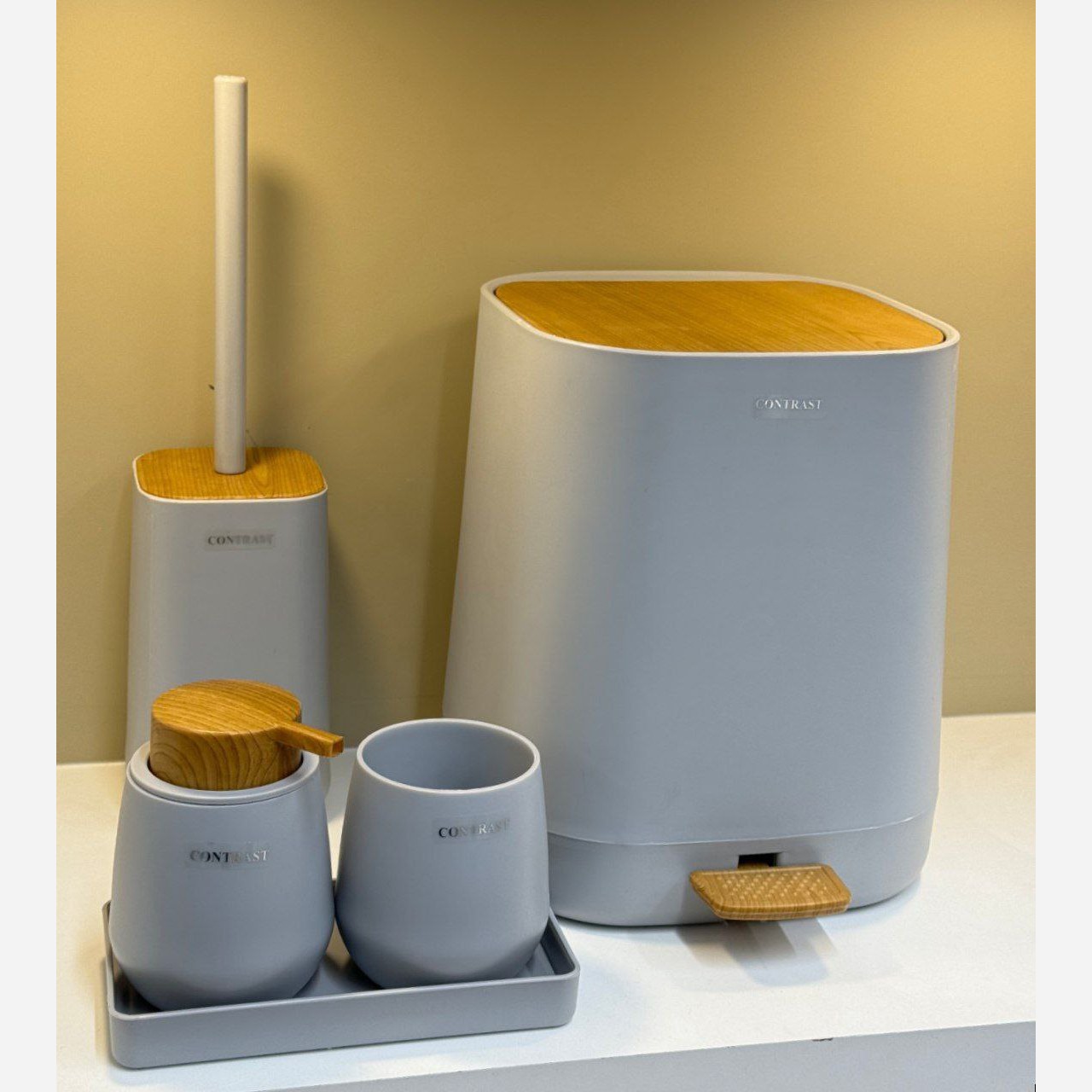 🔺️ست پنج پارچه کد9900طوسی چوب برند کنتراست 🔺️دارای قطعاتی شامل 🔺️سطل و برس،جامسواک،جامایع،جاصابون 🔺️دارای کیفیتی بالا،قیمتی رقابتی
