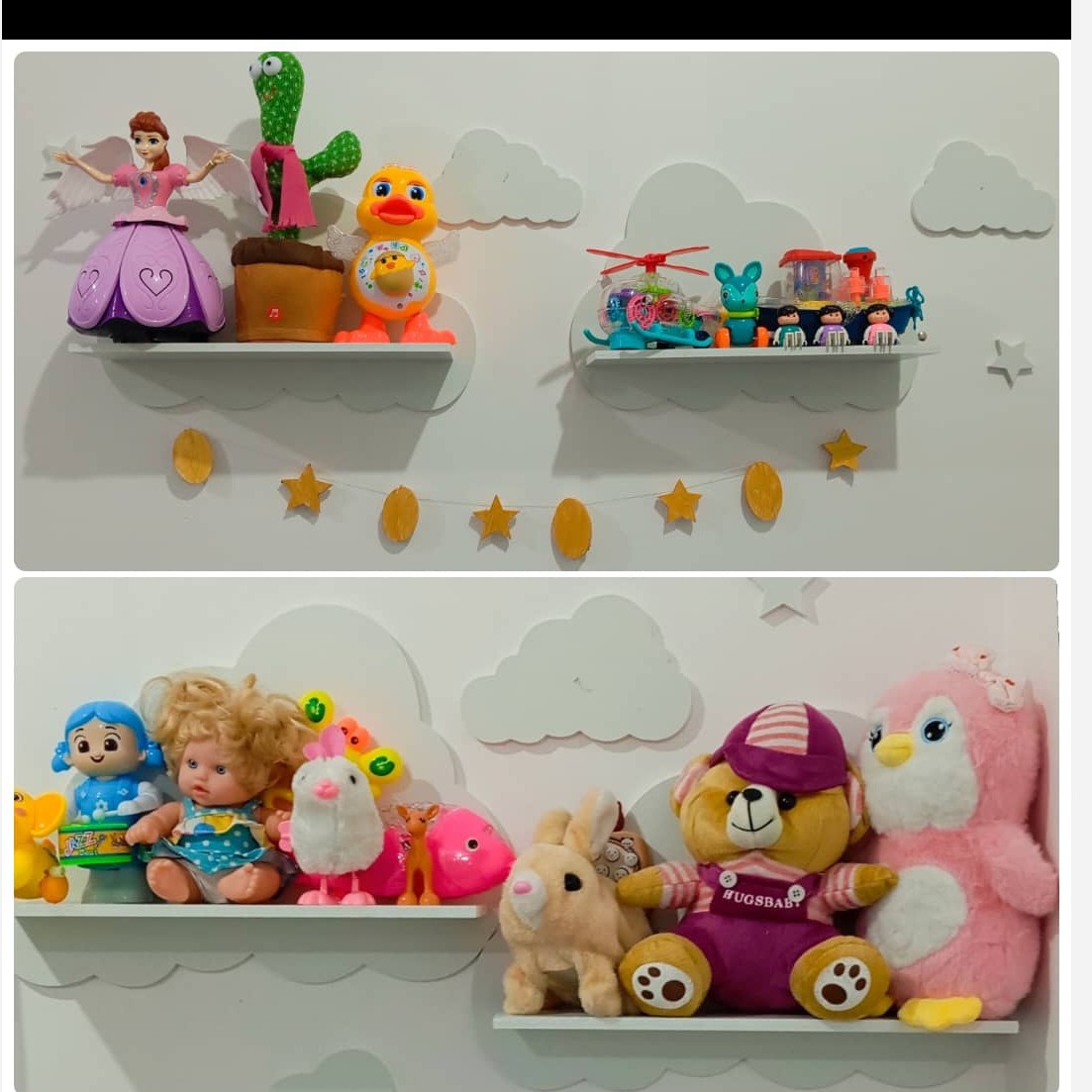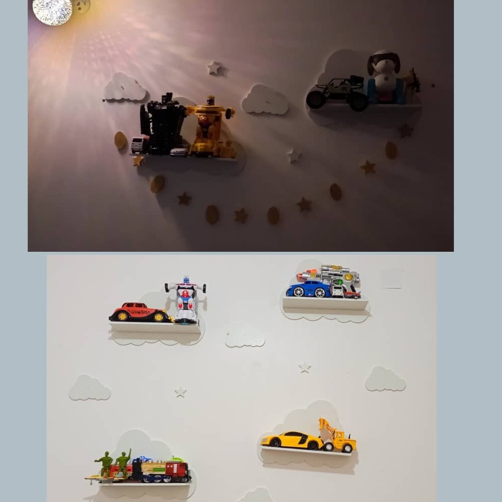 شلف دیواری بسیار زیبا مخصوص اتاق کودک با یک ابر زیبا ، یه دونه ابرک و دو دونه ستاره اتاق فرزند دلبندتو رویایی کن..... اسباببازی ها و ماشینهاشو به زیبایی بچین.... برای نصب ابتدا ابر بزرگ را روی دیوار نصب بفرمایید سوراخهای مخصوص نصب کنار شکافهای روی ابر بزرگ قرار دارد پس از نصب ابر بزرگ روی دیوار نوک زبانههای پیشخوان را کمی فشرده کرده و وارد شیارهای ابر بزرگ میکنید و به حالت طاقچهای مونتاژ میشود بعد میتوانید ابرک و ستارهها را روی دیوار یا لبه شلف با هر چسبی که در منزل موجود است بچسبانید
