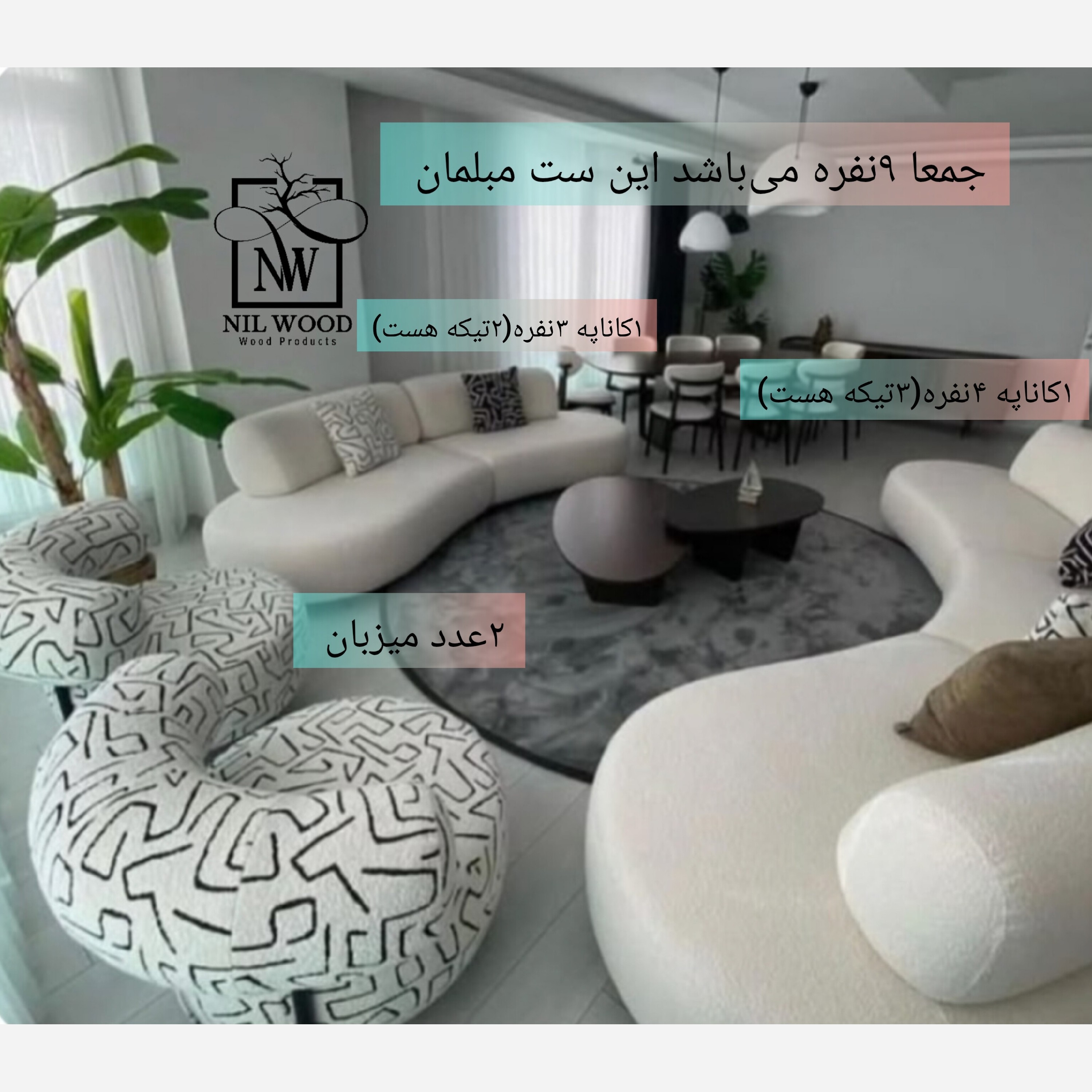 🌹❤️در اين غرفه حق هميشه با مشتري است❤️🌹 ✅ضمانت 24ماهه کلاف و نشیمن✅ ✅کنار این مبلمان میتوانید میز ناهارخوری و جلومبلی ست کار رو هم از ما خریداری کنید✅ اسفنج:كف 35كيلويي اسفنج پشتی ها:30كيلويي ✅ترکیب کار:9نفره کاناپه 3نفره 1کاناپه 4نفره 2عدد تک نفره✅ جلومبلی صفحه دار جنس چوب: ترکیب سفید و روس تغییر رنگ پارچه و پايه هيچ تفاوتي در قيمت ندارد قيمت ذكر شده با پارچه تدی خارجی می باشد✅ كيفيت كار تضميني هست و در صورتي كه به دست مشتري گرامي برسه و شبيه به عكس ها نباشه یا کیفیت پایین باشد ميتوانند مرجوع كنند✅ توضيحات كار تكميل مي باشد✅ ارسال به تمام نقاط ايران عزيز✅ هزينه ارسال به عهده مشتري گرامي مي باشد و درهر شهر متفاوت است،با ارسال نام شهر يا شهرستان در قسمت گفتگو از هزينه دقيق اطلاع پيدا كنيد