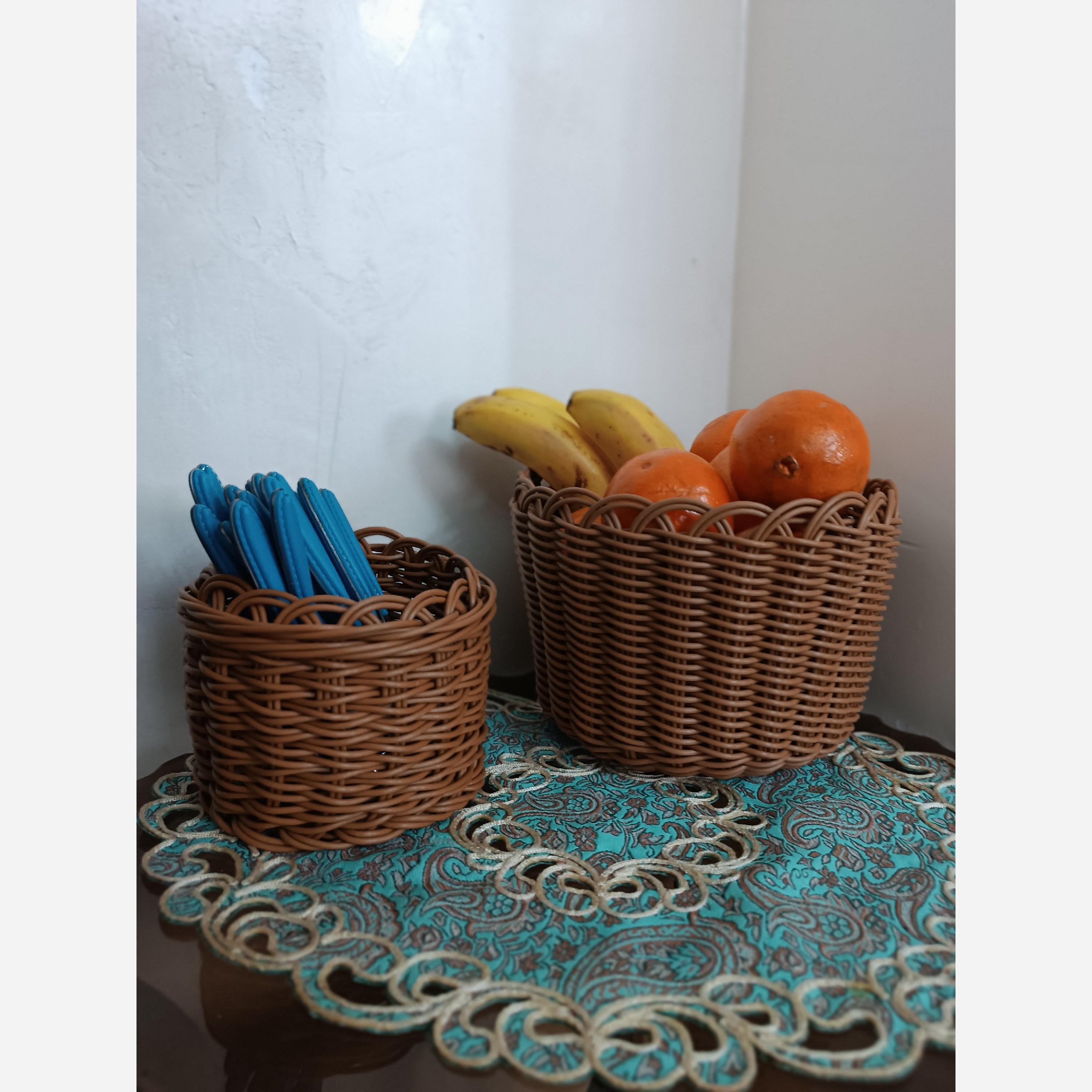 سبد میوه این سبد مناسب میوه و سبزی میباشد و جا چاقویی مناسب برای جای چاقو و قاشق چنگال و جا قلم و جای گلدان این کار قابل شستشو مناسب پیکنیک و مسافرت و باغ هست ماری بسیار محکم قیمت سبد ها جداگانه پرسیده شود