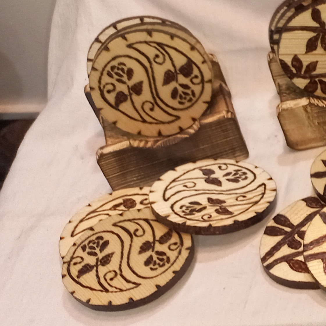 این محصول چوبی تماما با دست ساخته شده و در هیچ مرحله ای از لیزر و دستگاه استفاده نشده. قطر دایره 9 سانت 6 عدد همراه با استند