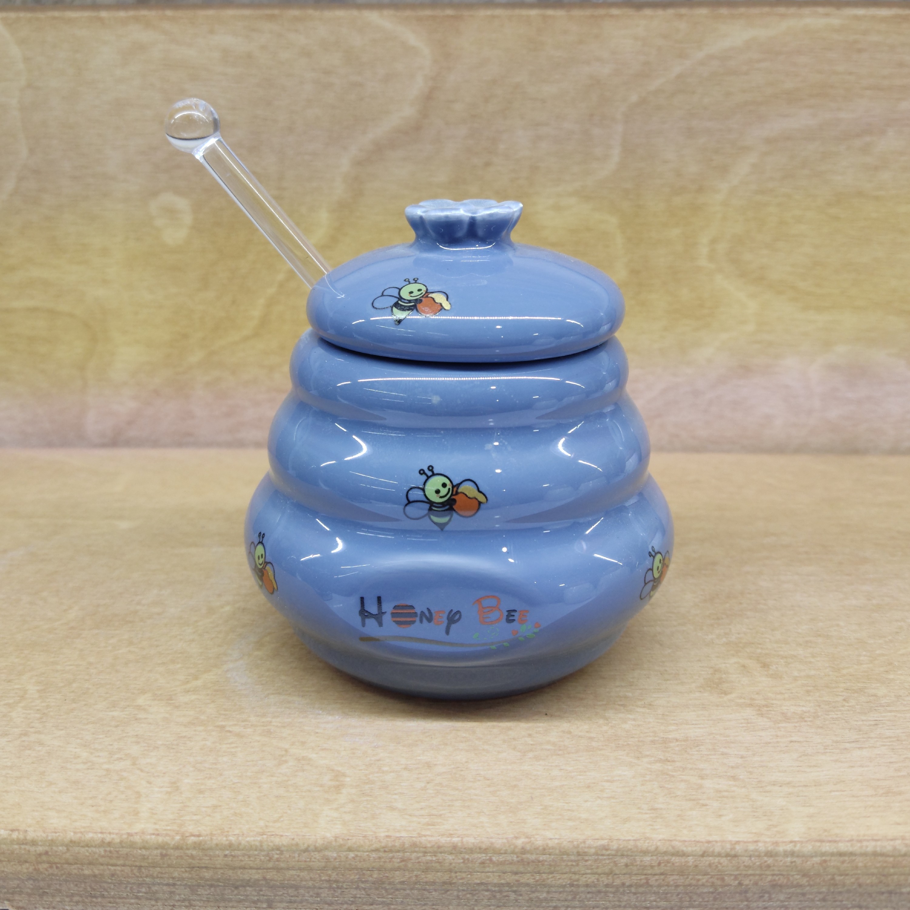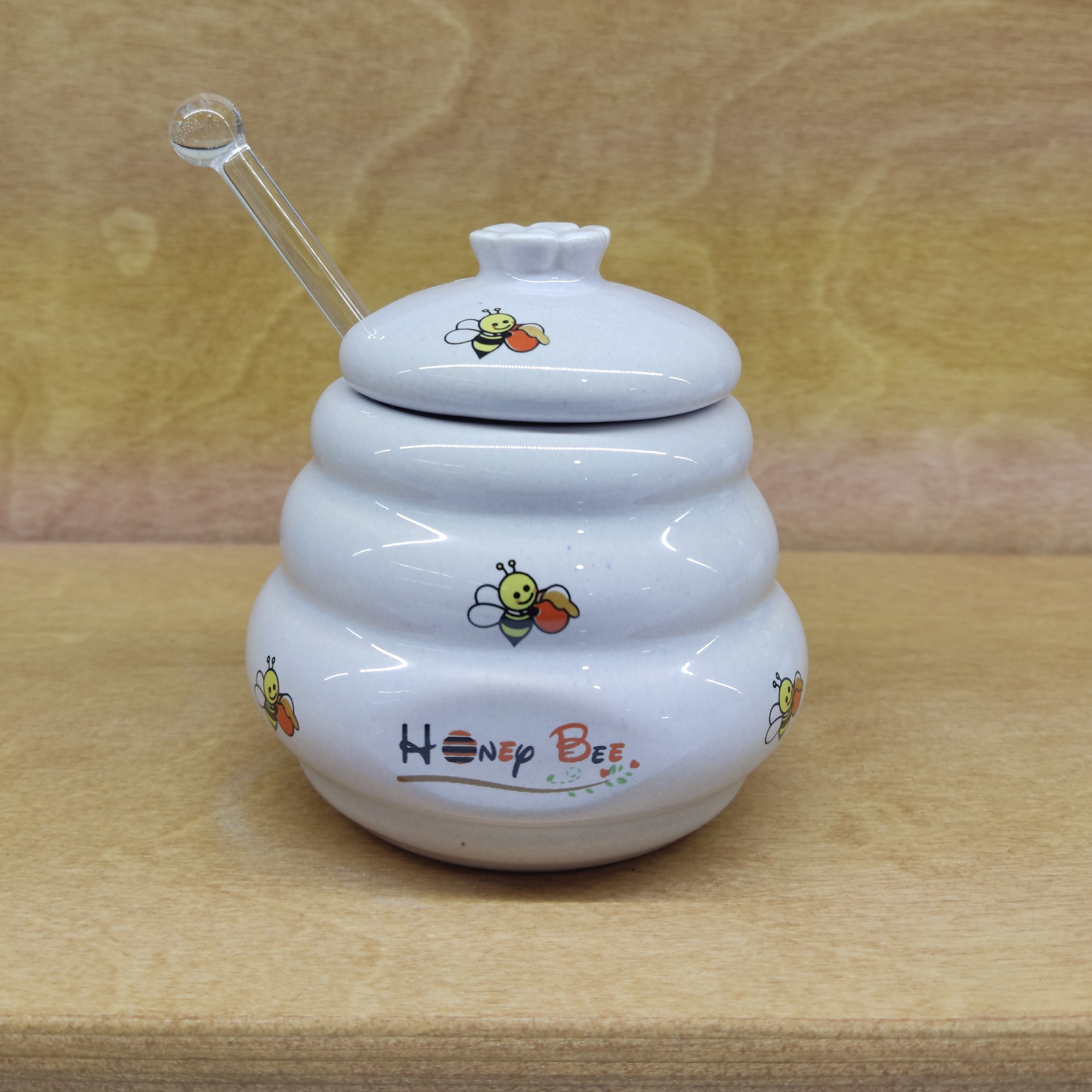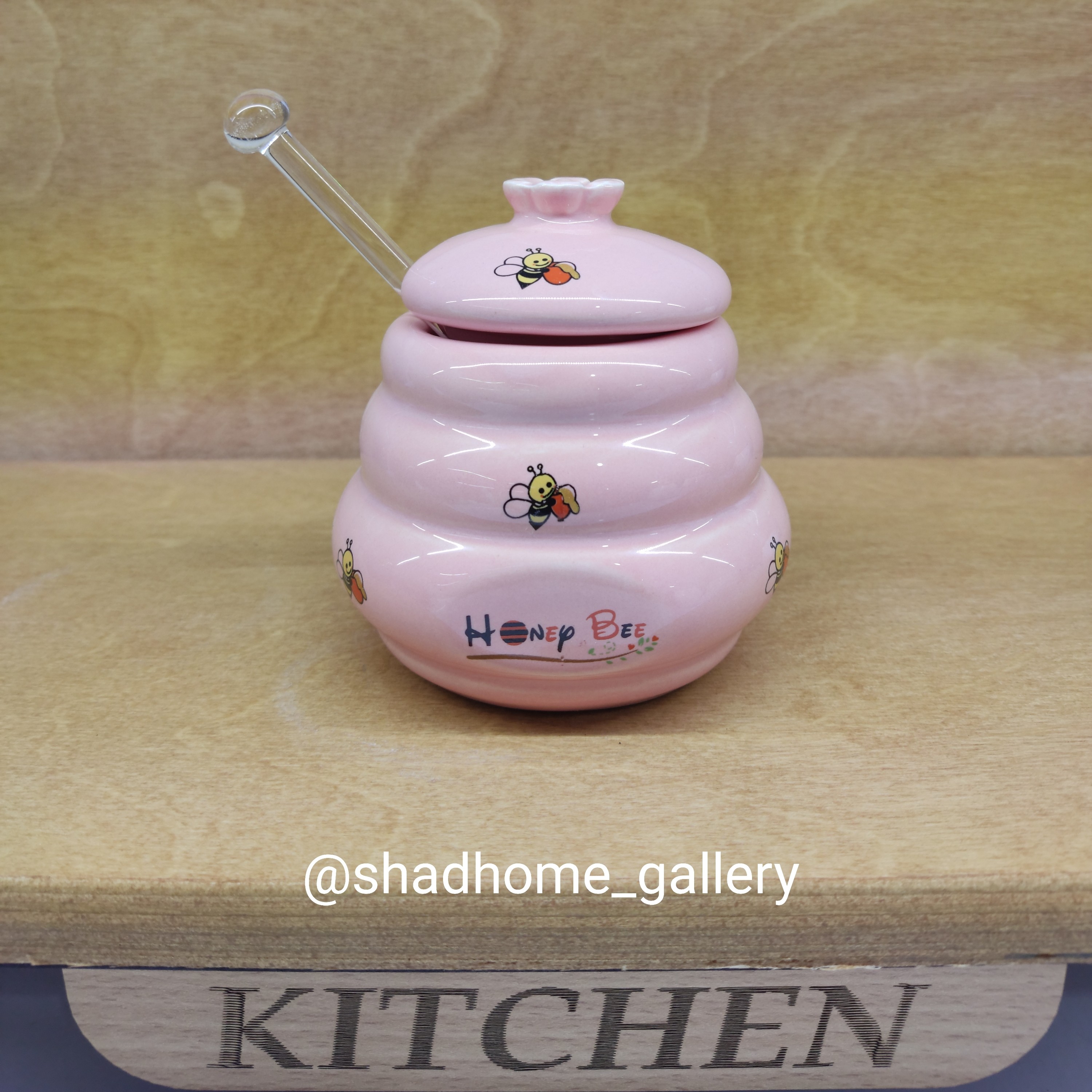 ظرف عسل سرامیکی طرح کندو در رنگ بندی های مختلف و همراه با قاشق شیشه ای.
