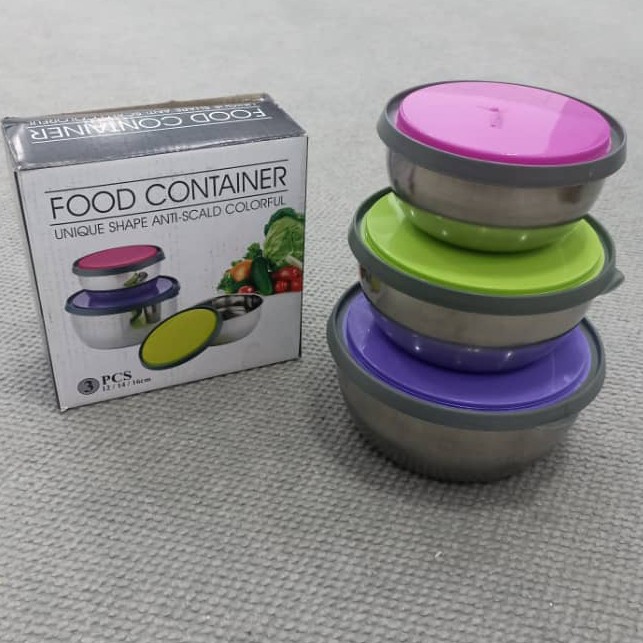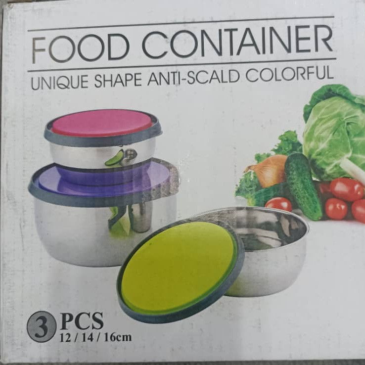 ظرف غذا استیل سه تیکه درب رنگی سیلیکونی سه سایز 12 و 14 و 16 سانتیمتر