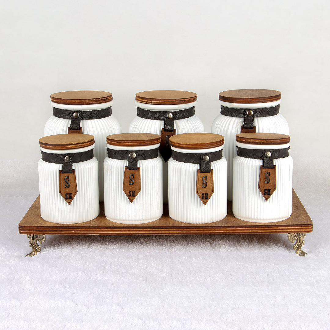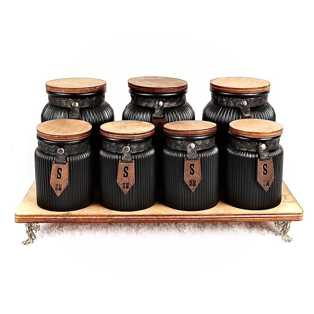 هفت پارچه ادویه و پاسماوری متناسب برای مصرف های روزانه دارای استند و درب چوبی بسیار شیک و با کیفیت دارای سه تا بانکه بزرگ و چهار تا بانکه کوچک