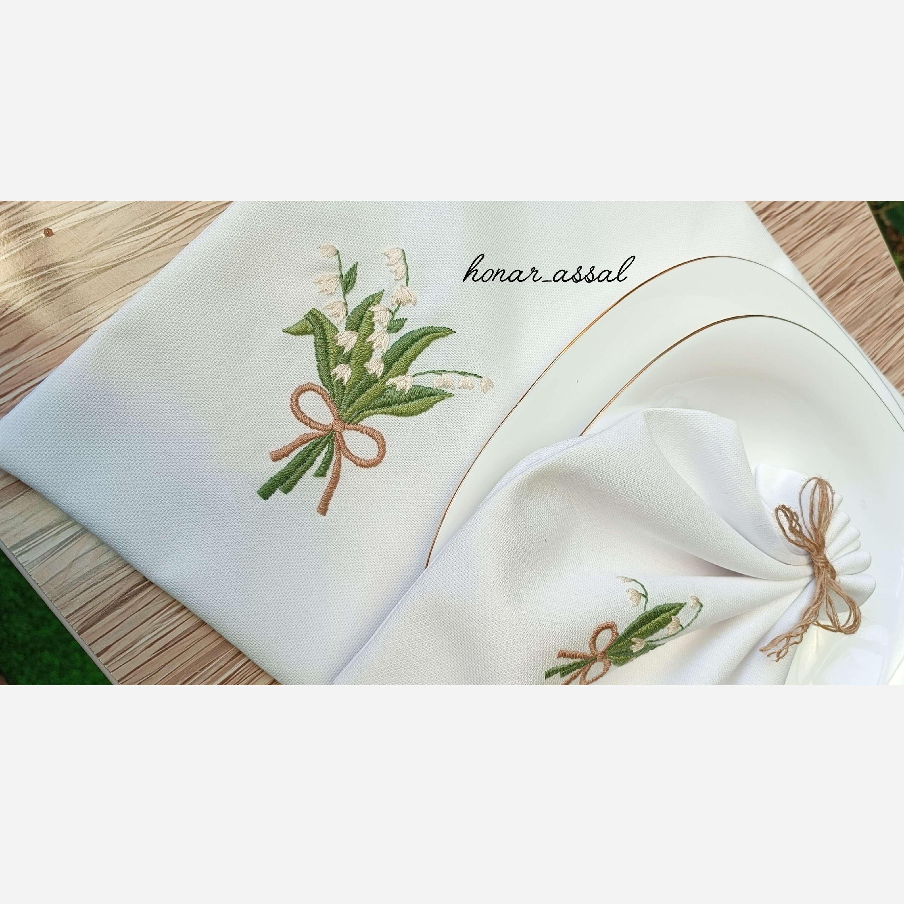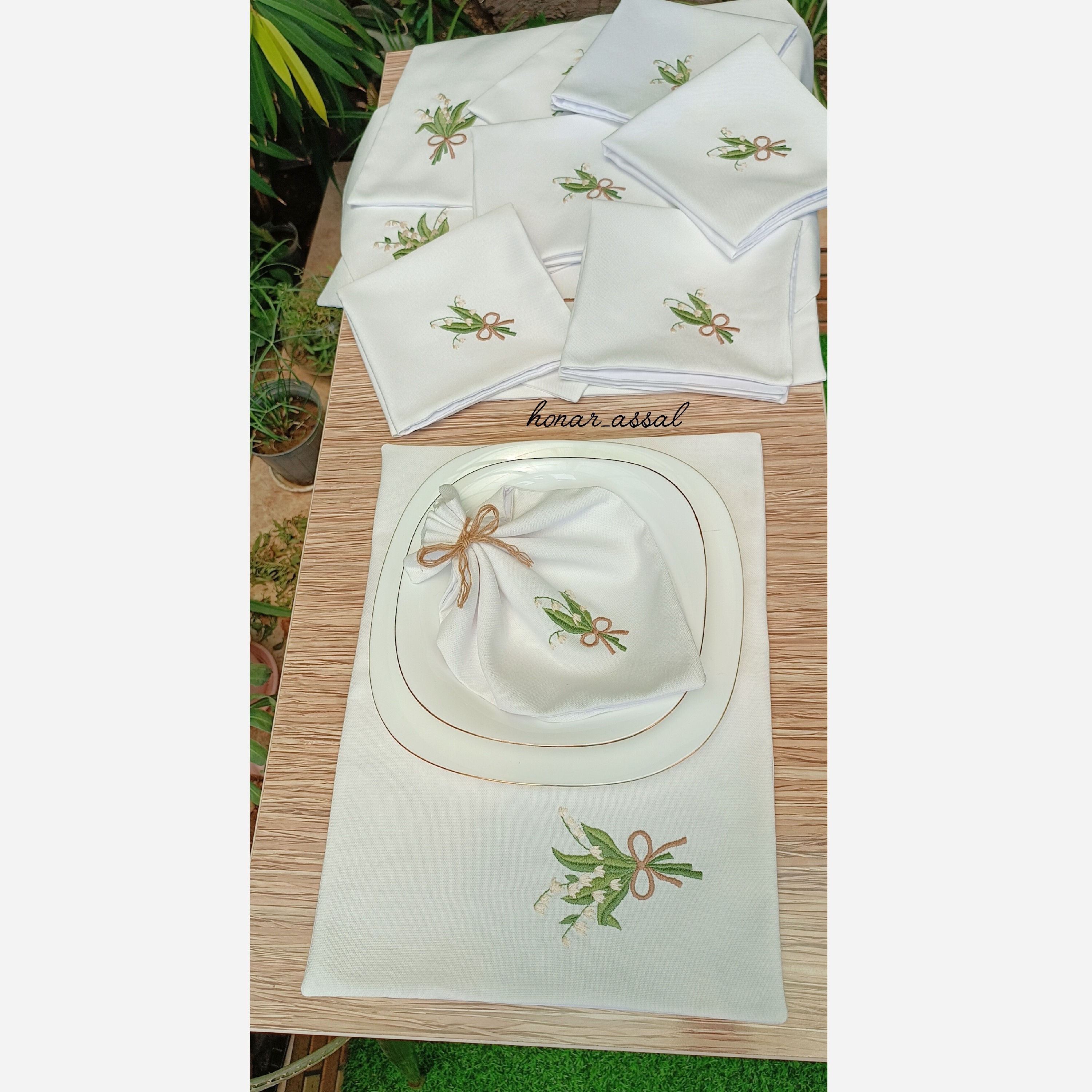 جنس پارچه هاران ترک گلدوزی شده با نخ دمسه ابعاد رانر 40در140 ابعاد زیر بشقابی 30در40 ابعاد دستمال سفره 35در35 گلدوزی شده با دست آستردوزی شده