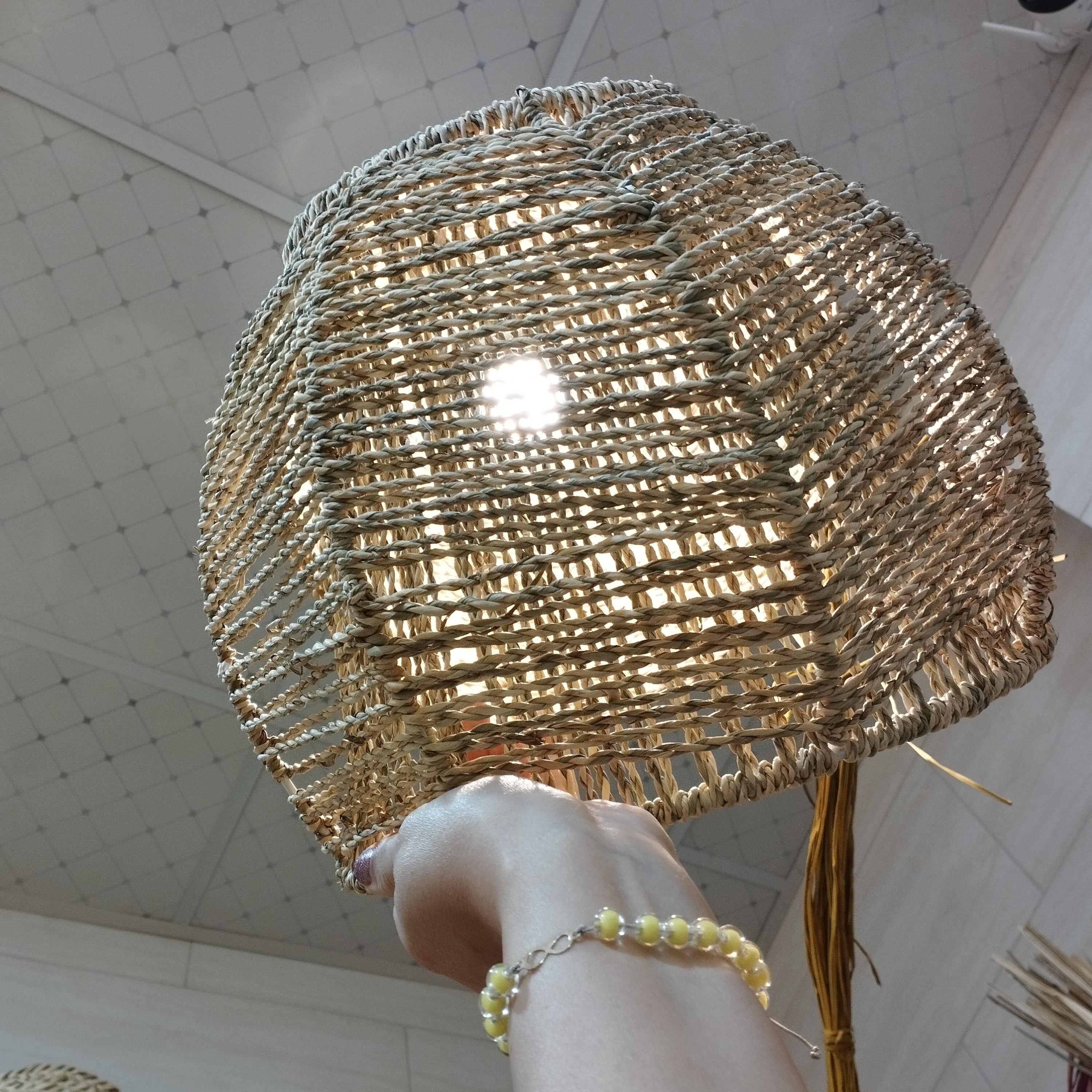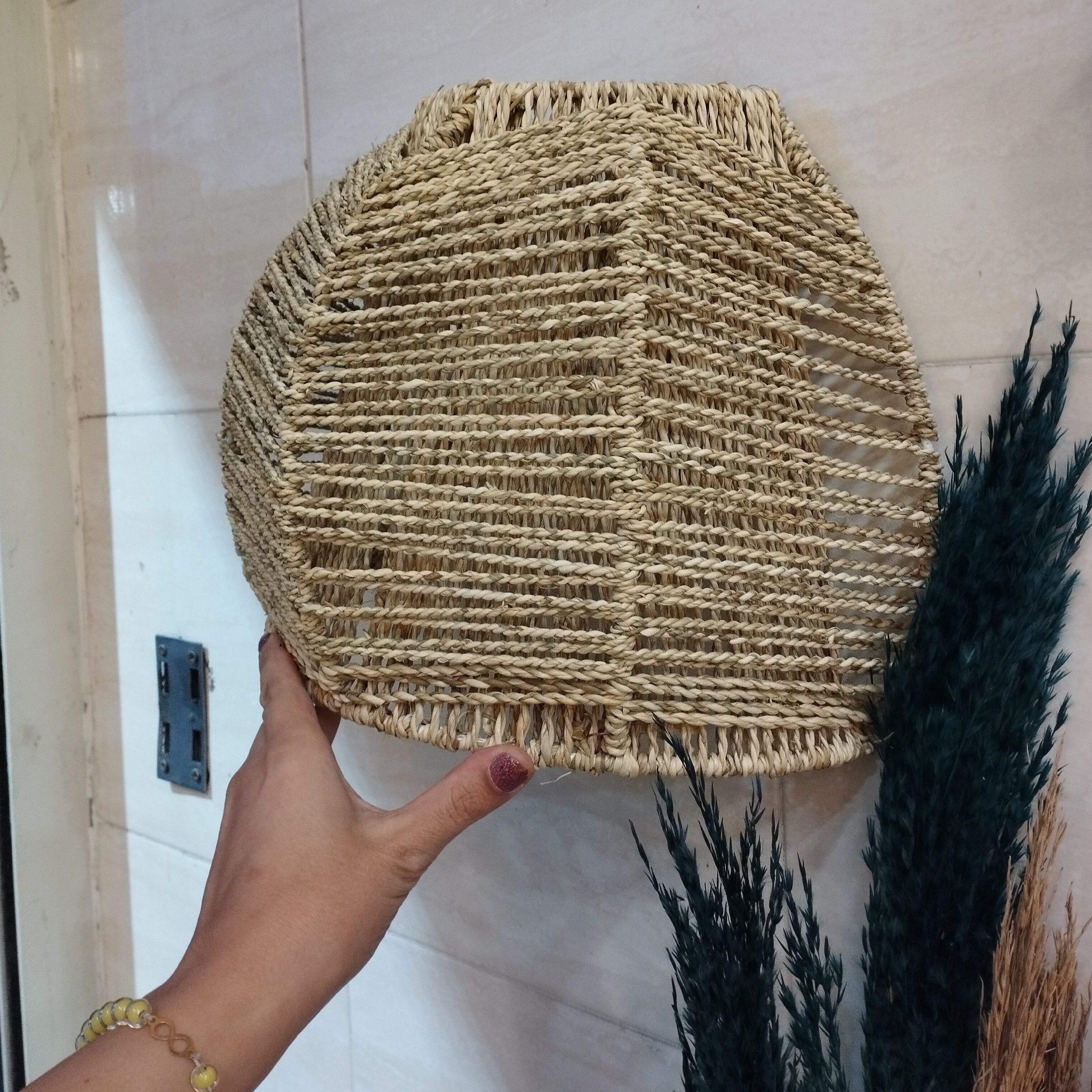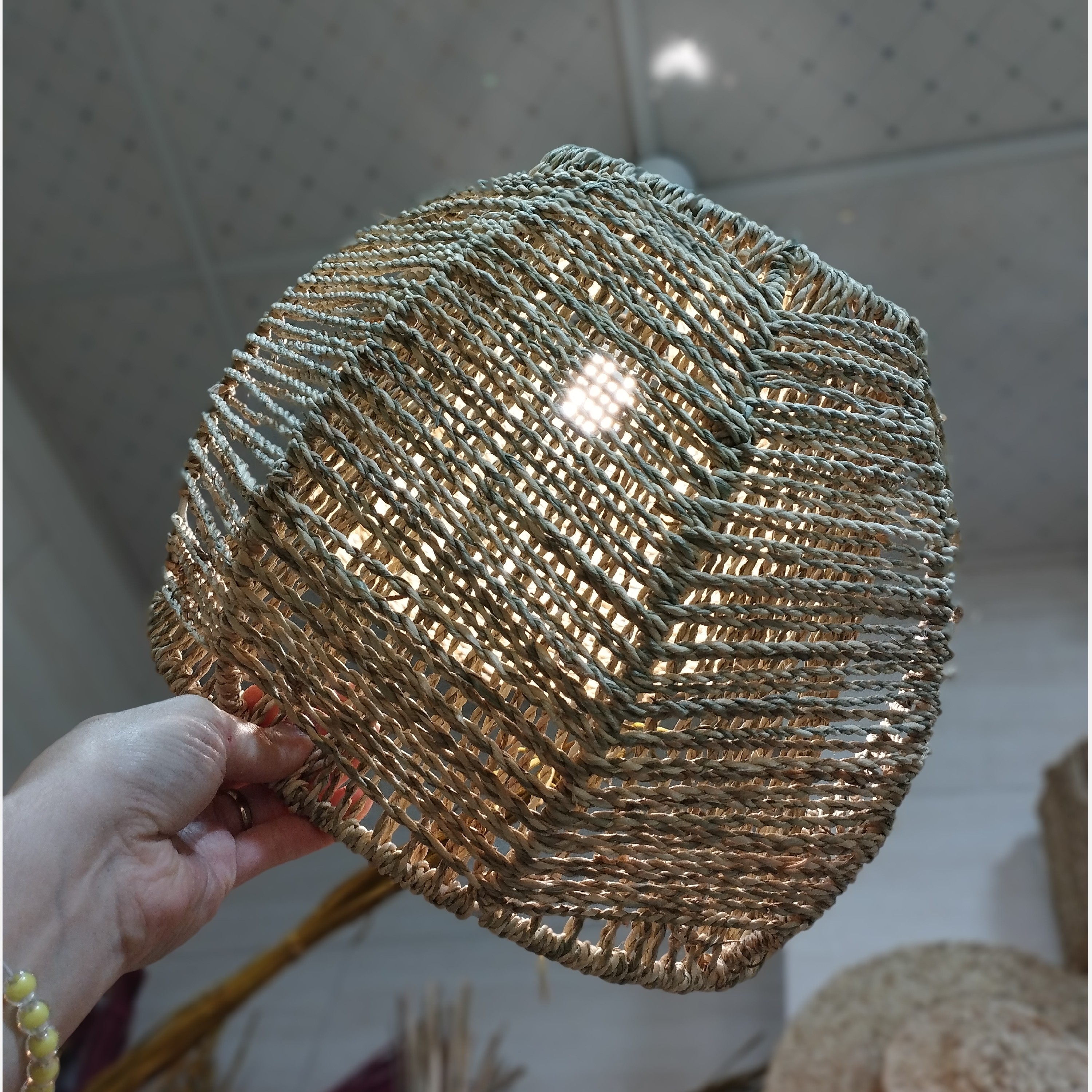 لوستر نیم دایره بافت شطرنجی با نوردهی عالی بافته شده با گیاه گالی و قابل شستشو یه کار طبیعی و لوکس تولید کننده محصولات حصیری آدرس: رشت، بلوار بهشتی، روبرو سازمان صنعت و معدن، حصیرگیلدخت 09118472571