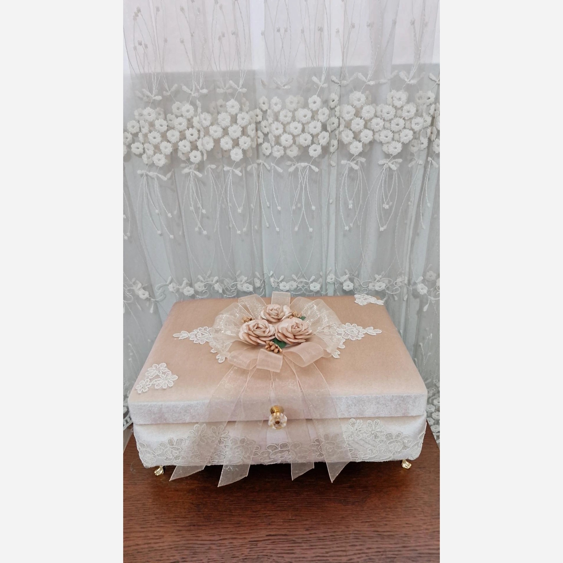 صندوقچه مخملی با تزئین دانتل تُرک و گل تُرک و روبان مناسب چیدمان هدایای عروس ،نظم دهنده عطر و ادکلن،جانماز،چادر، کیف پول ،اکسسوری و .... این کار پایه فلزی هم دارد که قابل حذفه... خرید بی واسطه از تولید کننده