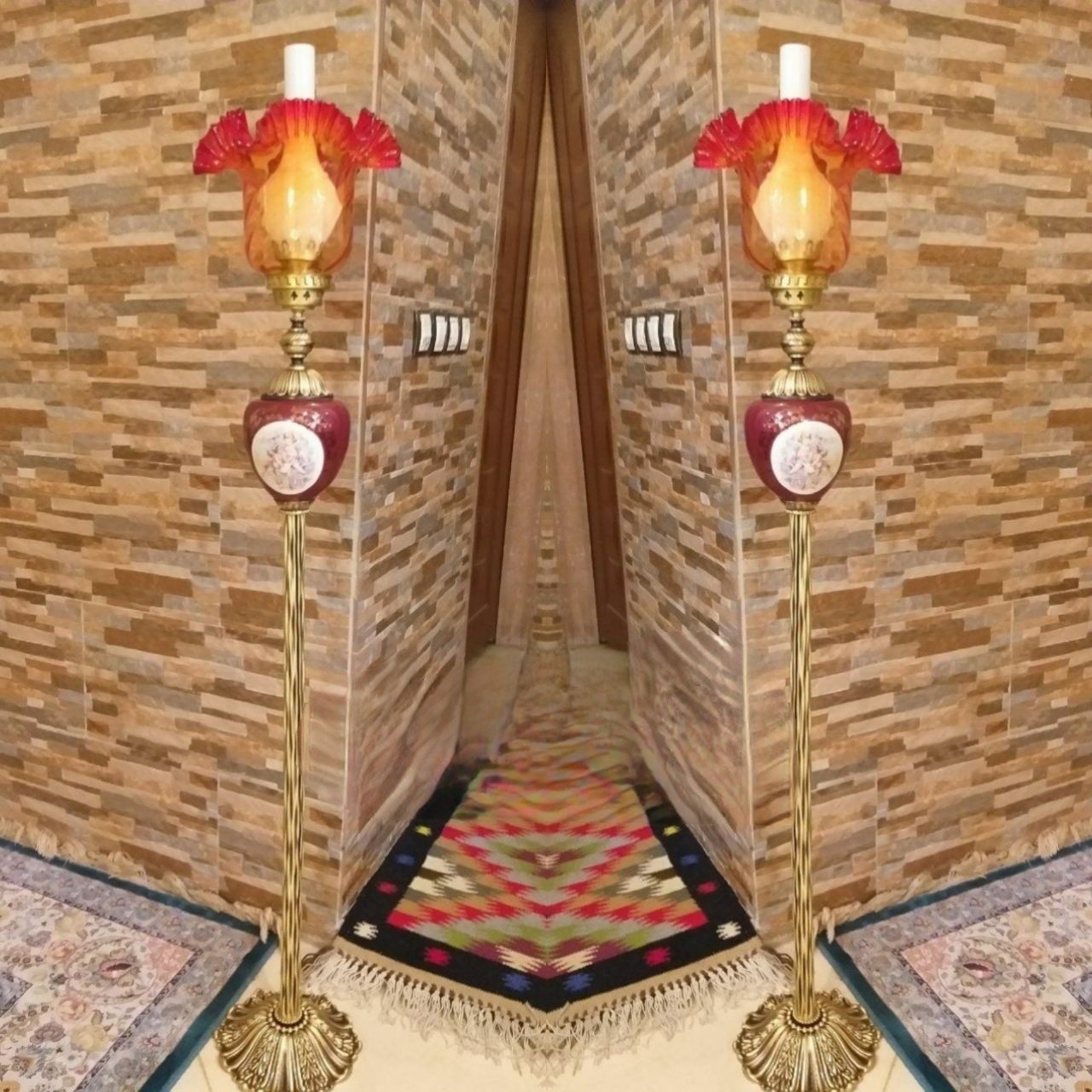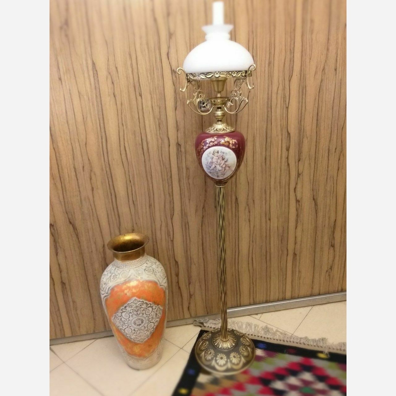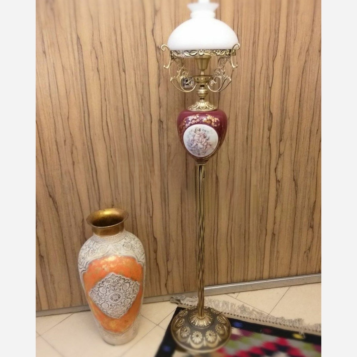 آباژور کنار سالنی ایستاده لمپا لنتر چینی برنز چراغ حباب دار شمعدان آنتیک برنزی برنجی پایه سنگ چراغ نفتی مبلمونسرا مدل 233439