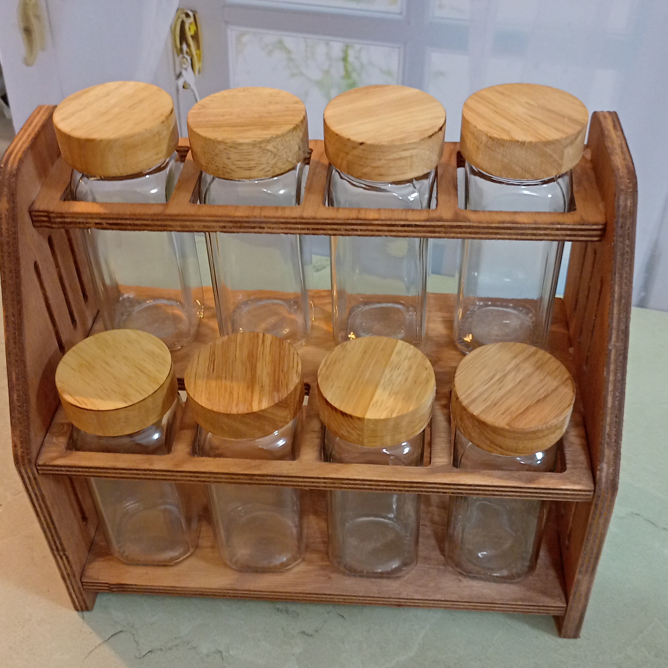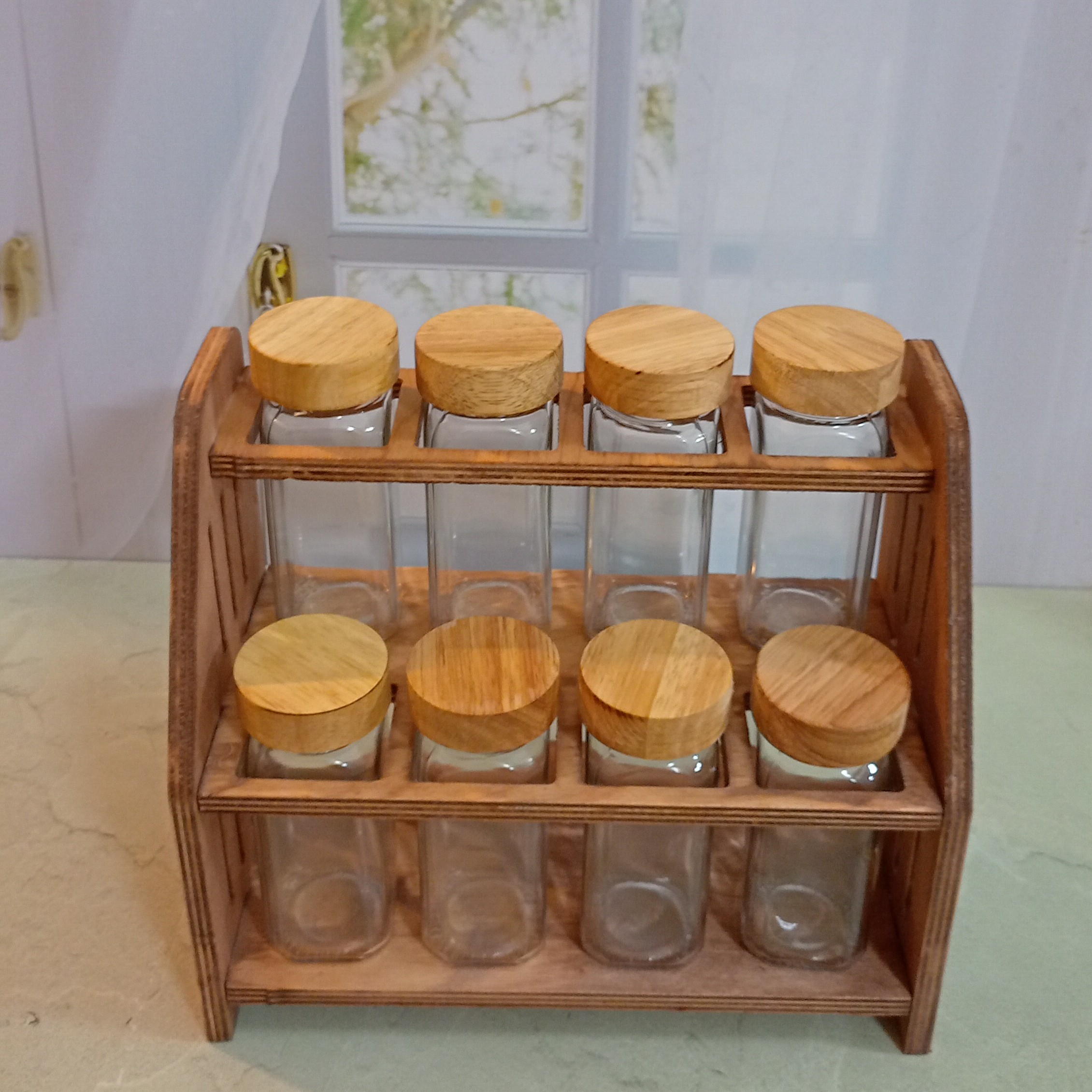 این پک شامل شیشه درب چوبی 14سانت : 8 عدد سری نمک پاش : 8 عدد لیبل خام : 8 عدد ارتفاع استند : 23 سانت