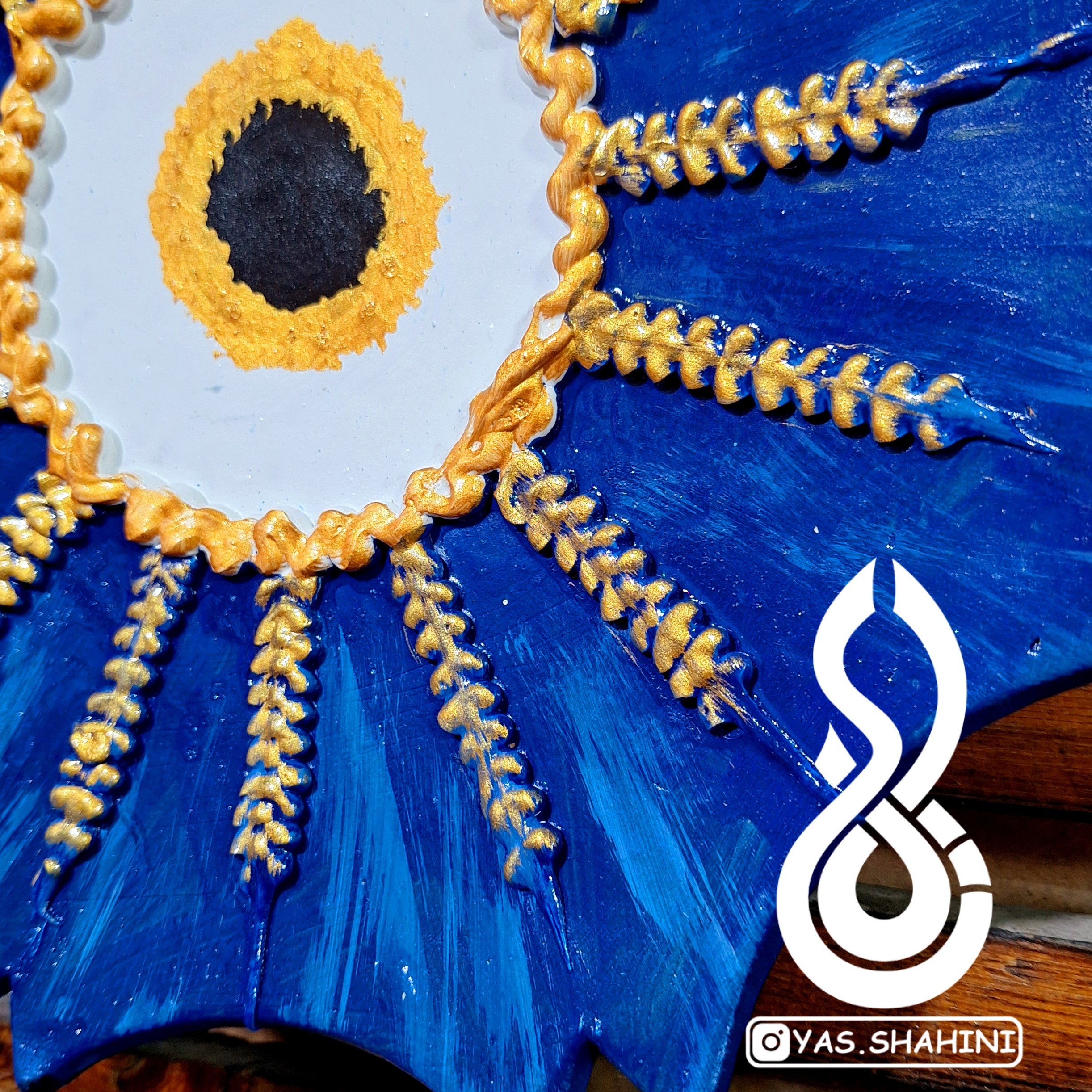 دیوارکوب سفالی که به رنگچشم زخم طراحی و اجرا شده و قسمت هایی از کار برجسته هست . پشت کار گیره اویز داره . روکش براق قابل گردگیری دارد .