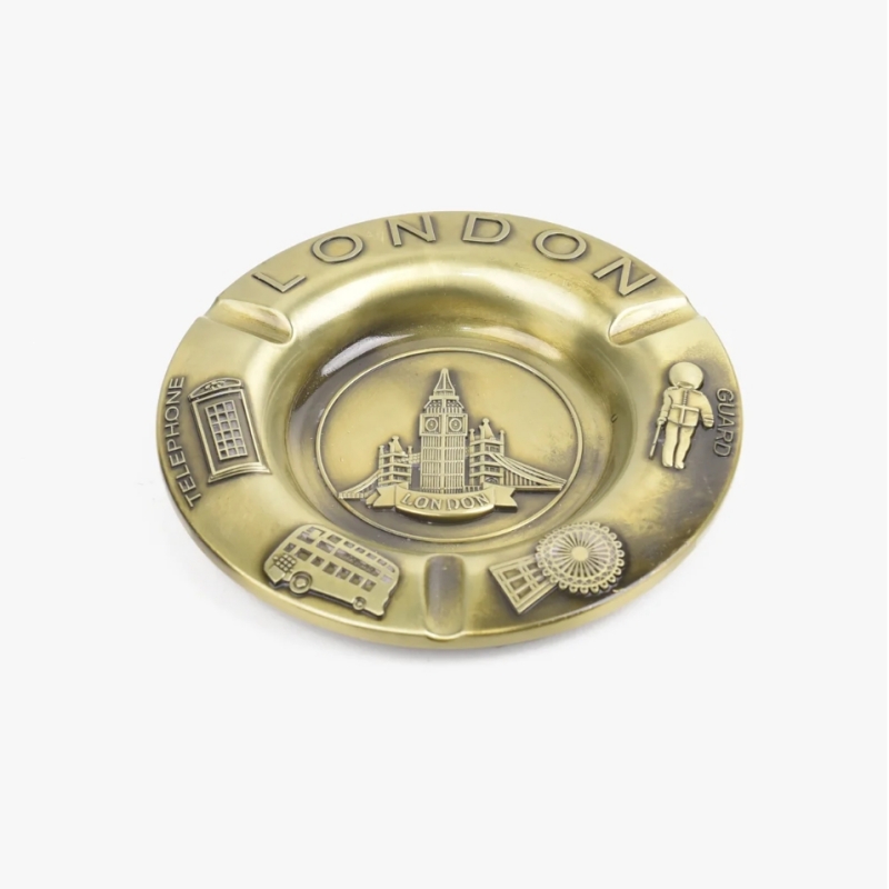 این زیرسیگاری فلزی دکوری با طراحی برجسته و دقیق از نمادهای شهری لندن، انتخابی خاص برای علاقهمندان به کلکسیونهای دکوری یا یادگاریهای شهری است. در مرکز این مدل گرد، برج معروف بیگبن و پل لندن دیده میشود و در اطراف آن عناصر نمادین مثل اتوبوس دوطبقه، چرخ و فلک لندن، تلفن قرمز و سرباز سلطنتی بهصورت برجسته حک شدهاند. جنس فلزی و رنگ آنتیک برنجی، حس کلاسیک و خاصی به این محصول داده است.