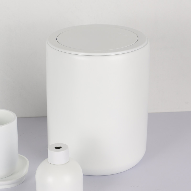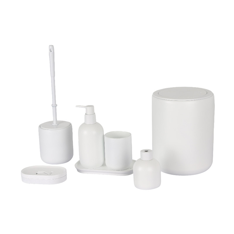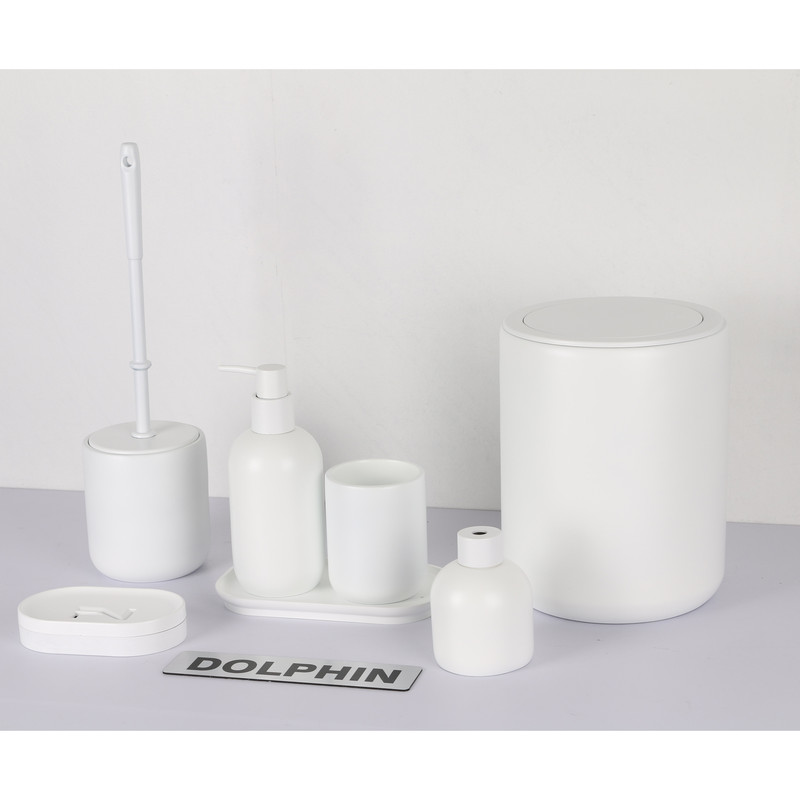 ست سرویس بهداشتی دکوراتیو از پلی رزین درجه یک ساخته شده است. ست تشکیل شده از، جای صابون، جای مسواک، سطل، توالتشور، جای مایع، و ظرف خشبوکننده به همراه سینی میباشد. ست رومیزی ضد زنگ و ضد باکتری است که مزیت بزرگی در سرویس بهداشتی است. طراحی مینیمال این محصول مناسب برای هر دکوری در سرویس بهداشتی میباشد. این محصول مناسب برای هدیه، جهیزیه و ایجاد یک دکور زیبا وایدهآل میباشد.