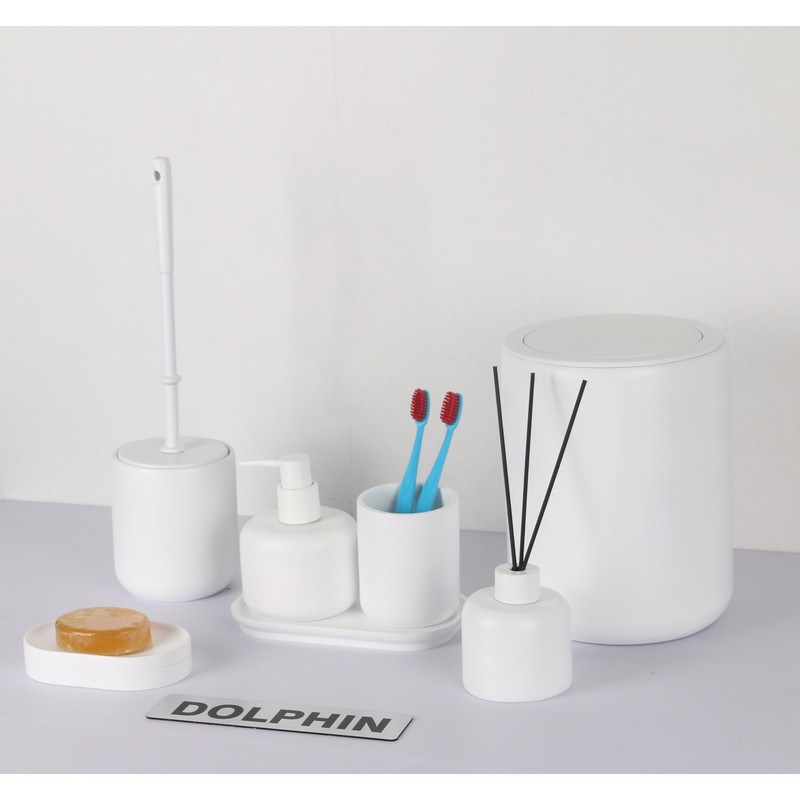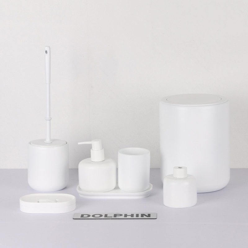 ست سرویس بهداشتی دکوراتیو از پلی رزین درجه یک ساخته شده است. ست تشکیل شده از، جای صابون، جای مسواک، سطل، توالتشور، جای مایع، و ظرف خشبوکننده به همراه سینی میباشد. ست رومیزی ضد زنگ و ضد باکتری است که مزیت بزرگی در سرویس بهداشتی است. طراحی مینیمال این محصول مناسب برای هر دکوری در سرویس بهداشتی میباشد. این محصول مناسب برای هدیه، جهیزیه و ایجاد یک دکور زیبا وایدهآل میباشد.