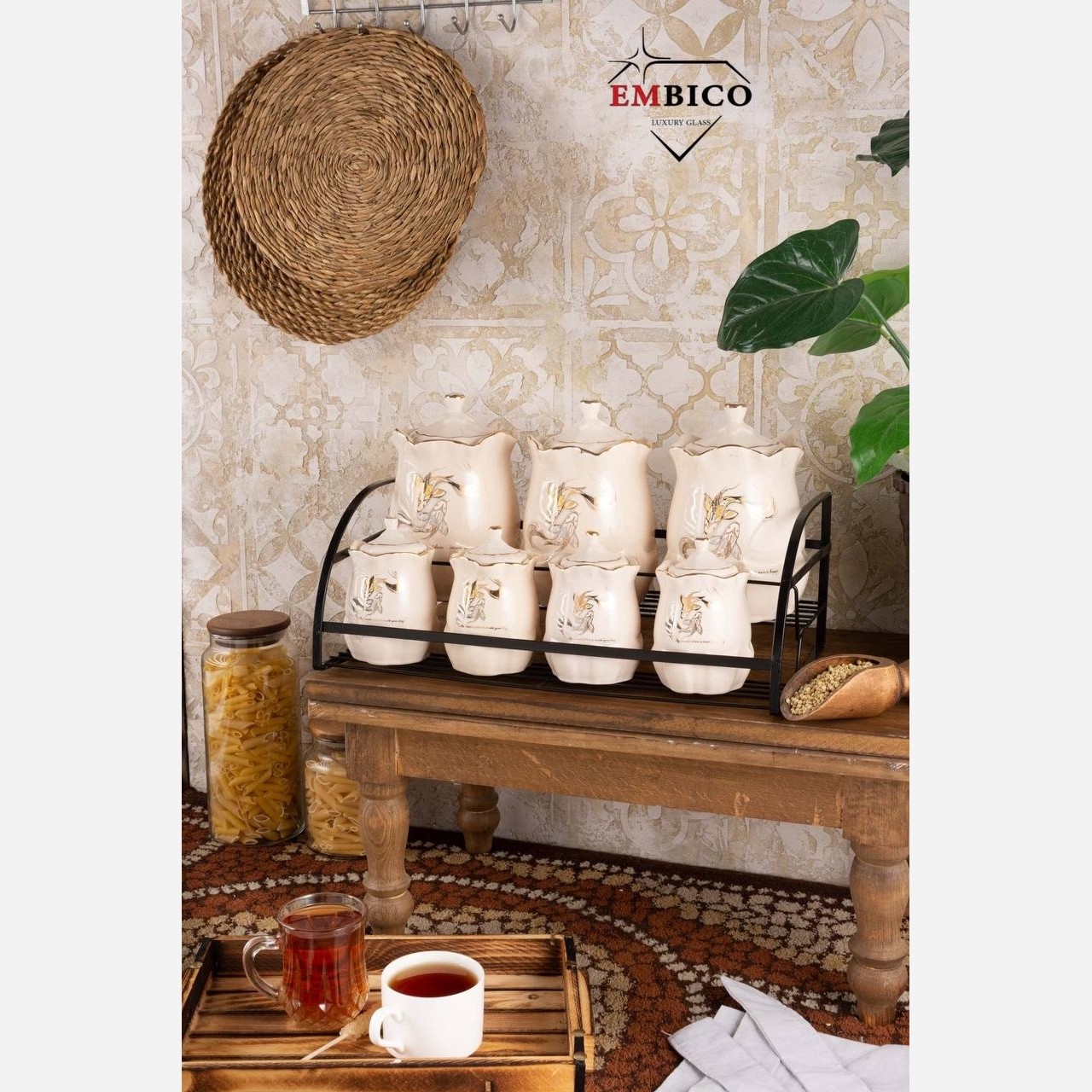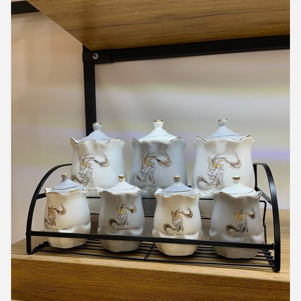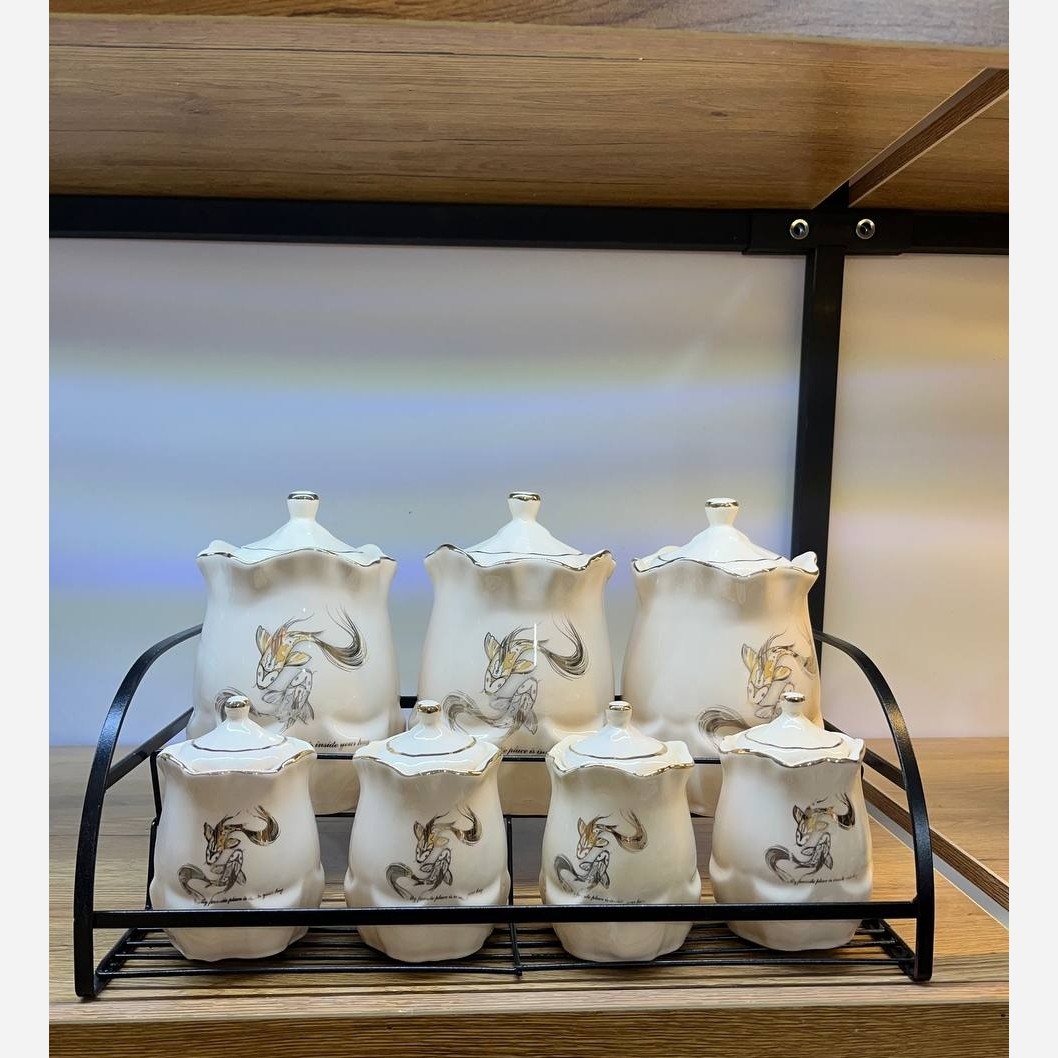 این سرویس هفت پارچه شامل 3 عدد بانکه و چهار عدد جا ادویه به همراه استند فلزی میباشد