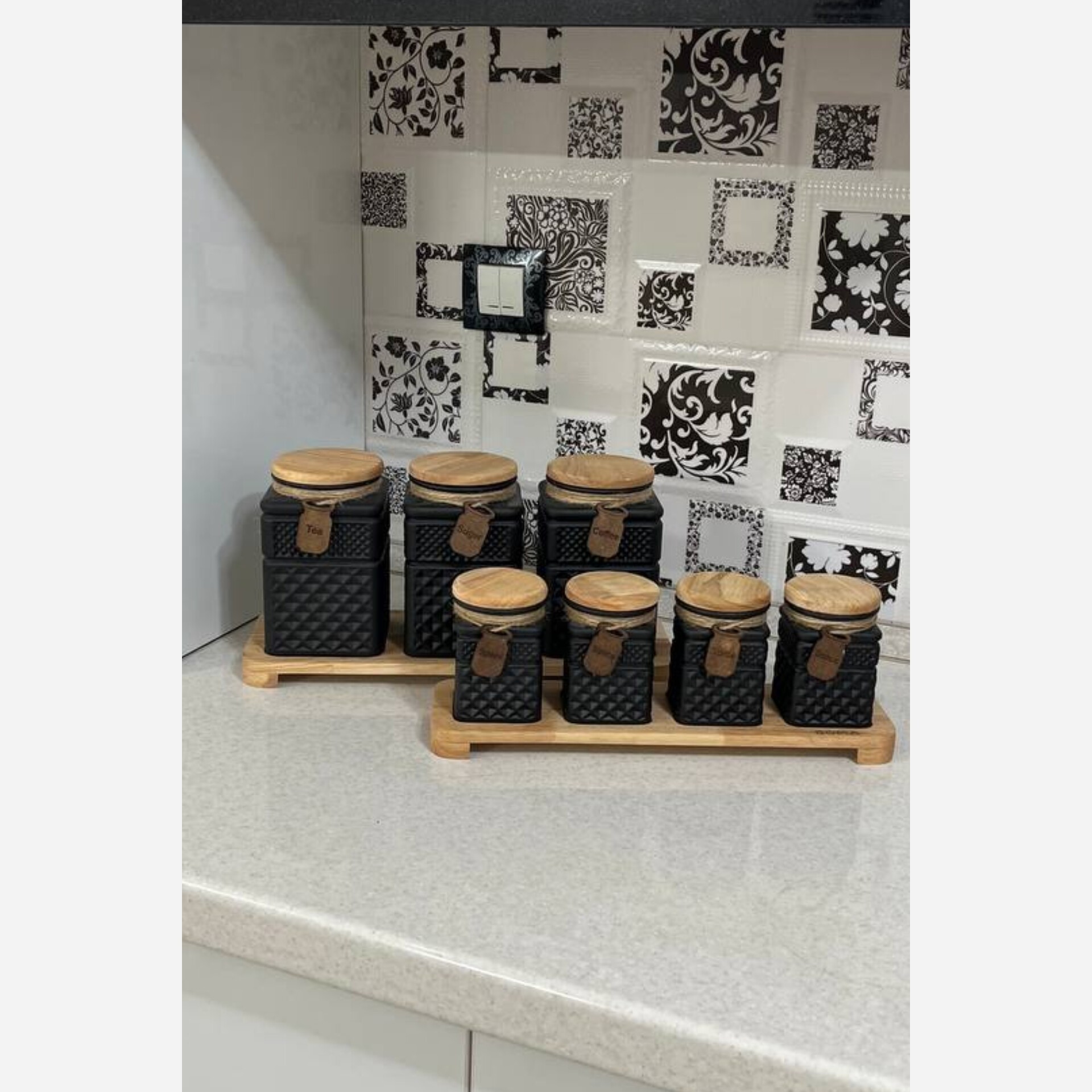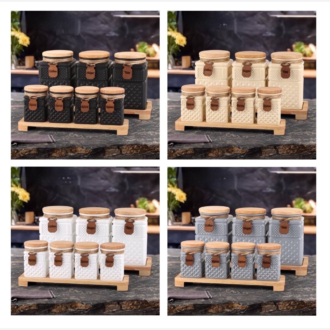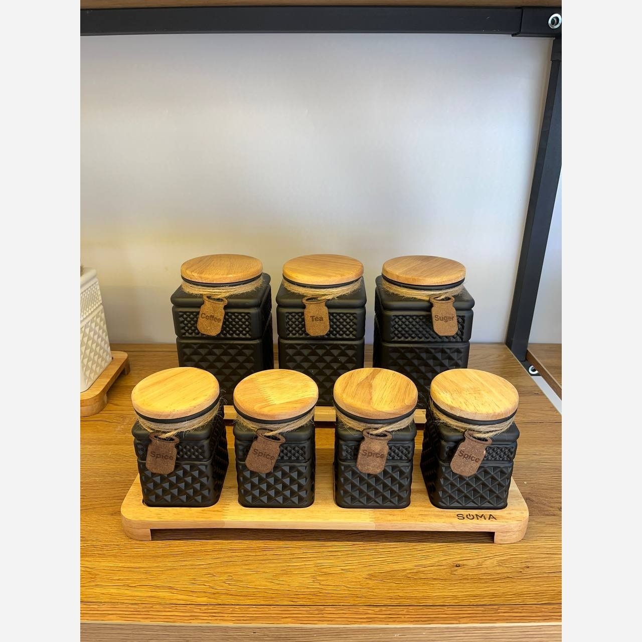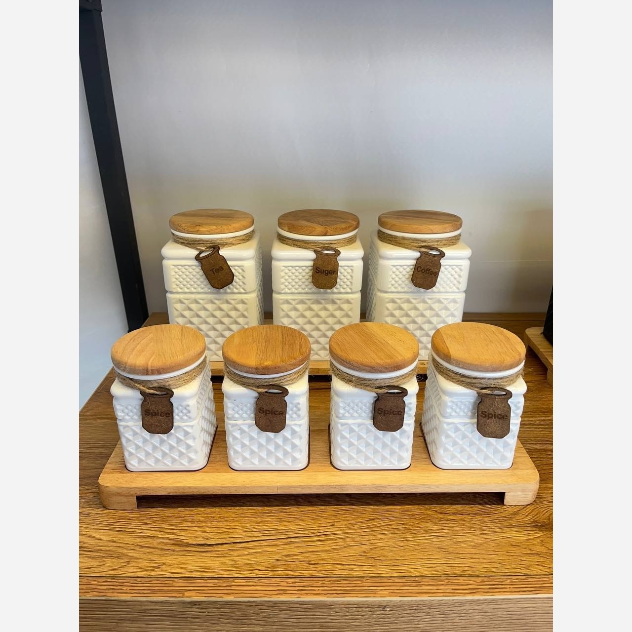 این سرویس هفت پارچه شامل 3 عدد بانکه و چهار عدد جا ادویه به همراه استند چوبی میباشد