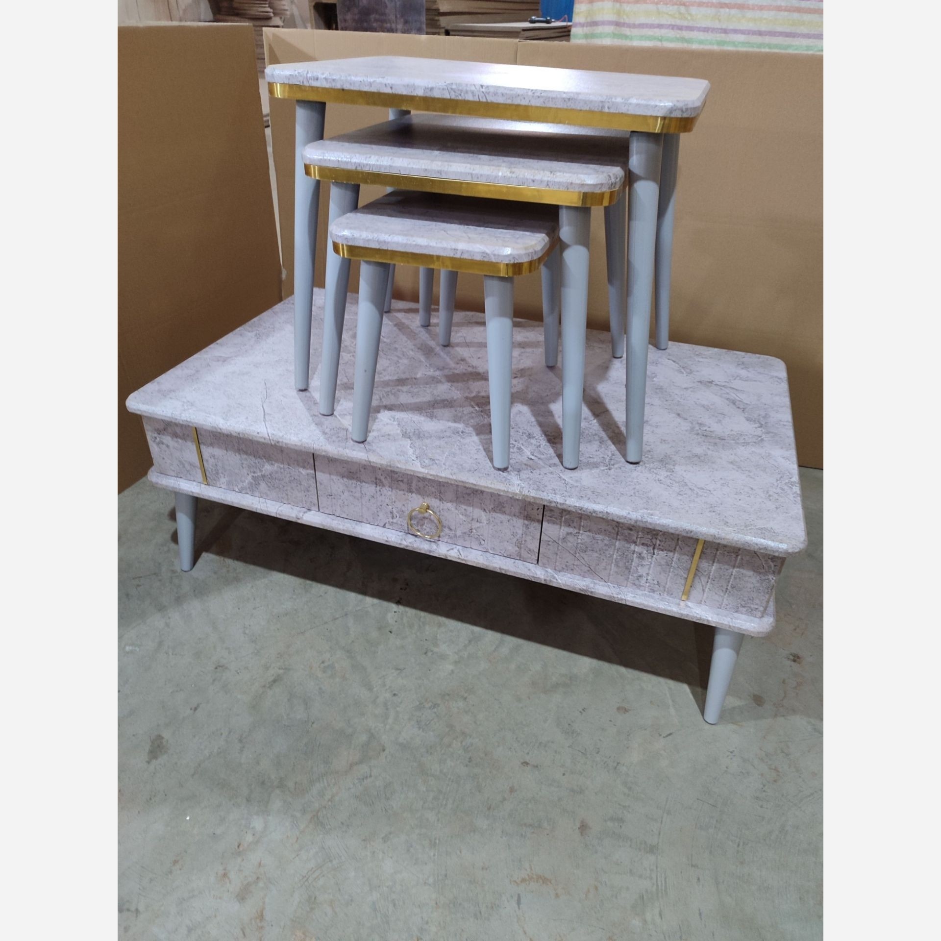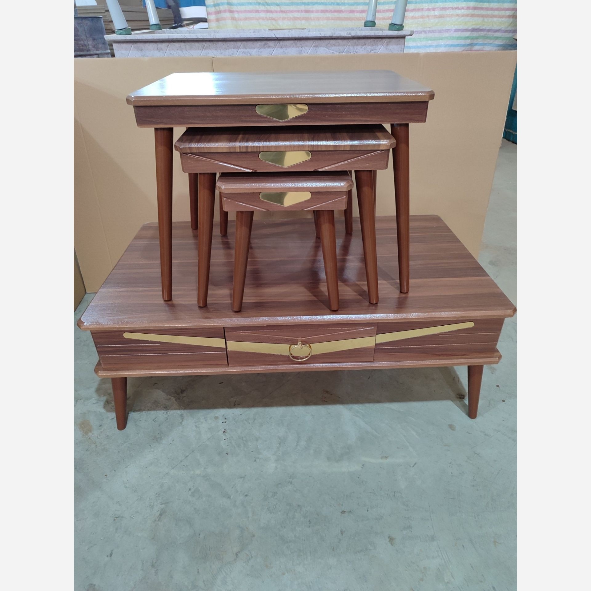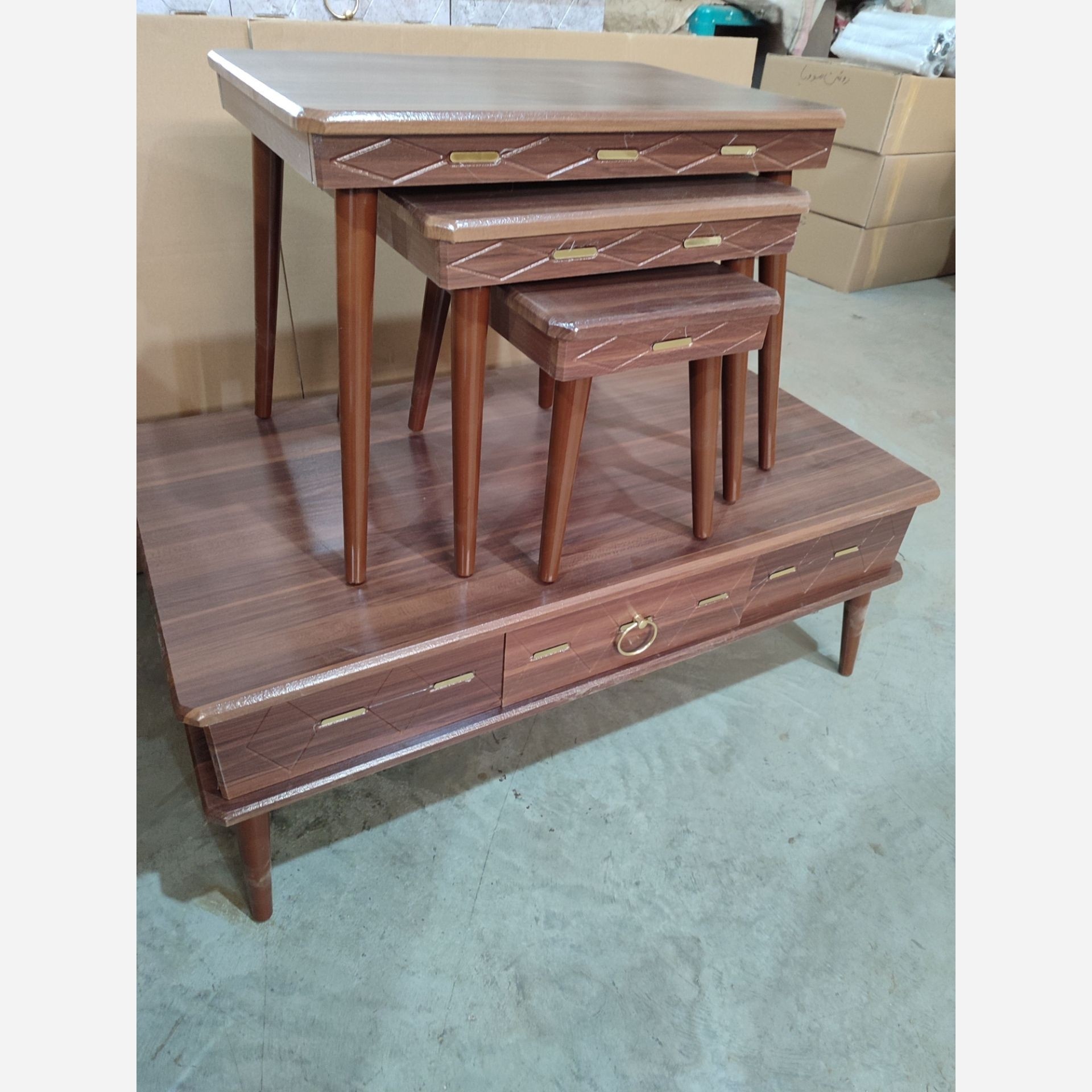 میز جلو مبلی به همراه سه عدد عسلی کشودار جنس چوب ام دی اف روکش وکیوم شده ضد خش به هیچ عنوان باد نمیکنه رنگ بندی به انتخاب مشتری ارسال به تمام نقاط کشور
