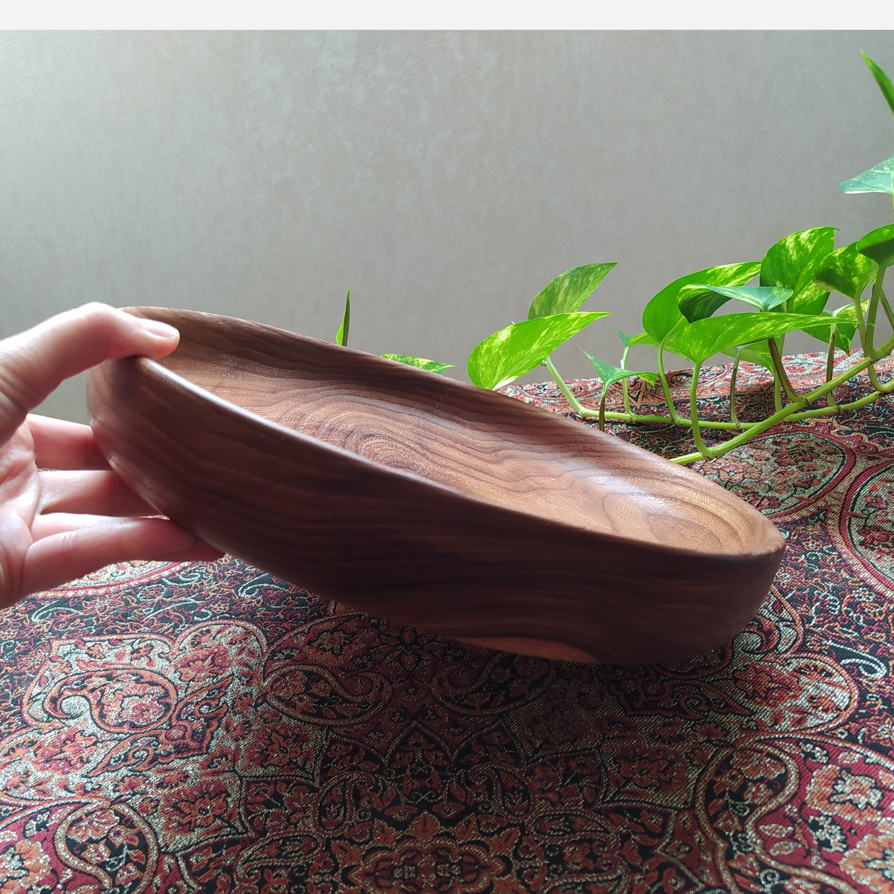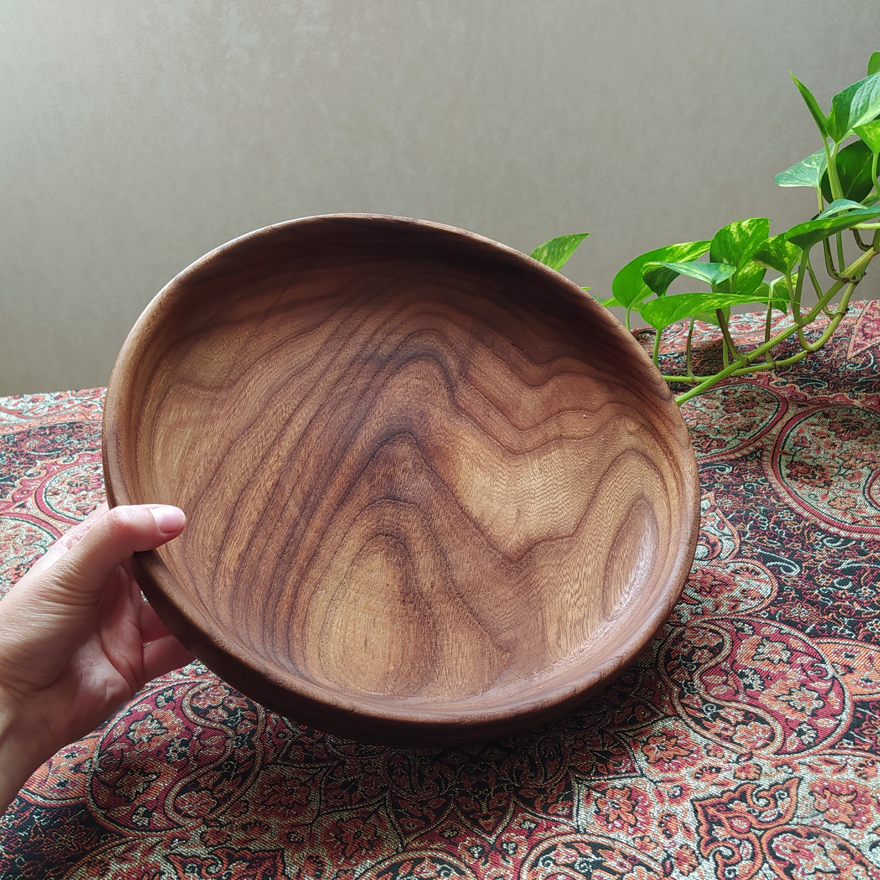 کاسه چوبی خراطی شده قطر 28 سانت و ارتفاع 5 سانت دارای پوشش ضد آب با روغن گیاهی قابل شستشو با دست مناسب برای سالاد ، میوه و....